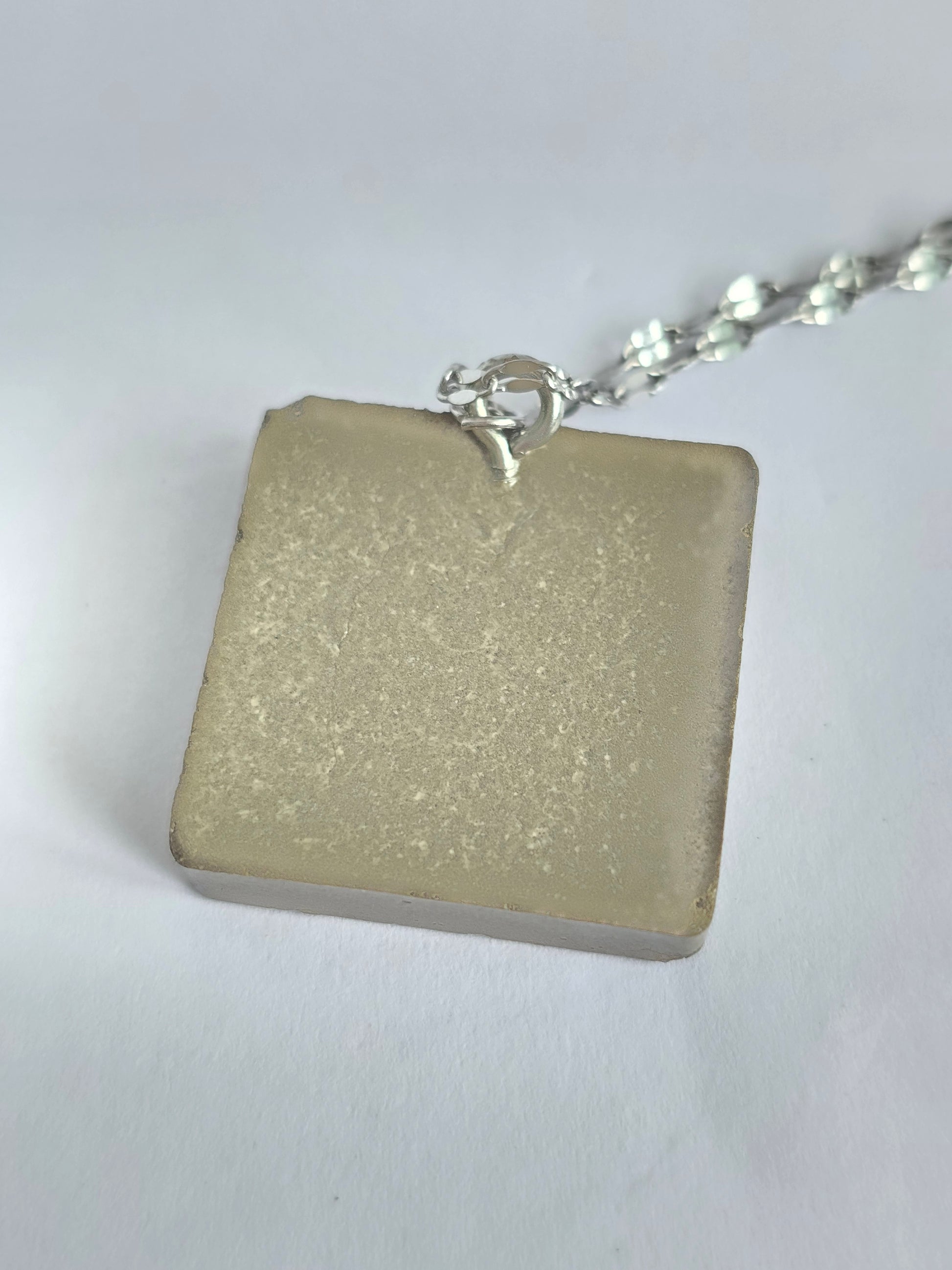 Colgante en forma de cuadro hecho en cemento, con un cactus pintado a mano y una delicada flor. Un diseño sencillo, hermoso y lleno de encanto natural. Cadena en acero inoxidable, resistente y lista para el uso diario. Ideal para quienes aman lo minimalista y lo artesanal.