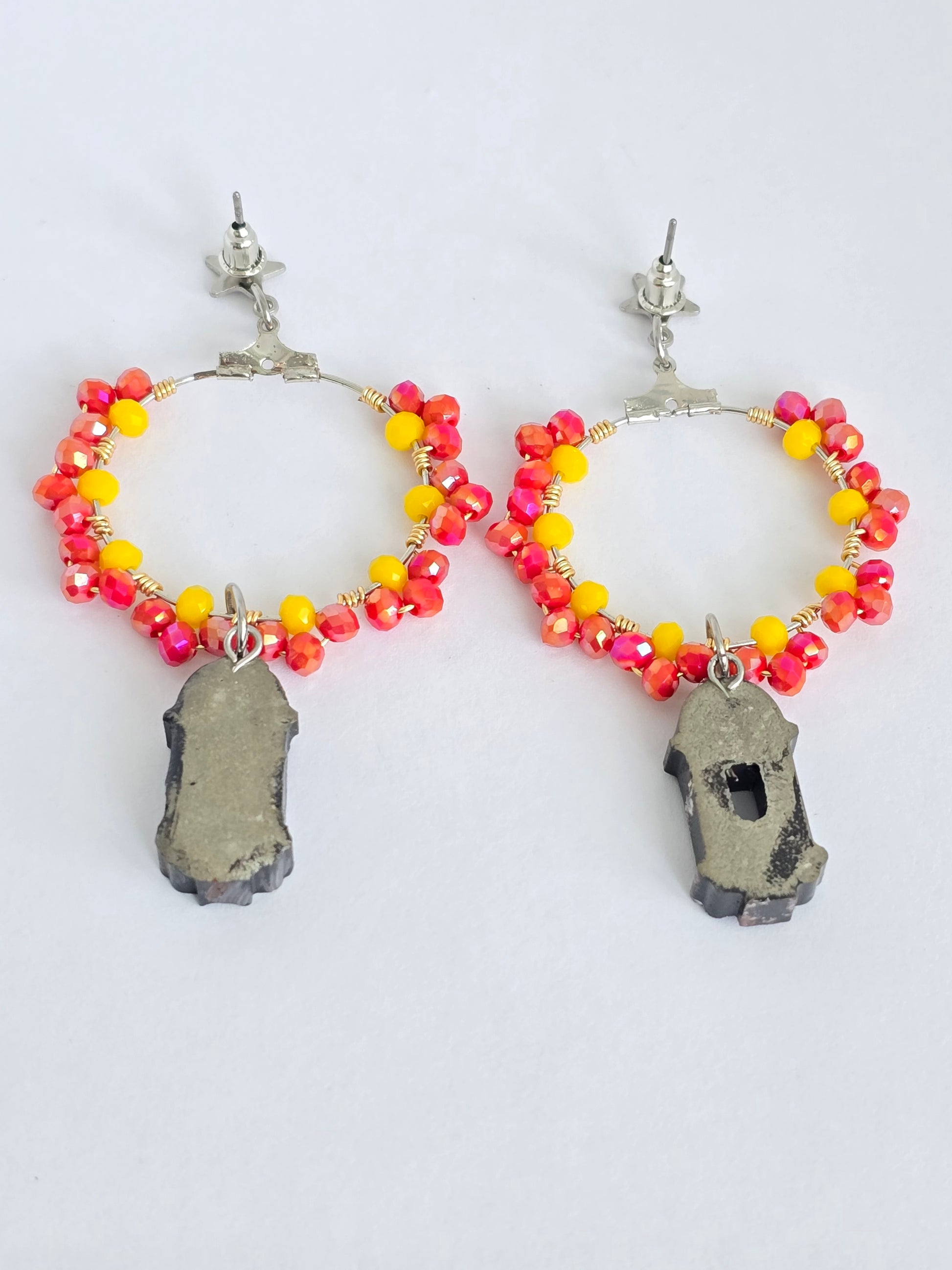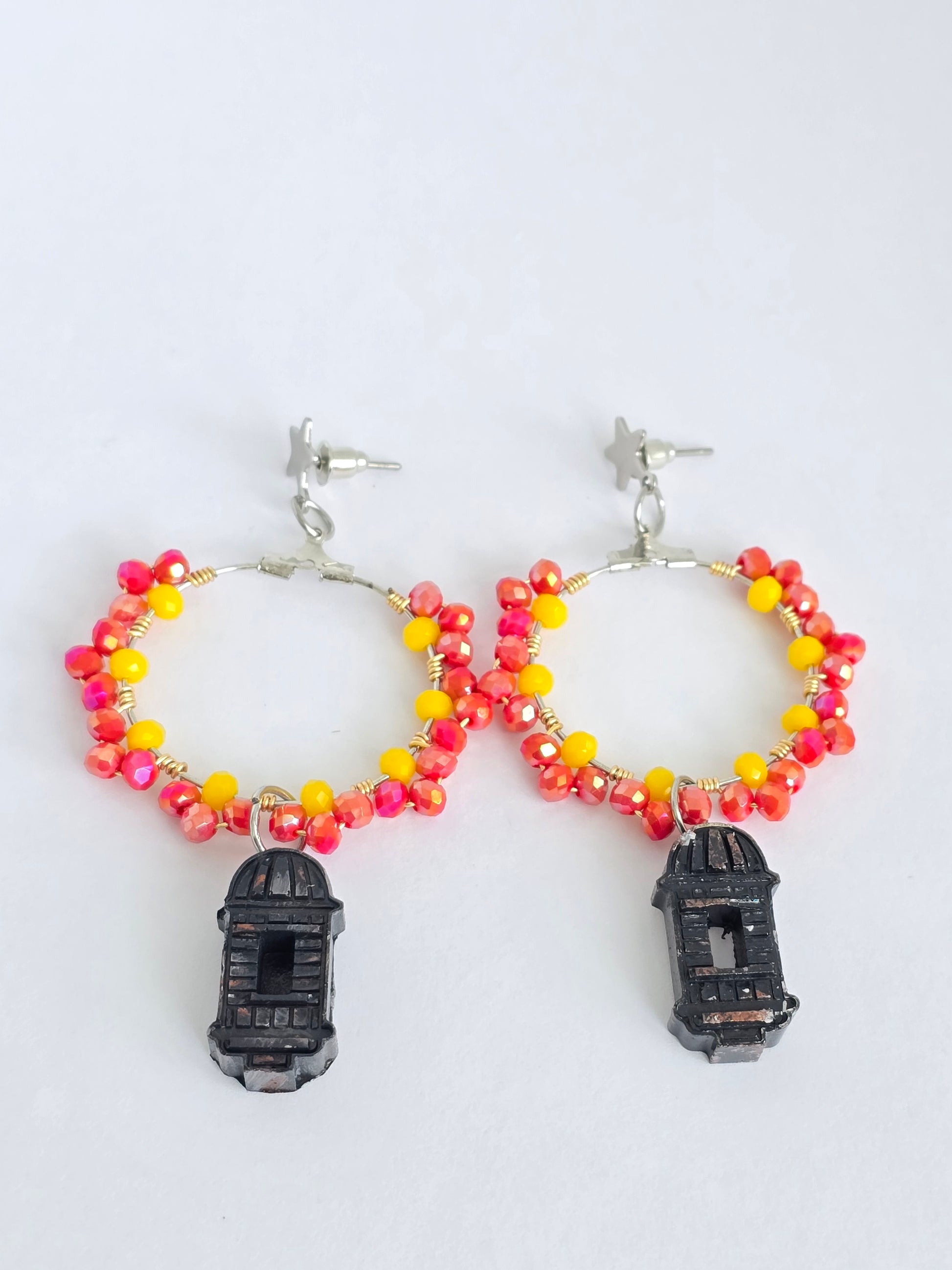 Una versión con contraste encantador. Estas pantallas mantienen el diseño original del círculo alambrado a mano con piedritas rojas y amarillas que representan una amapola, pero en esta ocasión, el círculo es más pequeño, dejando protagonismo a una garita más grande hecha en cemento, llena de detalle y presencia. Una combinación que resalta lo artesanal y lo cultural en perfecta armonía. Montadas en ganchos de acero inoxidable, ideales para quienes buscan piezas únicas, ligeras y con historia.