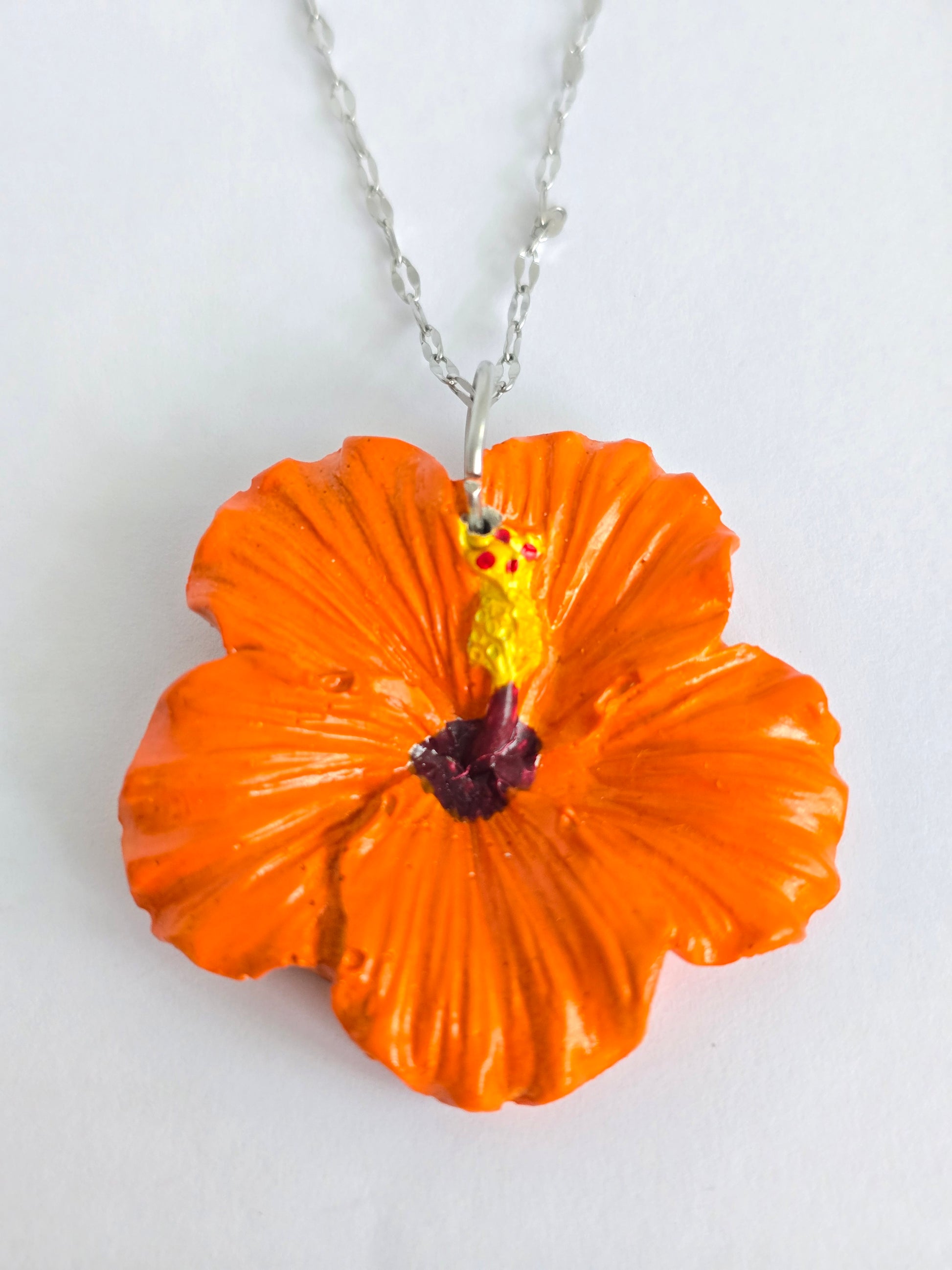 Colgante en forma de amapola grande, hecho en cemento y pintado a mano en un vibrante tono naranja. Cadena en acero inoxidable, resistente y cómoda para el uso diario. Una joya artesanal que irradia energía y creatividad.