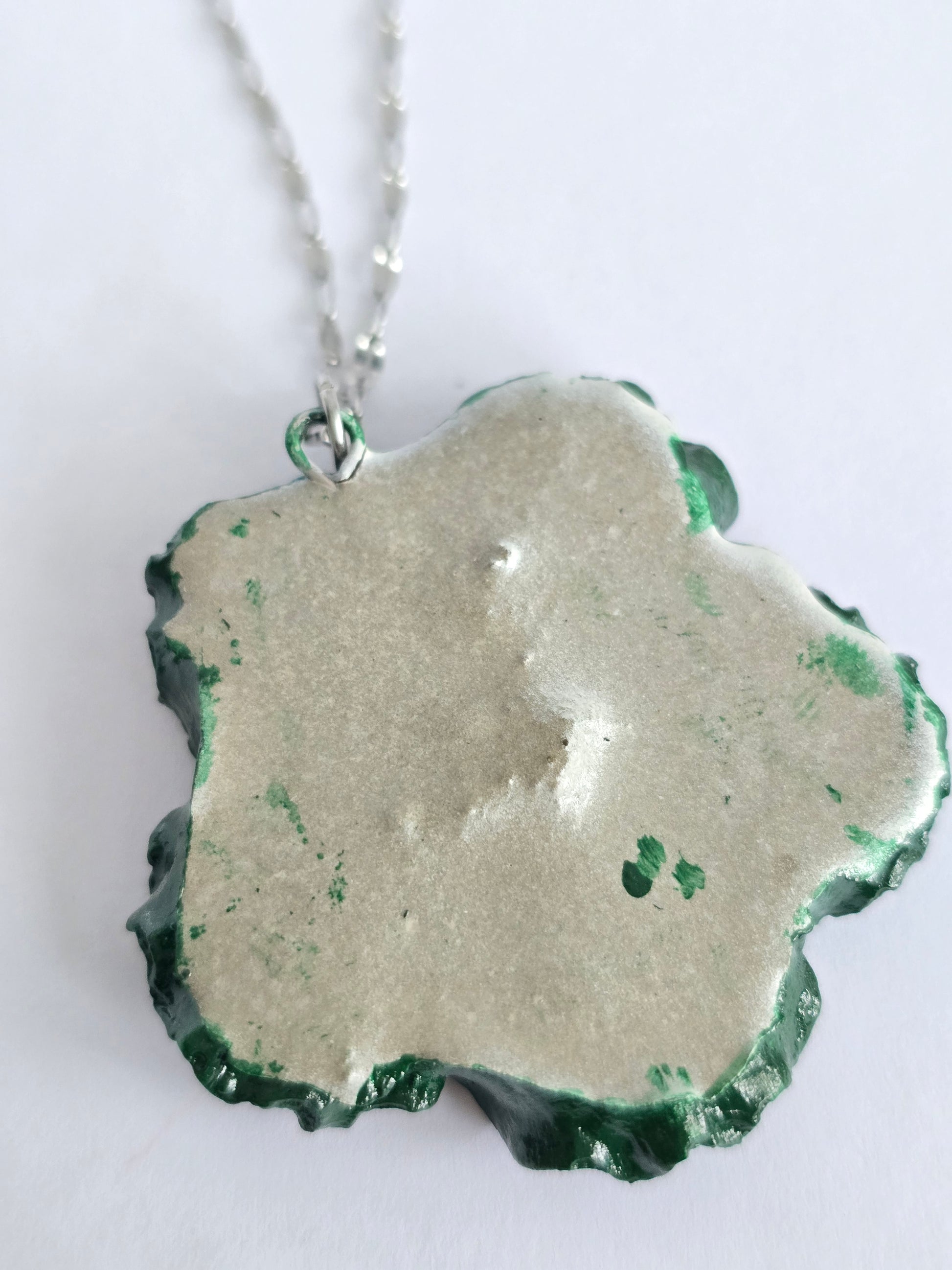 Colgante en forma de amapola grande, elaborado en cemento y pintado a mano en un tono verde intenso. Cadena en acero inoxidable, ideal para el uso diario. Una pieza fresca y única, perfecta para quienes aman lo natural y diferente.