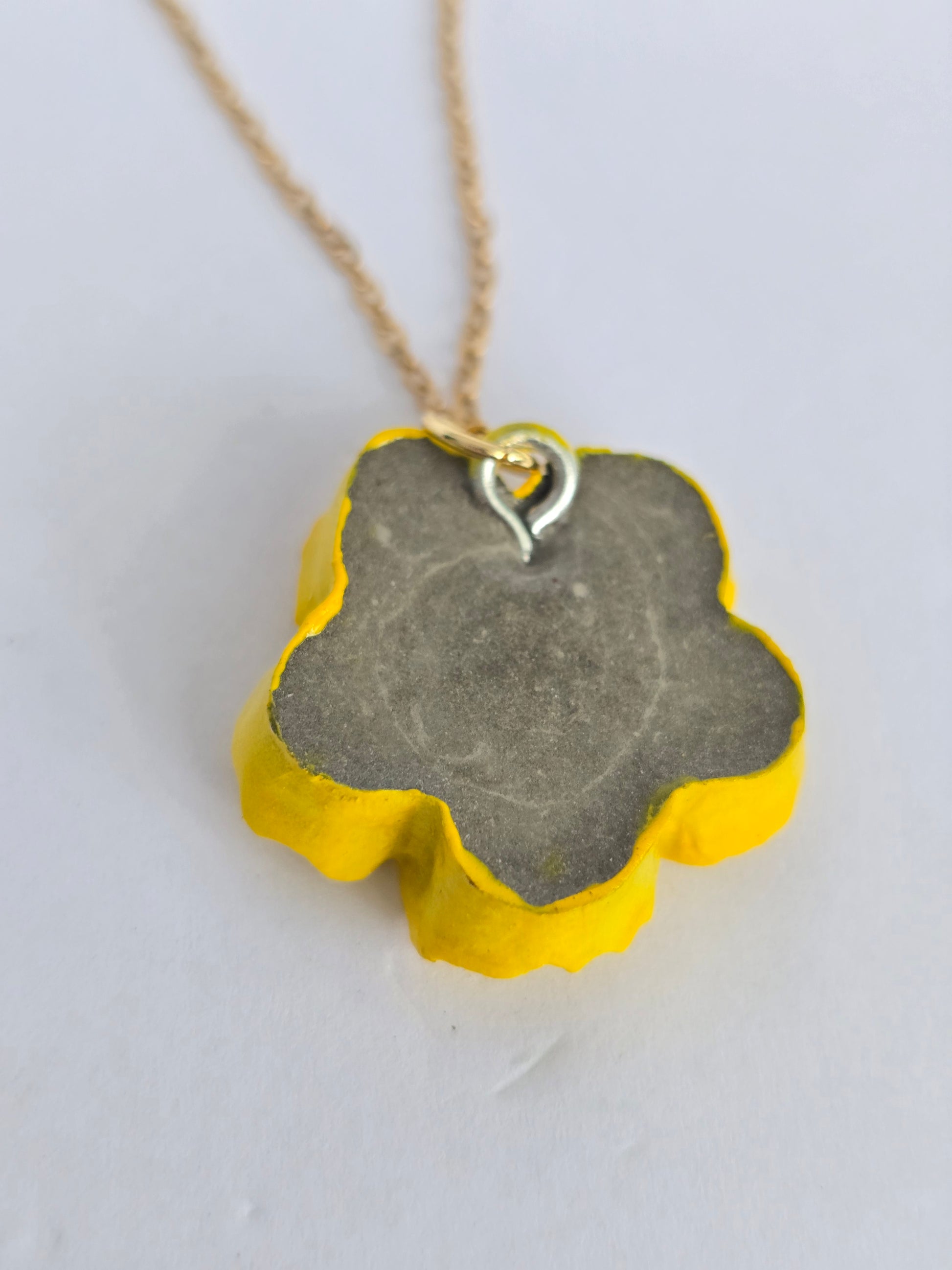 Colgante en forma de amapola, hecho en cemento y pintado a mano en un brillante tono amarillo. Cadena en acero inoxidable, resistente y lista para el uso diario. Una pieza alegre y artesanal que transmite luz y energía.