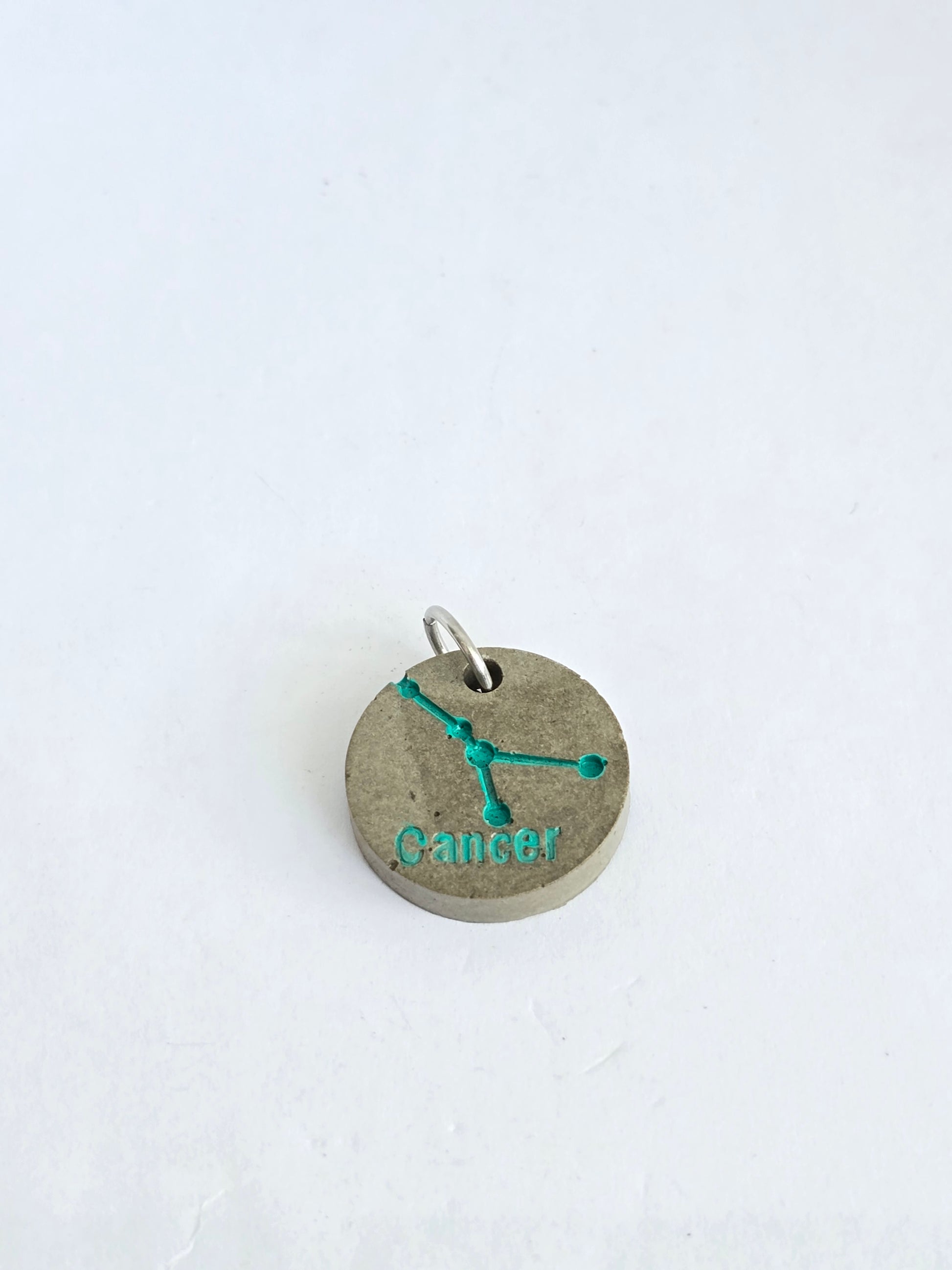 Charm del signo Cáncer, moldeado en cemento y pintado a mano en tono aqua. Un diseño con significado personal, perfecto para representar tu energía zodiacal en collares, pulseras o llaveros.