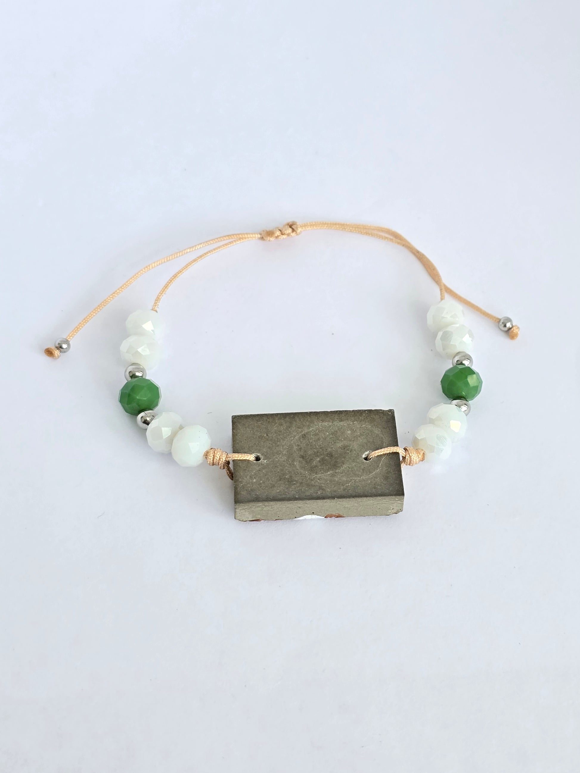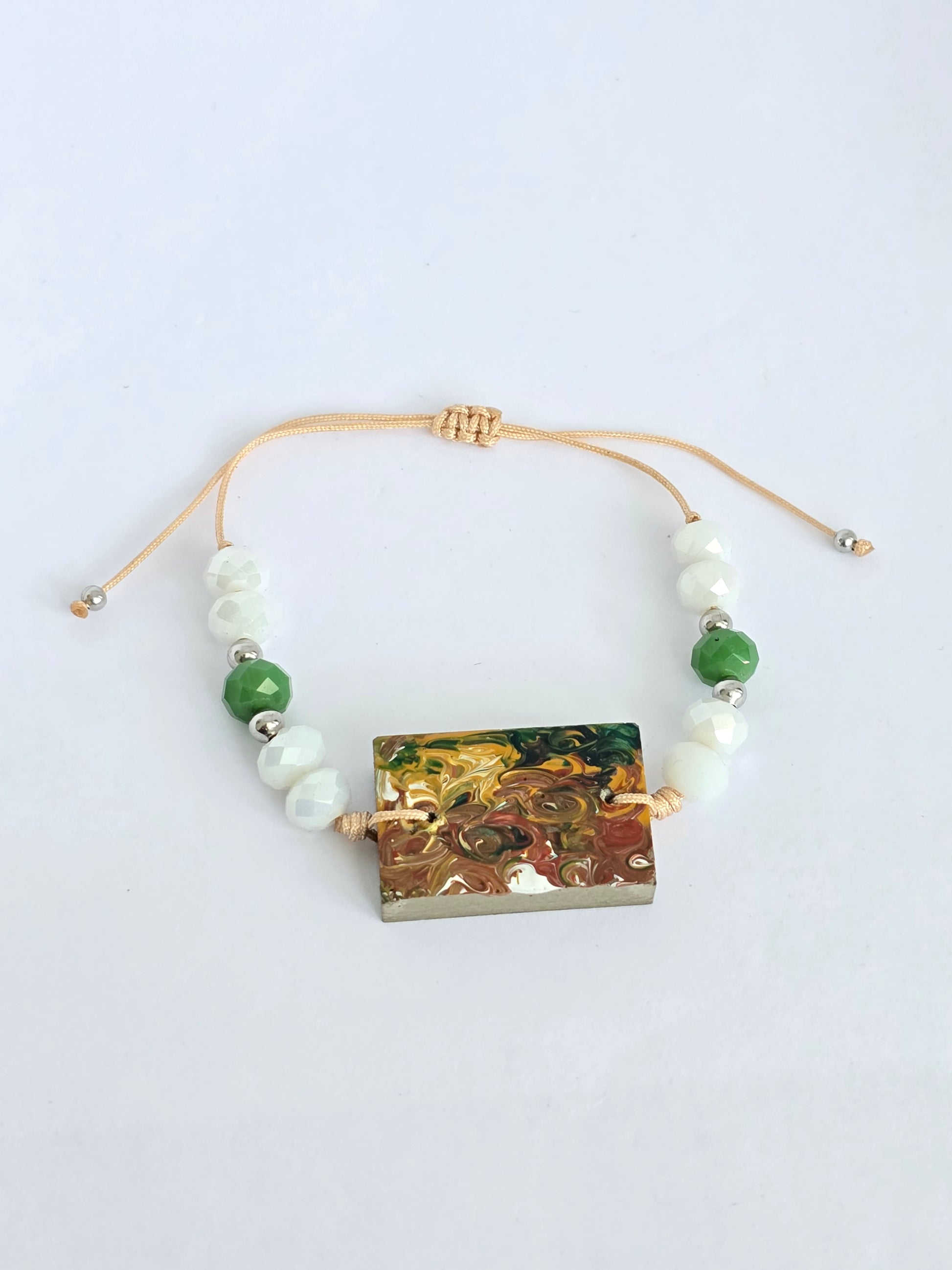 Pulsera ajustable en hilo color crema, suave y versátil, adornada con cristales rondeles que aportan brillo delicado. Al centro, un conector rectangular en cemento, pintado a mano con una mezcla de colores vibrantes que se fusionan como una pequeña obra de arte única e irrepetible.