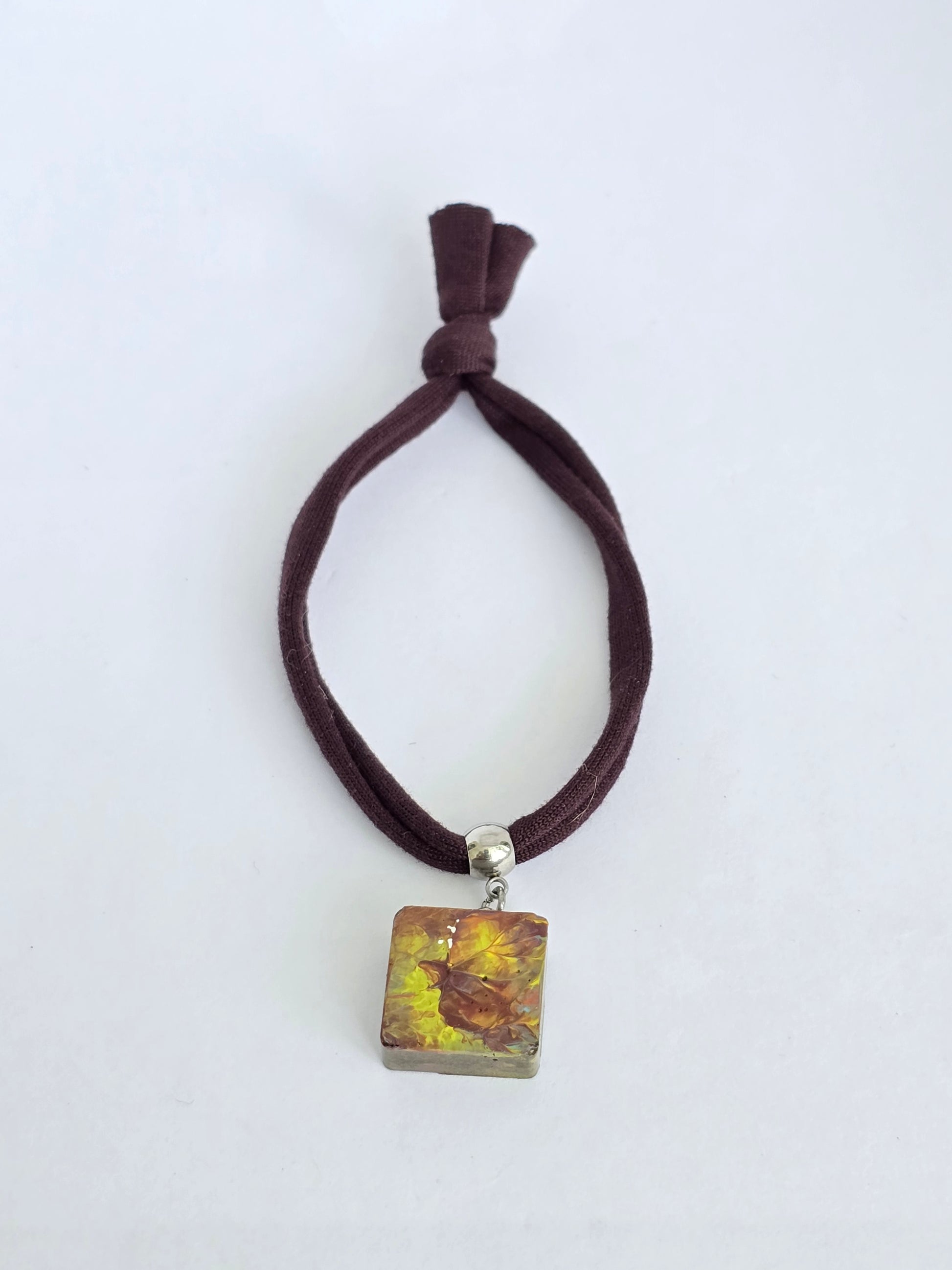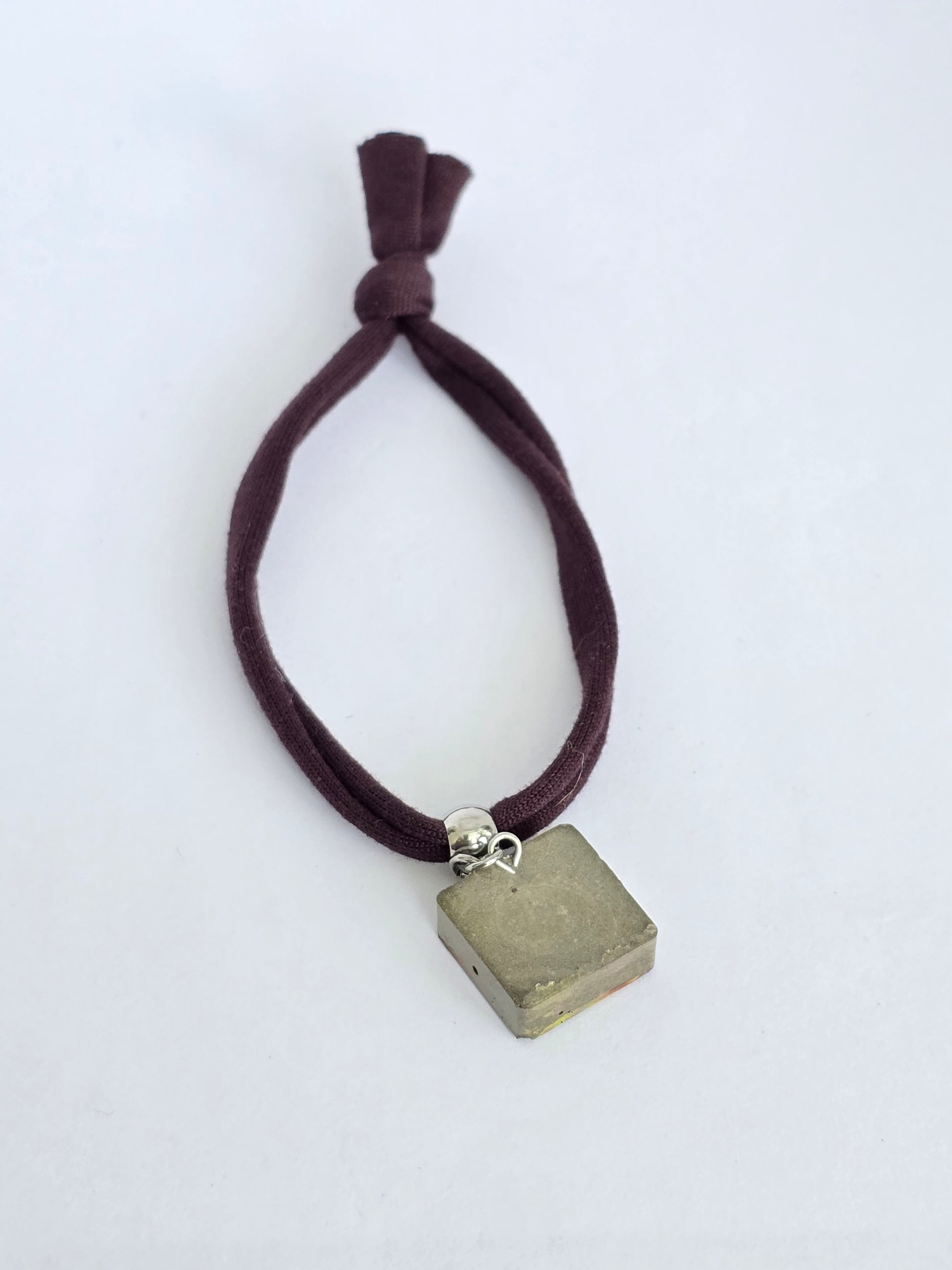 Pulsera ajustable en hilo marrón, sencilla y con un toque cálido. Al centro, un charm cuadrado en cemento pintado a mano con varios colores, creando un diseño artístico y expresivo que hace de cada pieza algo único.