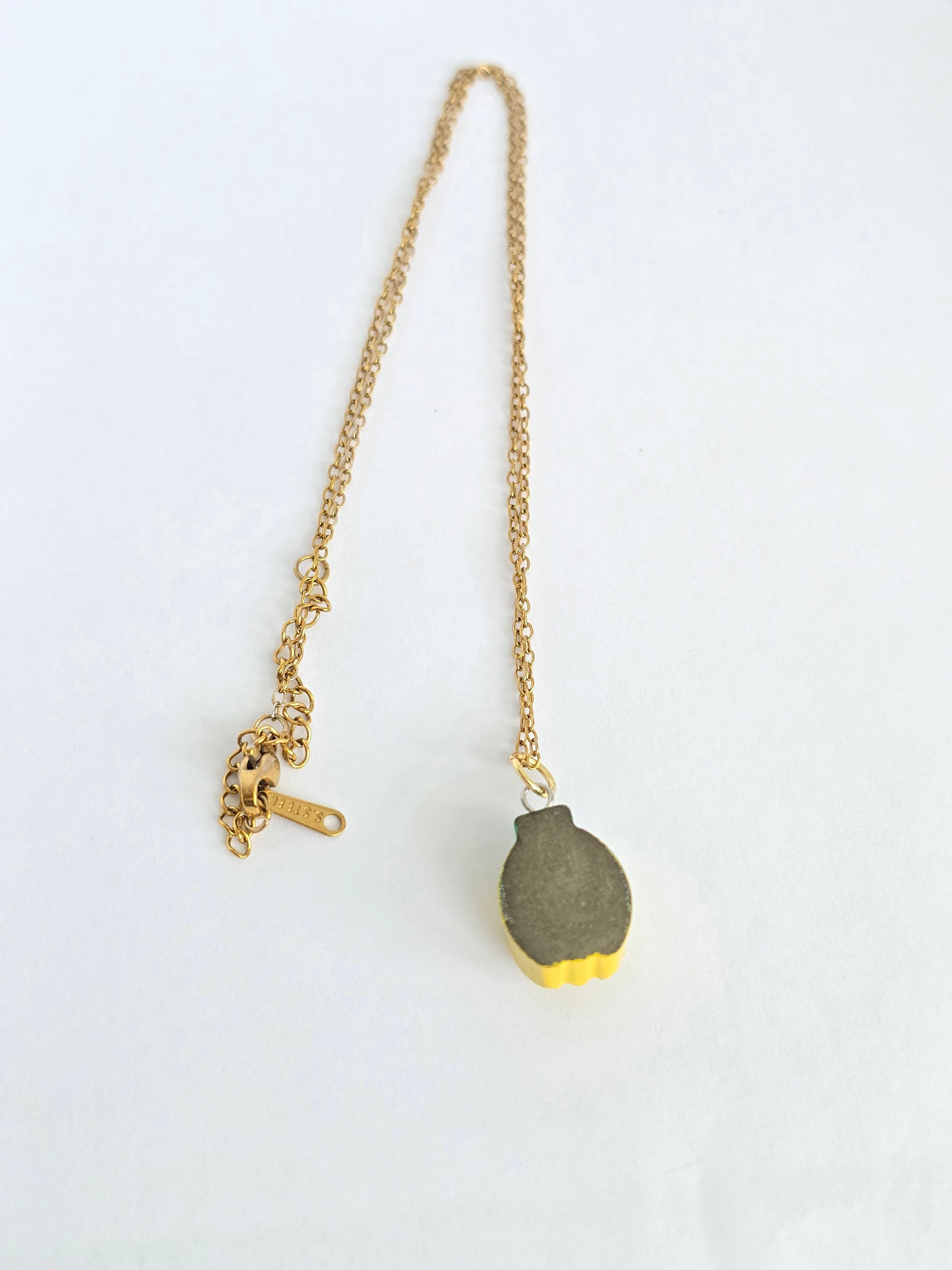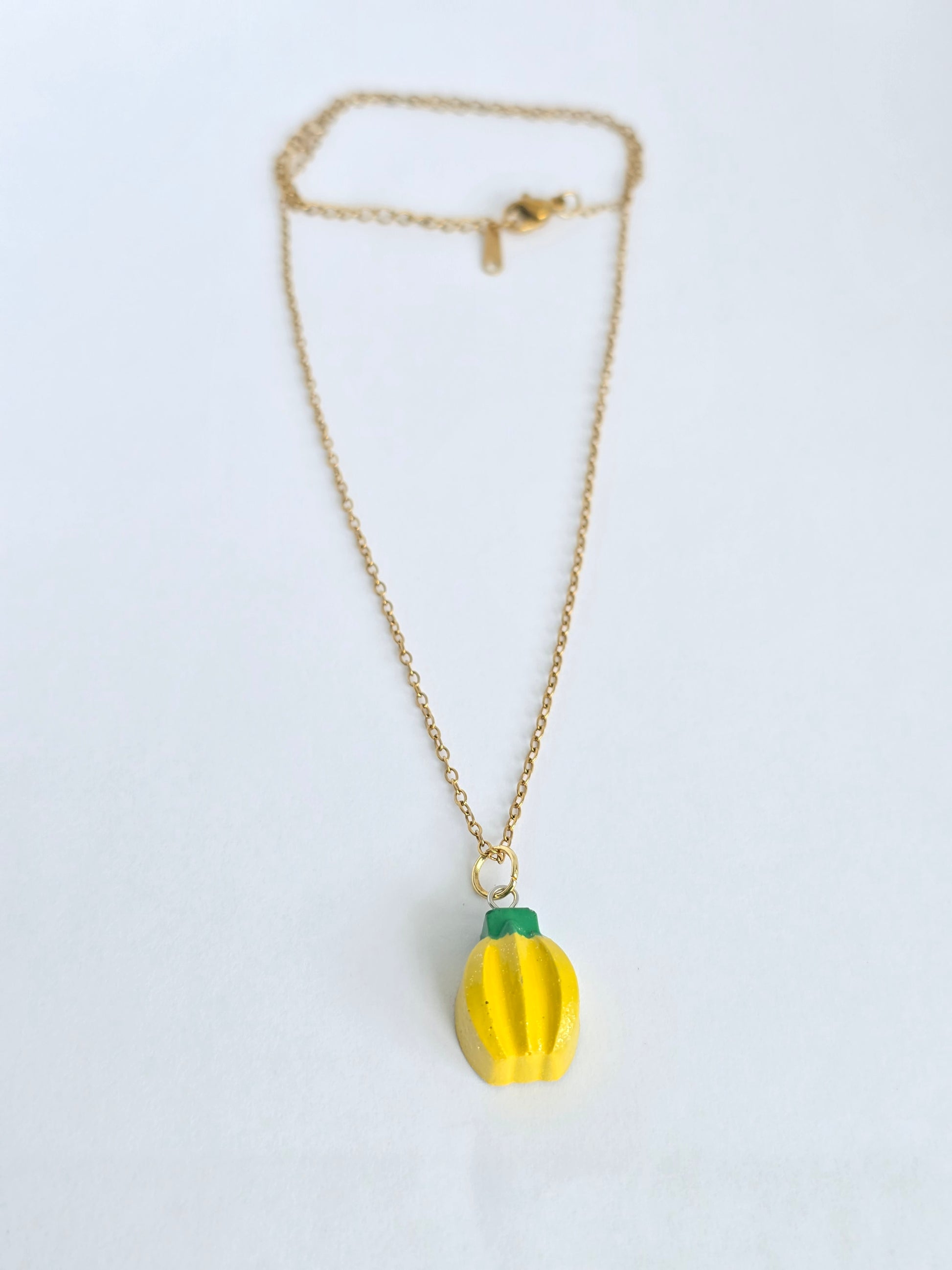 Un diseño divertido y tropical con charm de guineo en cemento y pintada a mano decorado con un sutil toque de brillo. Montado en una cadena sencilla de acero inoxidable, es perfecto para añadir un guiño alegre y original a tu look diario.