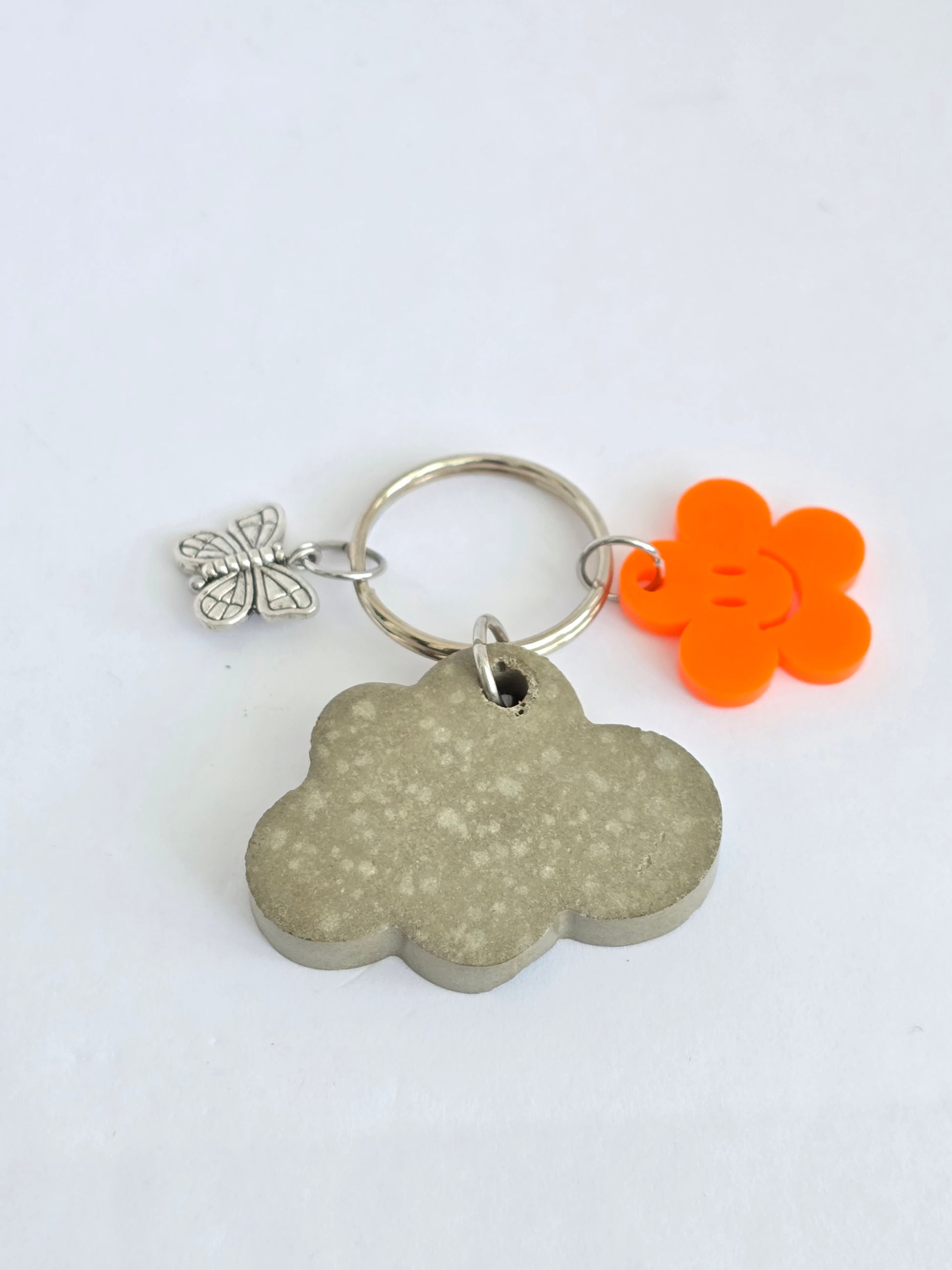 Llavero con una nube hecha en cemento, mezclada con polvo azul sensible a la luz UV que desaparece con el sol, revelando su textura natural. Incluye dos charms decorativos que completan este diseño único y lleno de personalidad. Una pieza funcional, artística y mágica.
