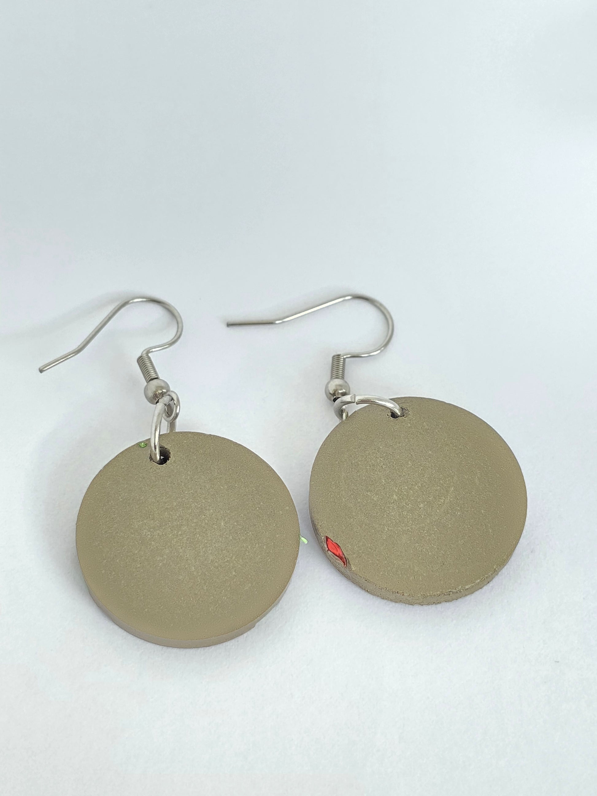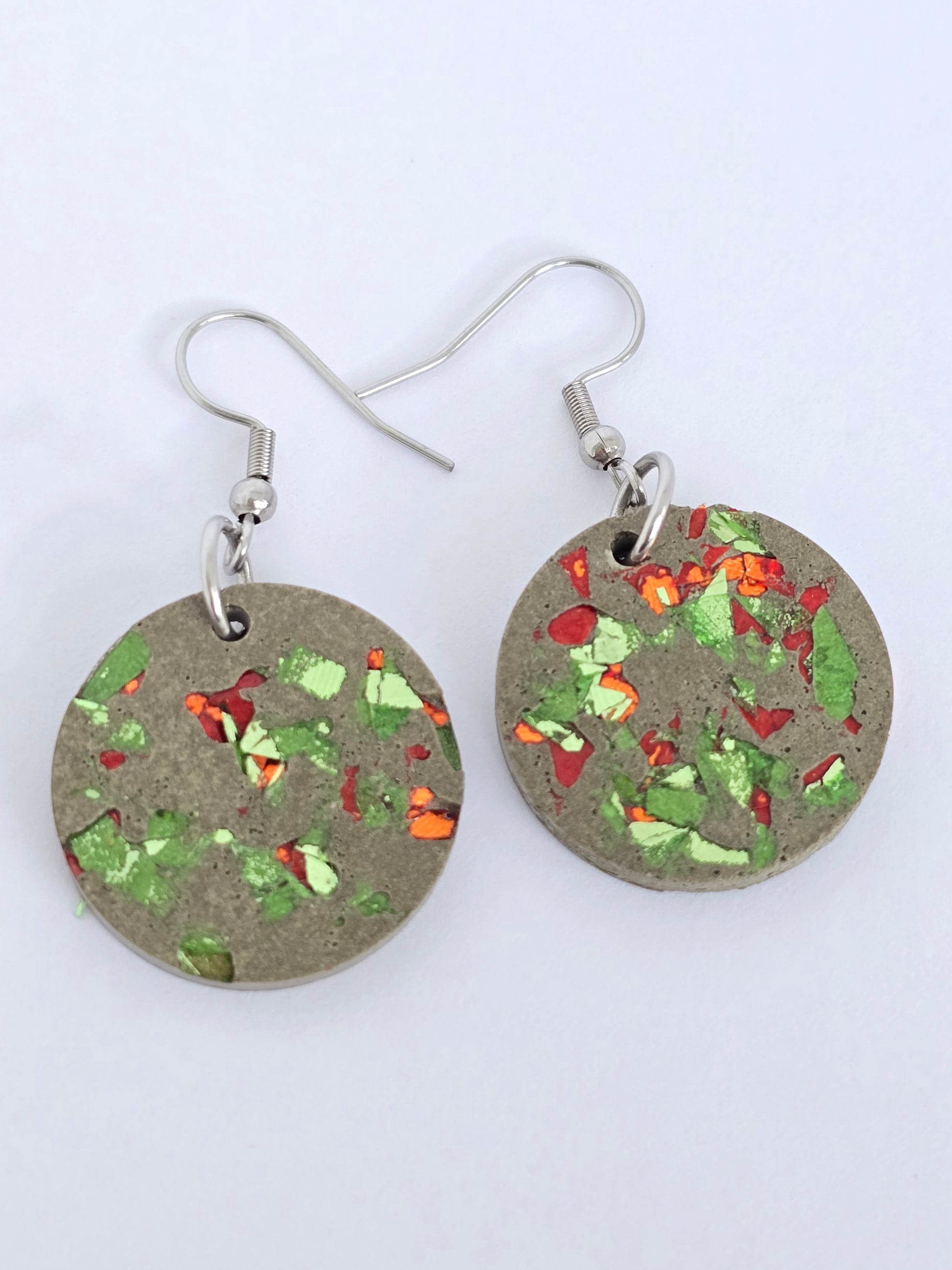Estas pantallas colgantes tienen una base circular de cemento sin pintar, resaltando su acabado natural. En el cemento están incrustados destellos en tonos verde y rojo, que añaden un toque de brillo sutil y moderno. Un diseño elegante, artístico y fuera de lo común, perfecto para quienes aman los detalles que hacen la diferencia. Ligeras, únicas y con ganchos en acero inoxidable, ideales para pieles sensibles.
