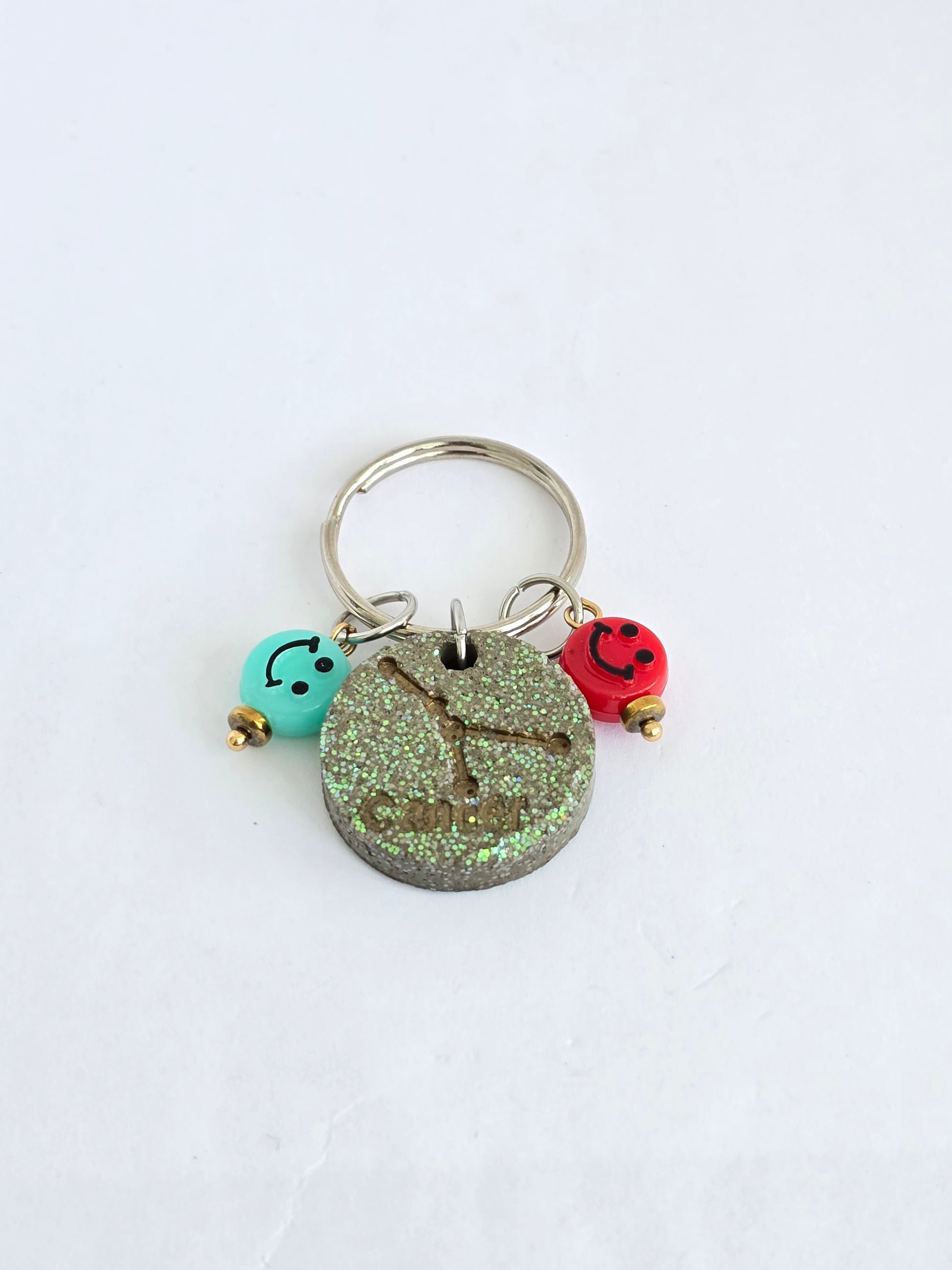 Llavero artesanal con detalle del signo zodiacal Cáncer en cemento, representando la sensibilidad, intuición y fortaleza emocional de este signo. Una pieza única para quienes se identifican con su energía protectora y profunda. Ideal para llevar contigo un toque de tu identidad astrológica.