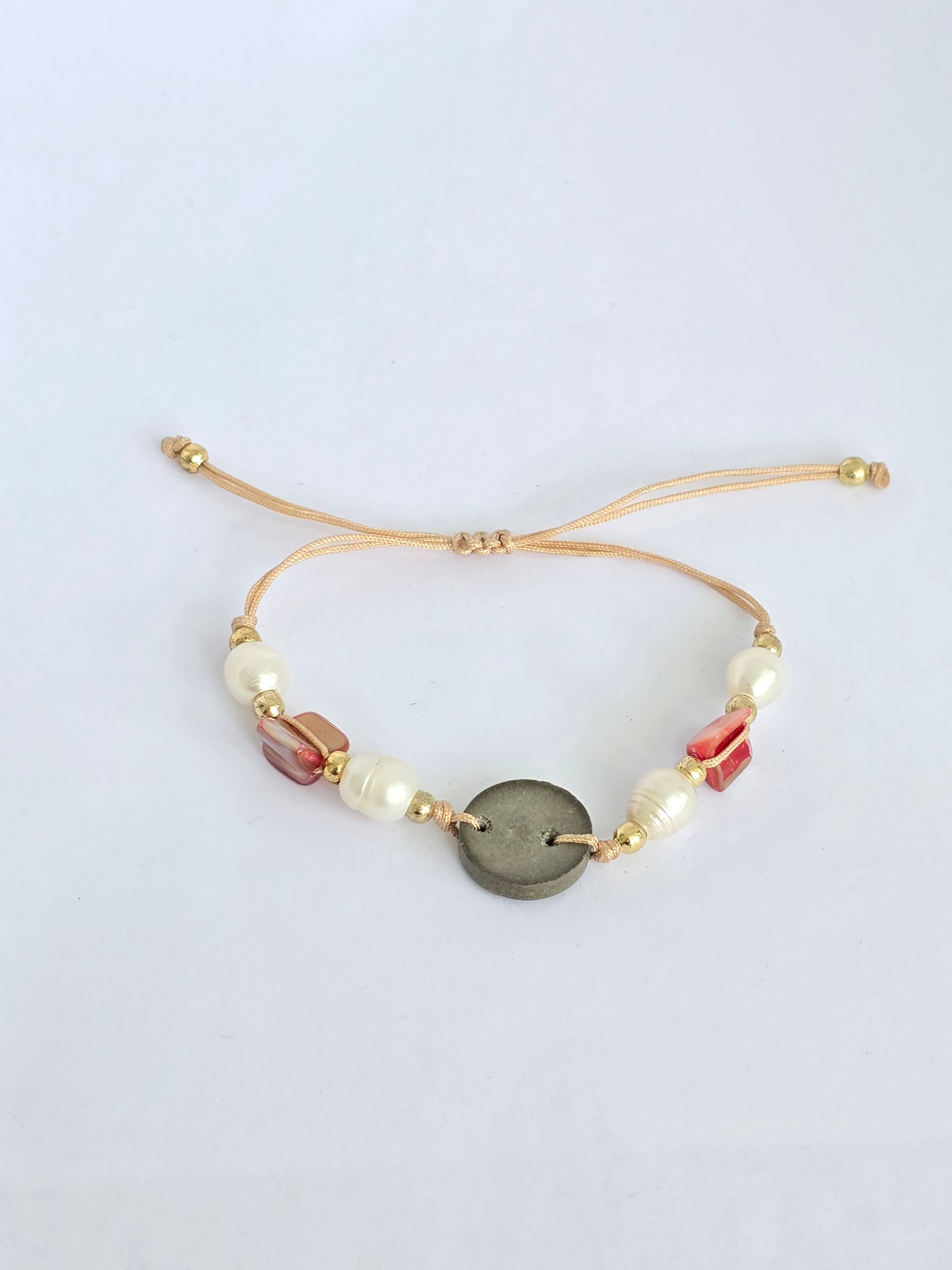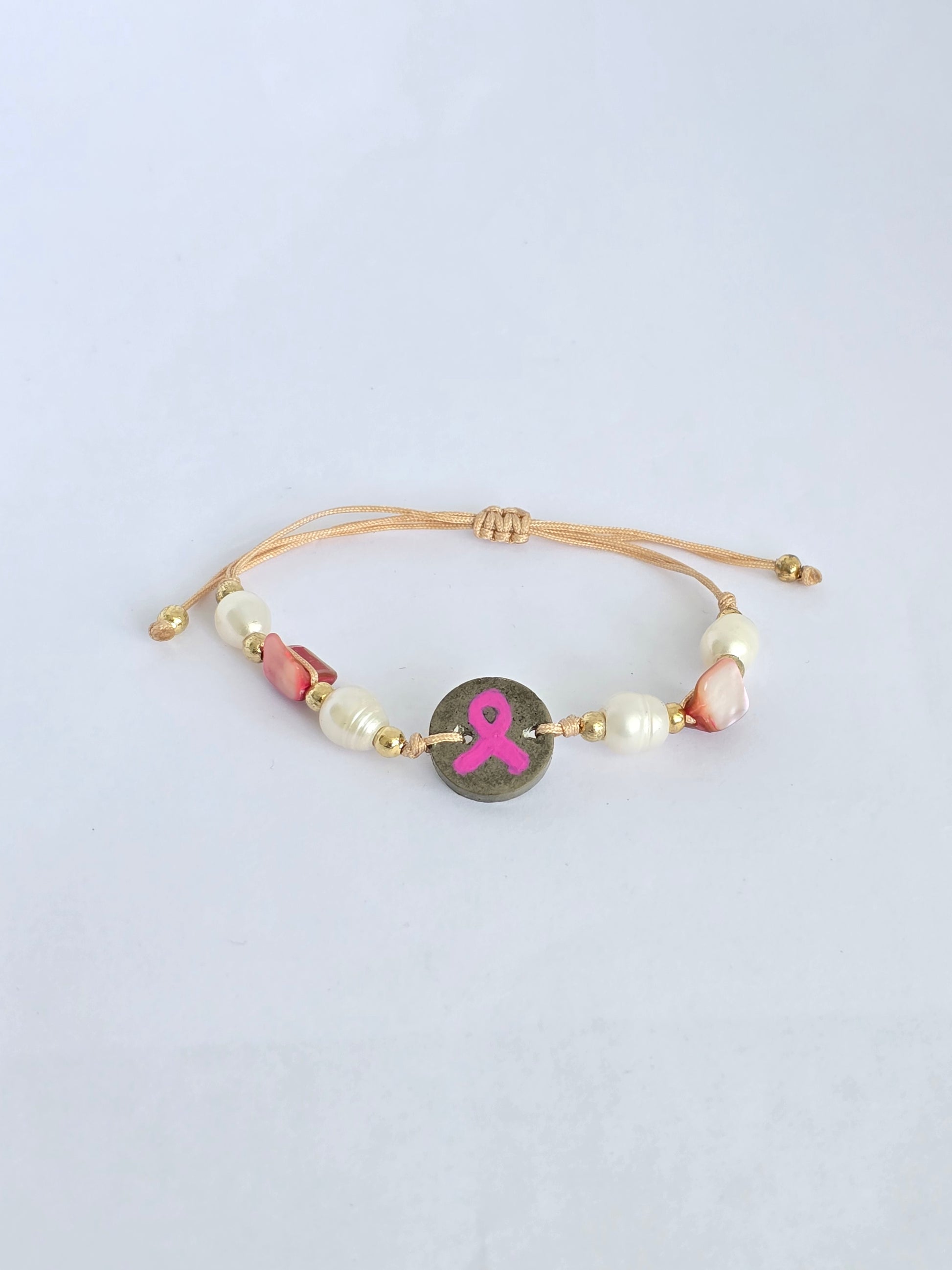 Pulsera en hilo ajustable en tonos suaves, decorada con una perla de agua dulce y detalles en madre perla rosada, que aportan un brillo delicado y elegante. Al centro, una chapa en cemento con el símbolo de breast cancer awareness pintado a mano, representando fortaleza, esperanza y apoyo.