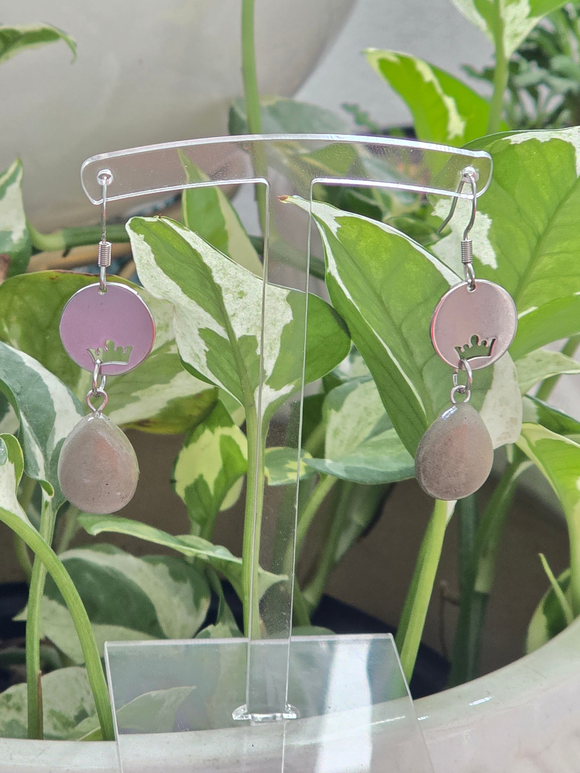 Estos aretes destacan por su equilibrio entre lo rústico y lo sofisticado. Presentan una delicada chapa en acero inoxidable con diseño de corona, de la cual cuelga una pieza ovalada en cemento sin pintar, conservando su tono natural y textura artesanal.