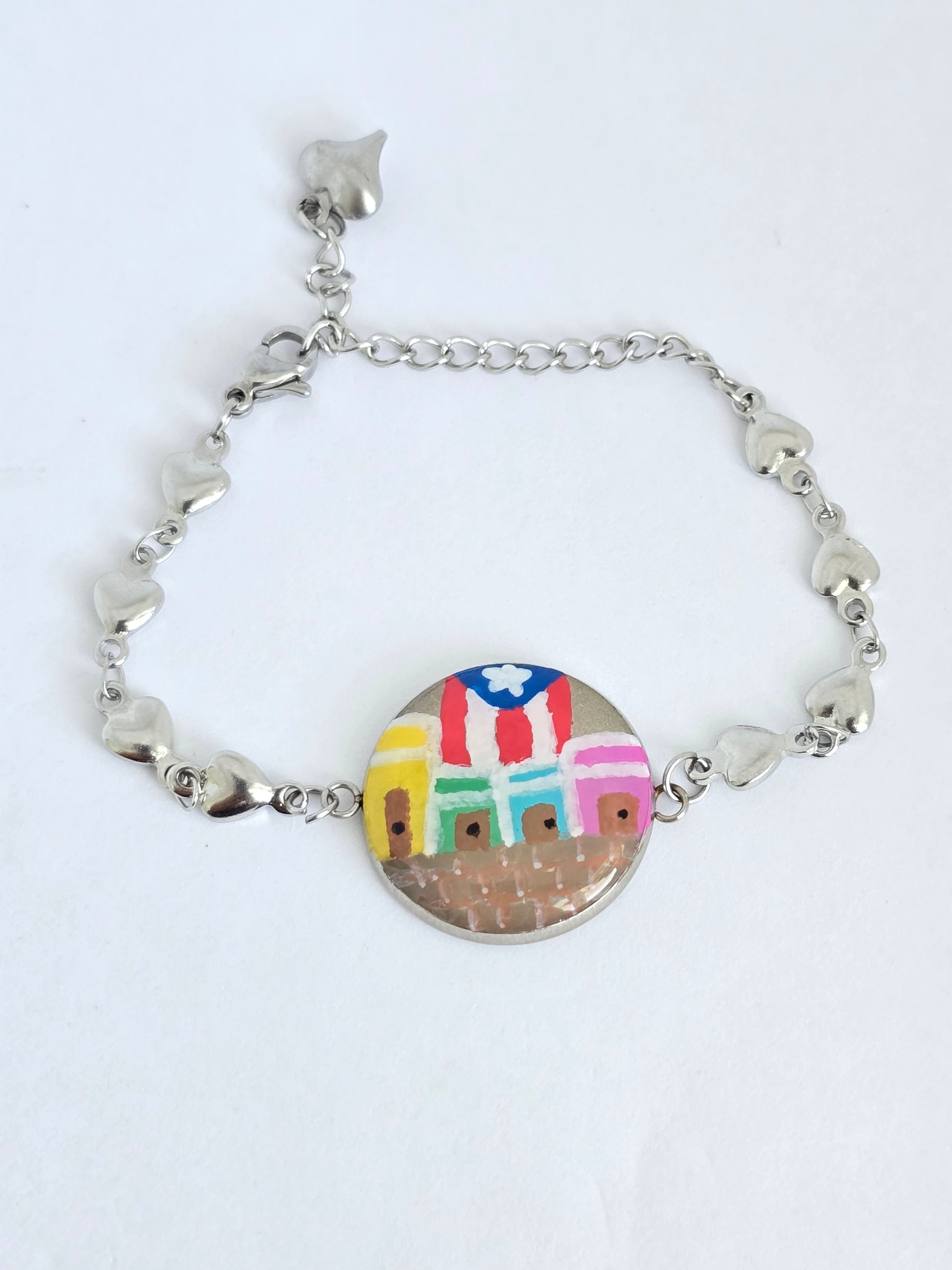 Pulsera en stainless steel con eslabones en forma de corazones que le dan un toque delicado y romántico. Al centro, una chapa rellena de cemento y pintada a mano con las coloridas casitas del Viejo San Juan, capturando la magia de nuestras calles coloniales.