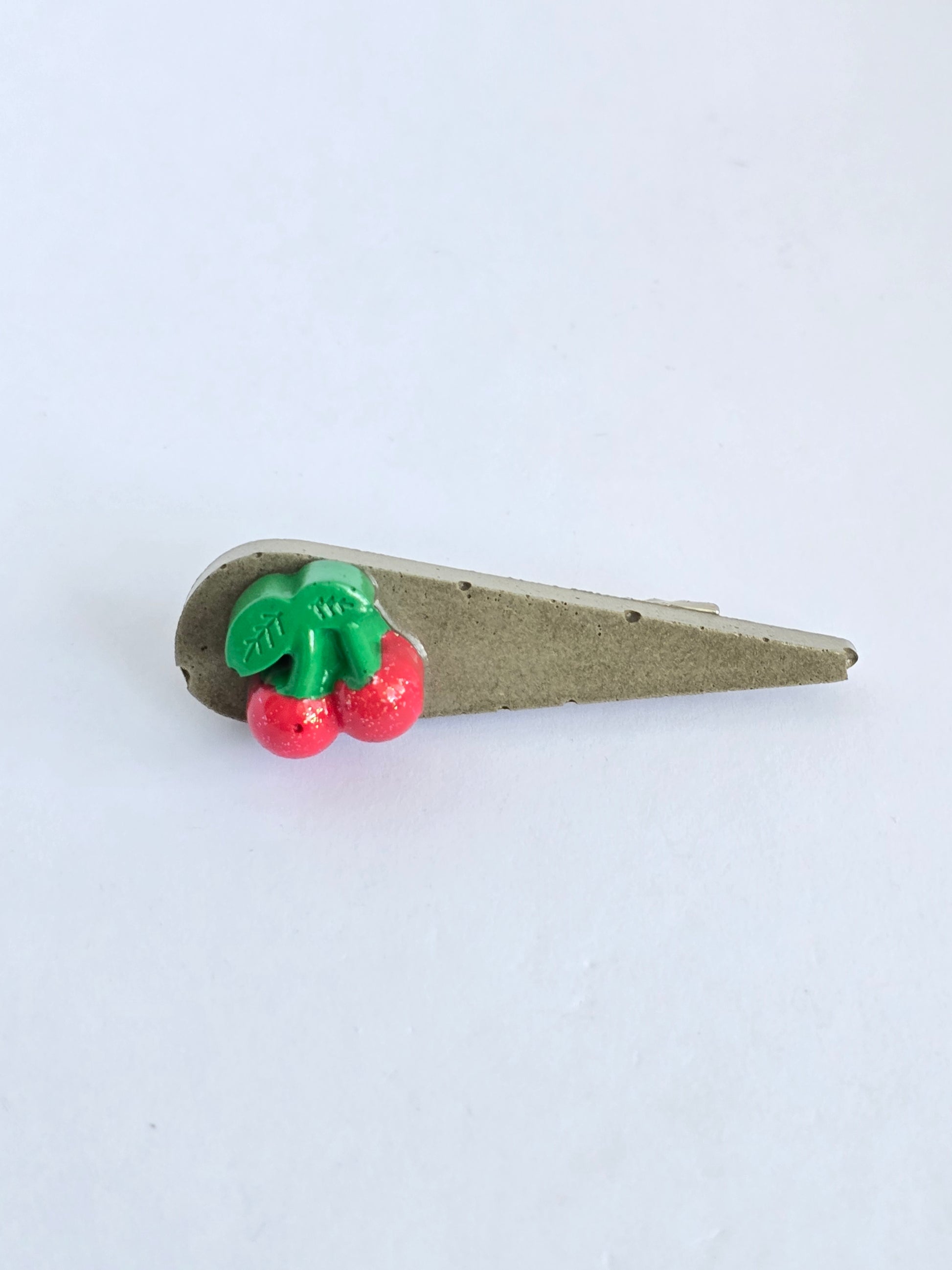 Un pinche de pelo con forma de gota hecho completamente en cemento, decorado con un charm de cherry también en cemento pintado a mano. Una pieza original, divertida y con ese toque único de Cementix. Ideal para añadir personalidad a tu peinado.