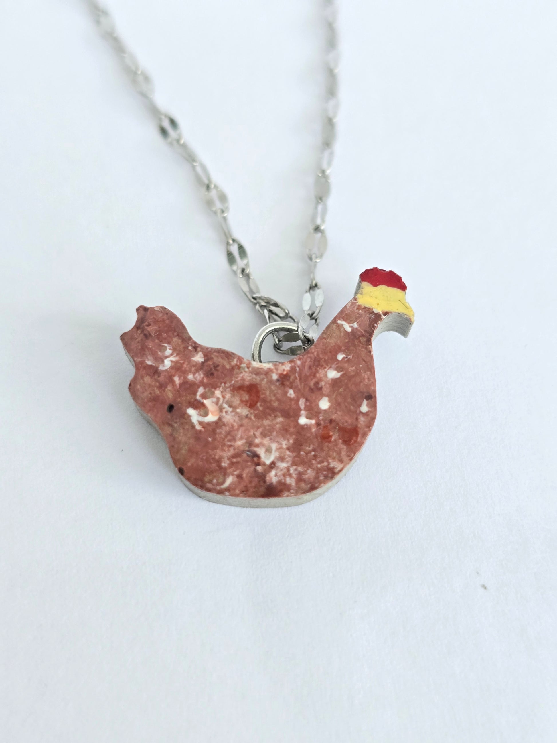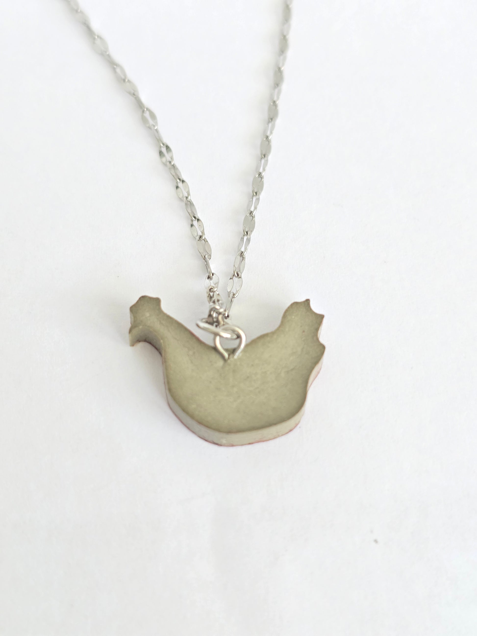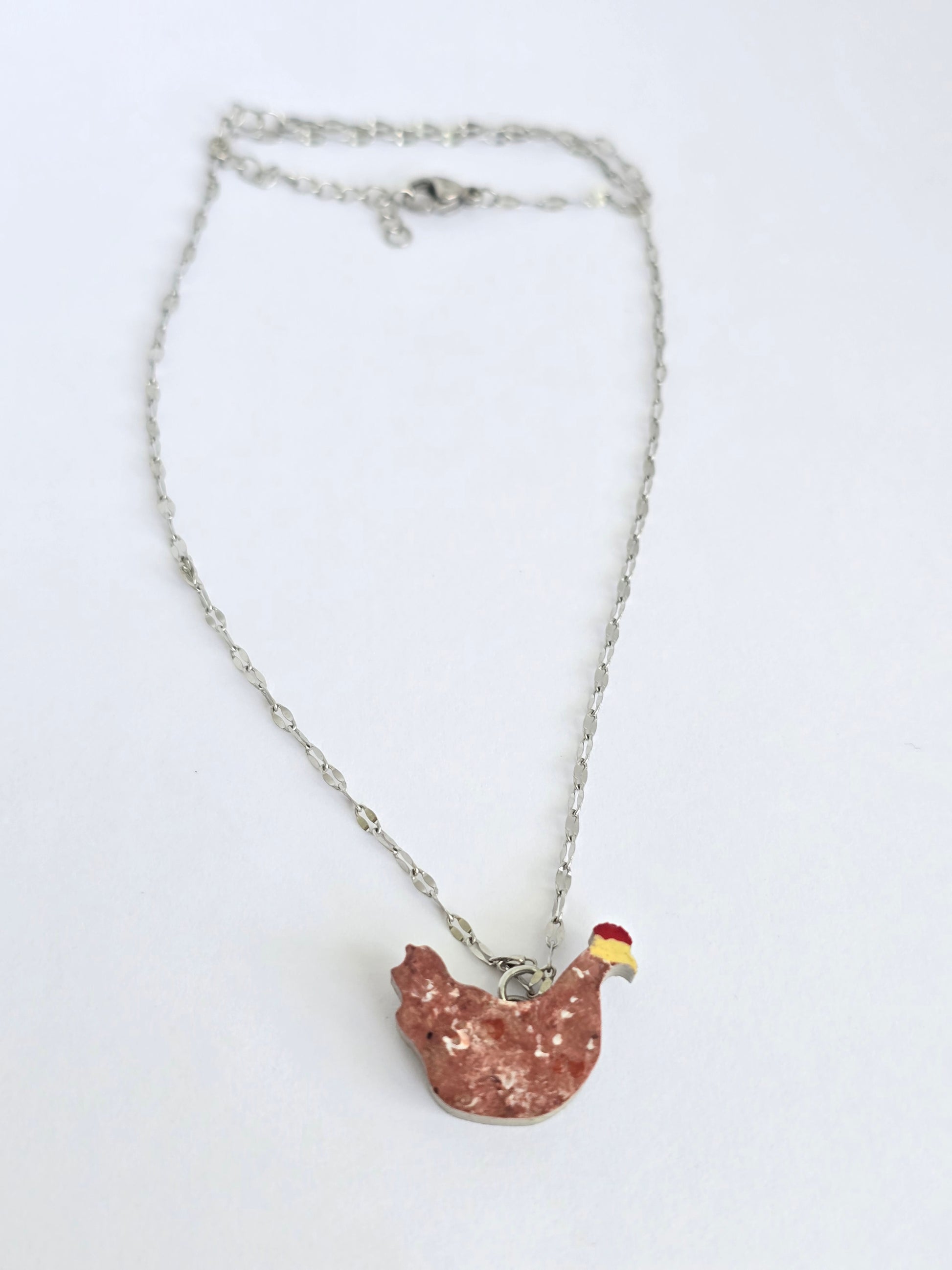 Colgante en forma de gallina, hecho en cemento y pintado a mano con atención al detalle. Cadena en acero inoxidable, ideal para uso diario. Una pieza artesanal con mucho carácter, perfecta para quienes aman los animales de campo y los diseños únicos con estilo rústico