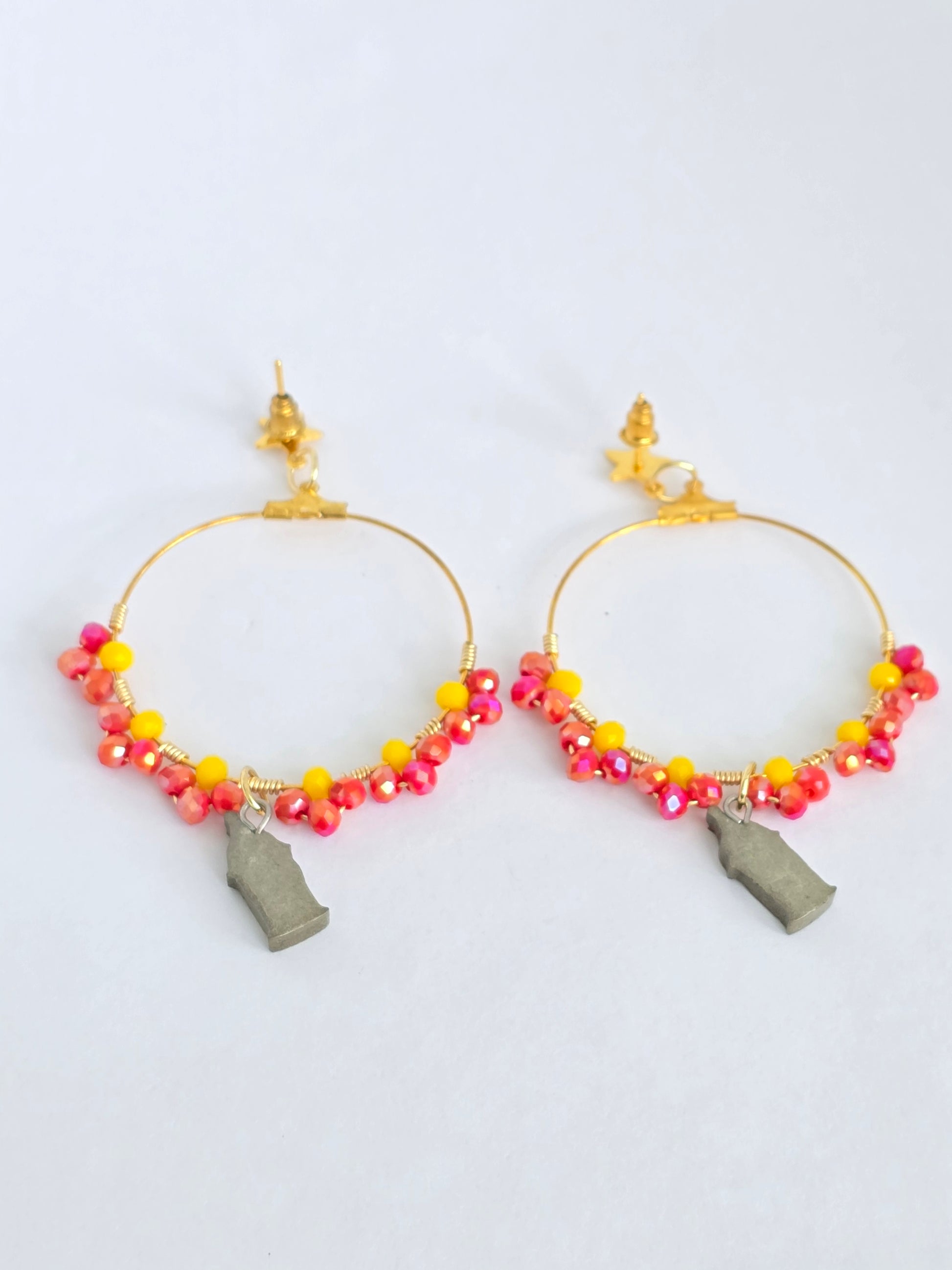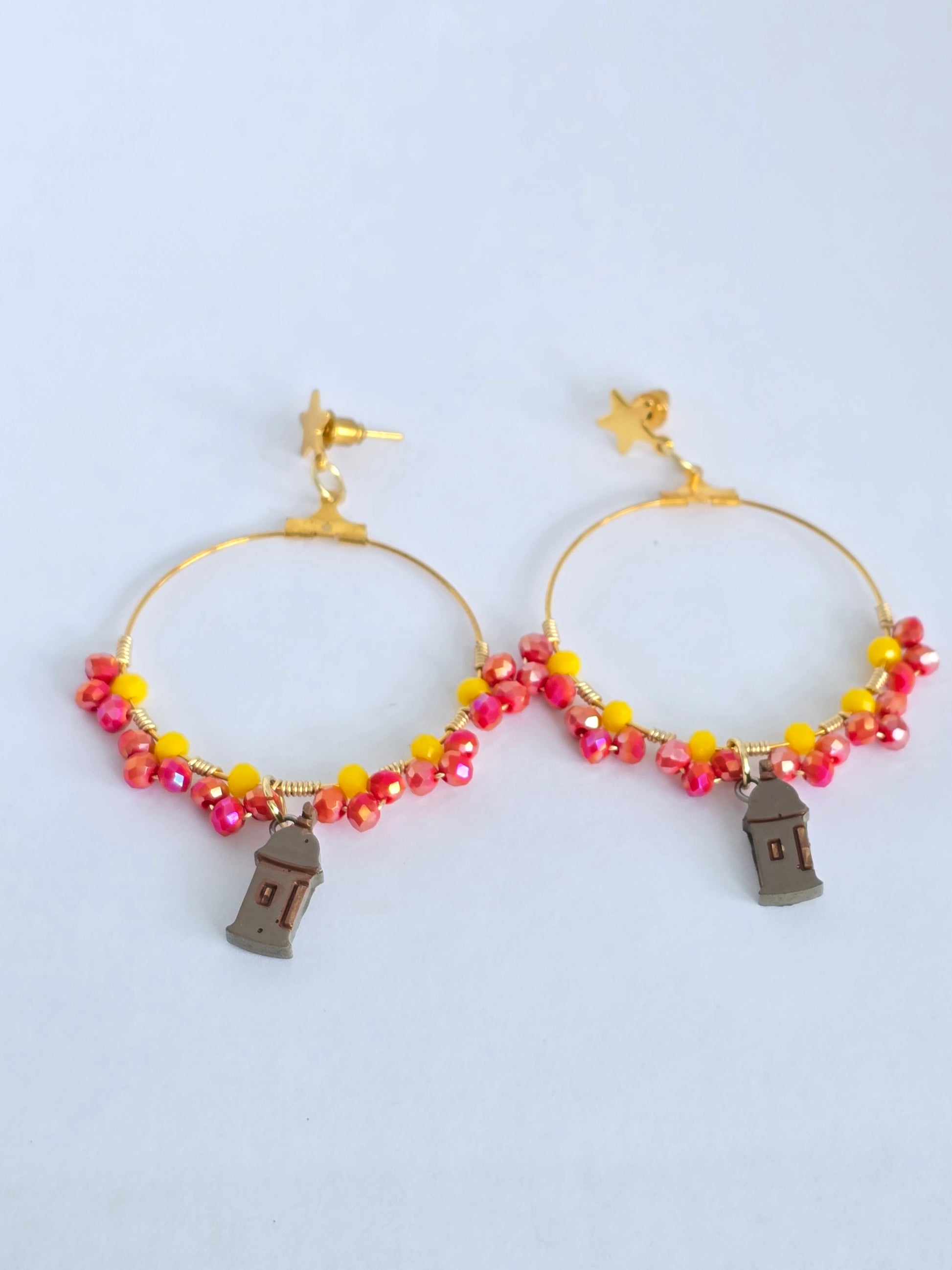 Una interpretación creativa de la flor nacional. Estas pantallas presentan un círculo alambrado a mano con piedritas en tonos rojo y amarillo, representando una amapola en forma abstracta y delicada. Como detalle especial, cuelga una mini mini garita hecha en cemento, un ícono cultural que conecta la pieza con nuestras raíces boricuas. Livianas, originales y montadas en ganchos de acero inoxidable, perfectas para quienes buscan arte, historia y estilo en una sola joya.