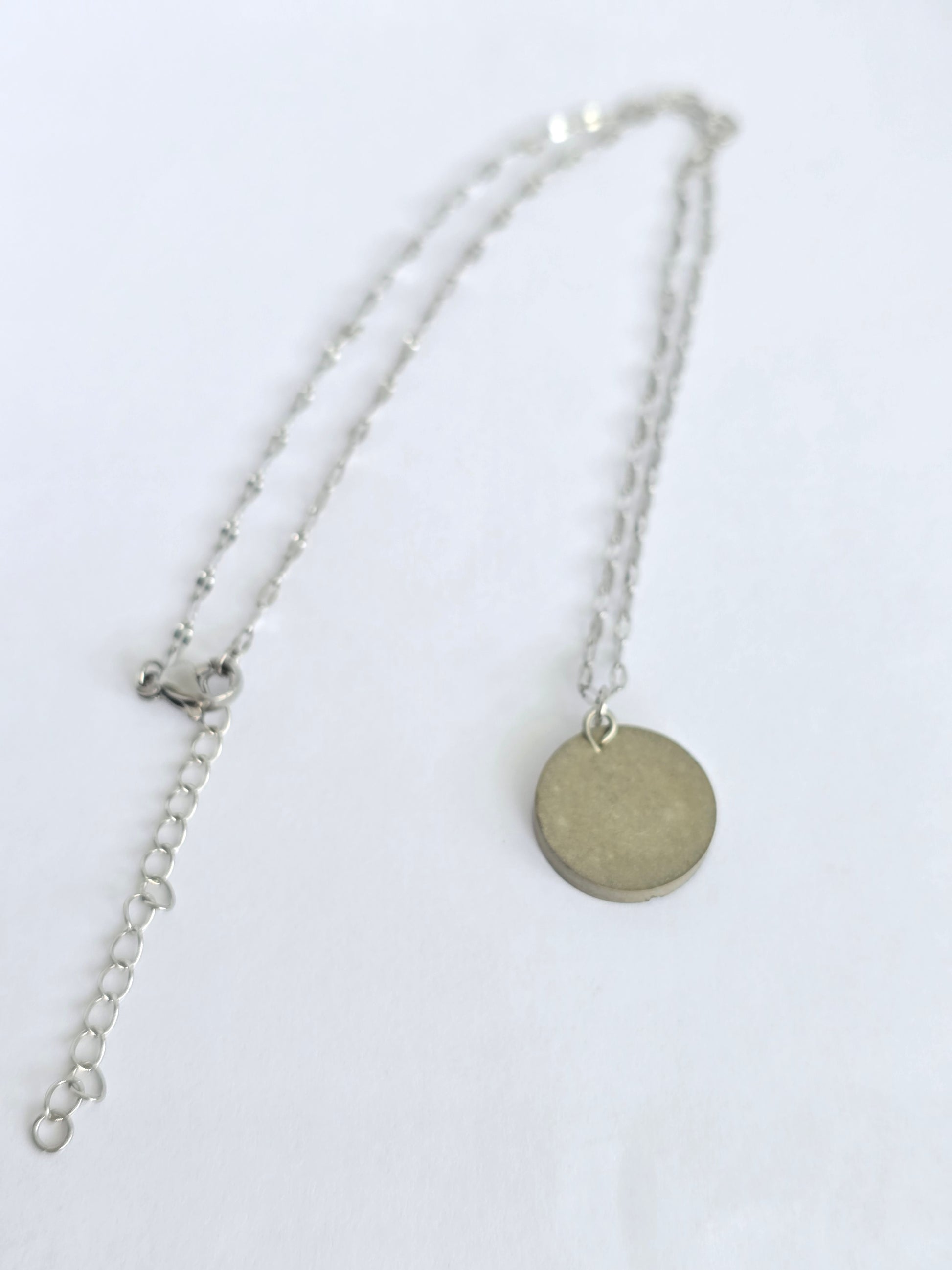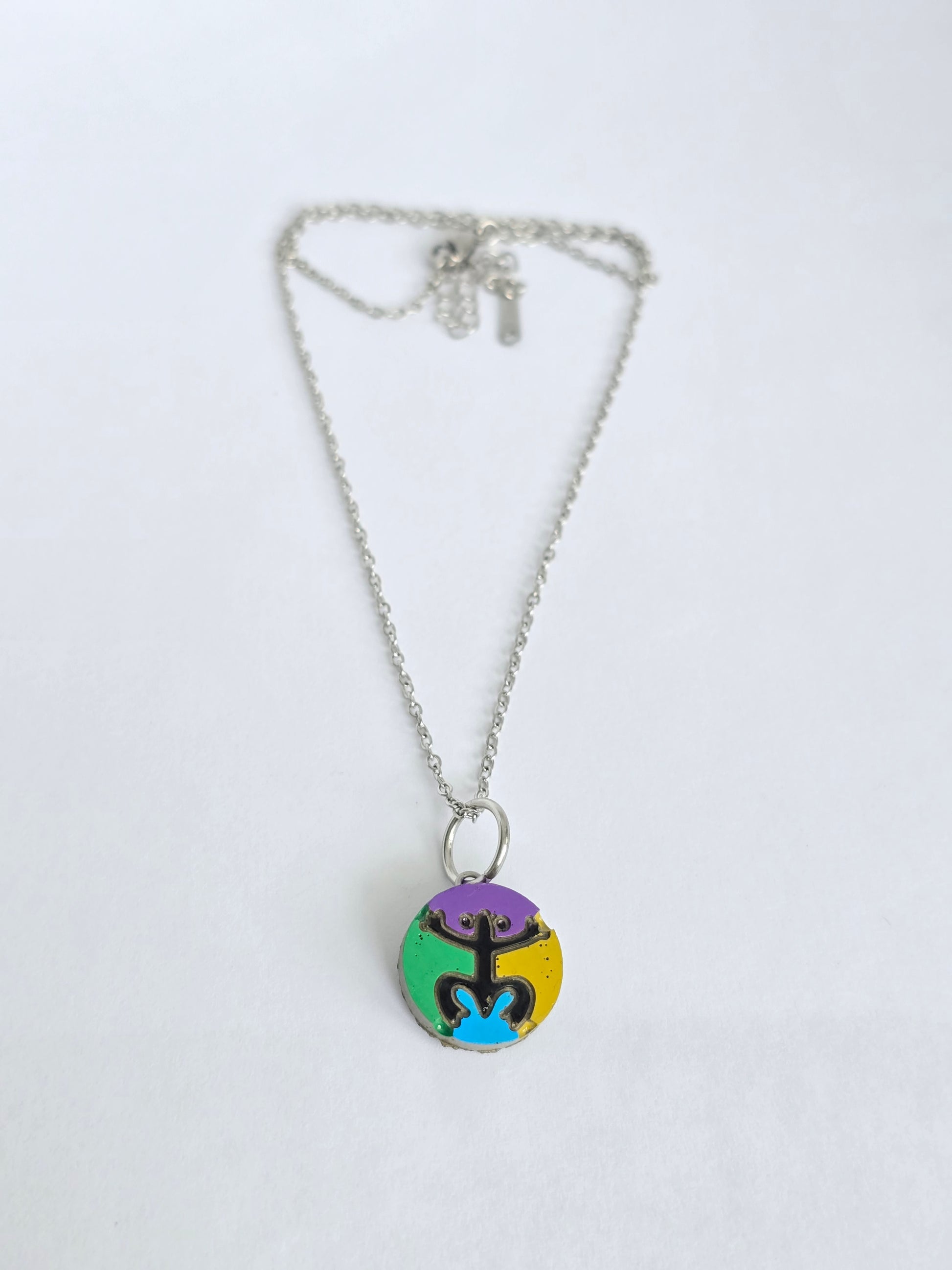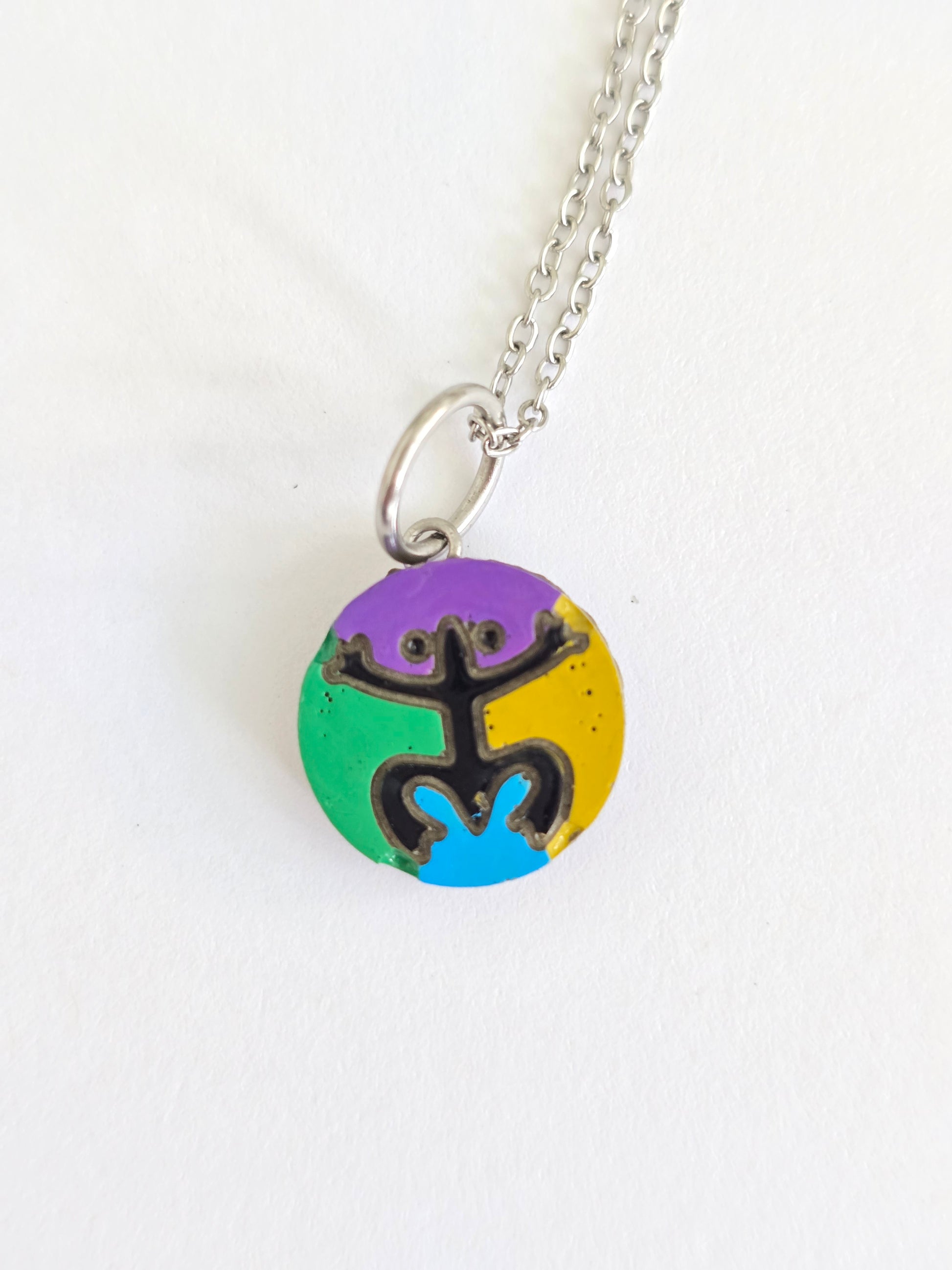 Charm circular en cemento con el símbolo del coquí taíno incrustado en el centro, homenaje a nuestra herencia indígena. Pintado a mano con un borde en tonos verde, azul, violeta y un toque de oro, esta pieza resalta con elegancia y energía caribeña. Acompañado de cadena en acero inoxidable, es ideal para llevar cultura, color y fuerza contigo a donde vayas.