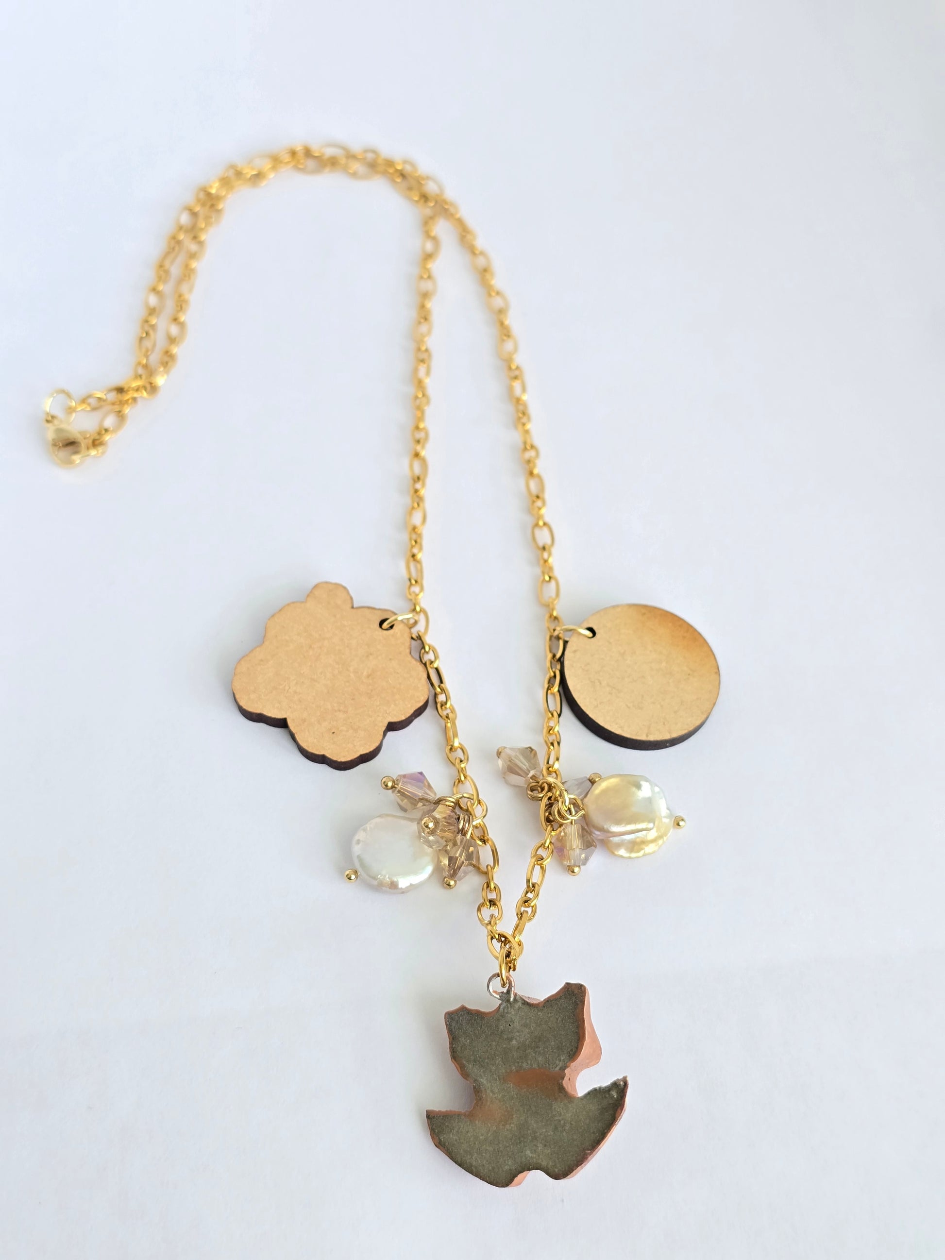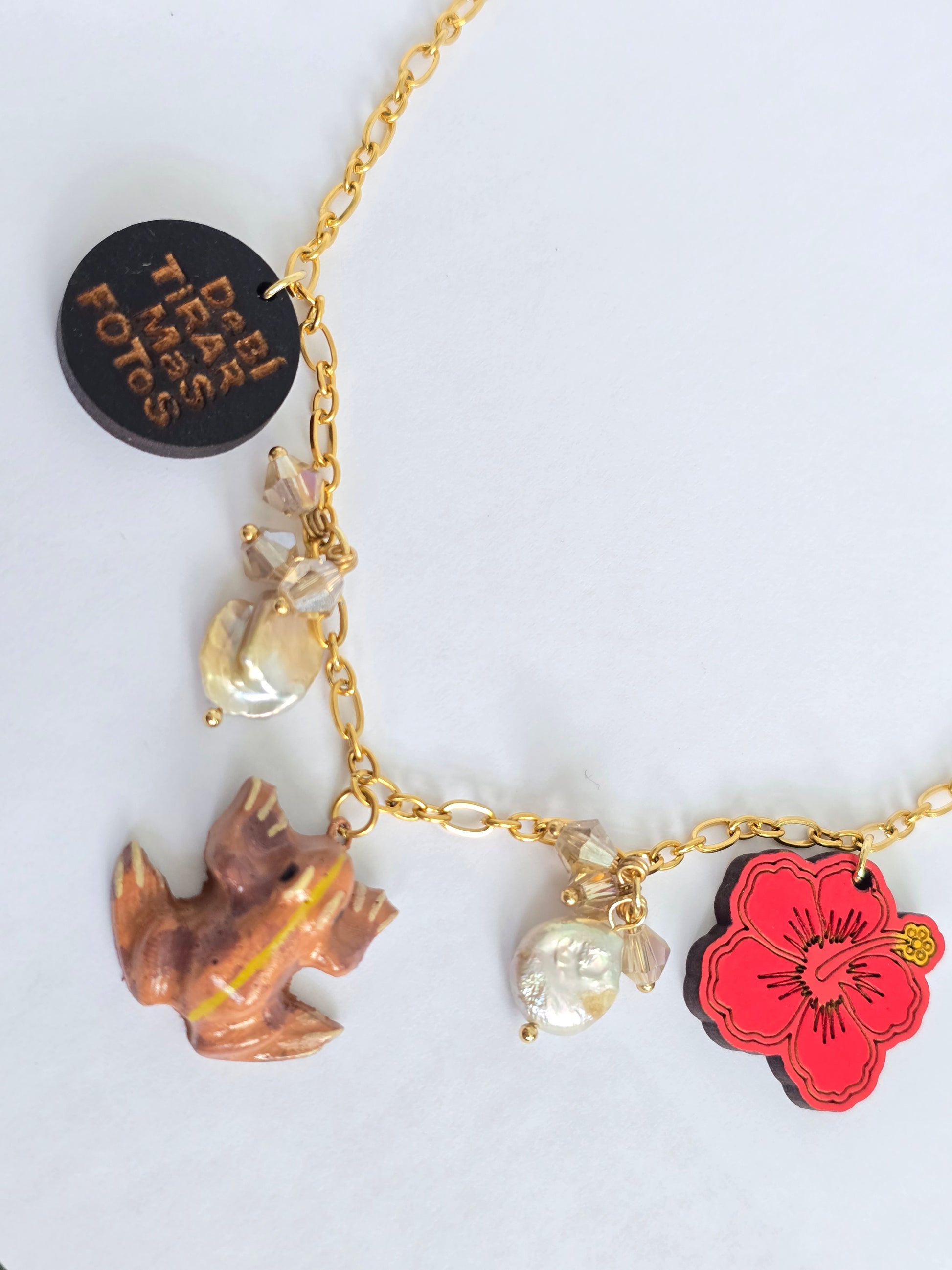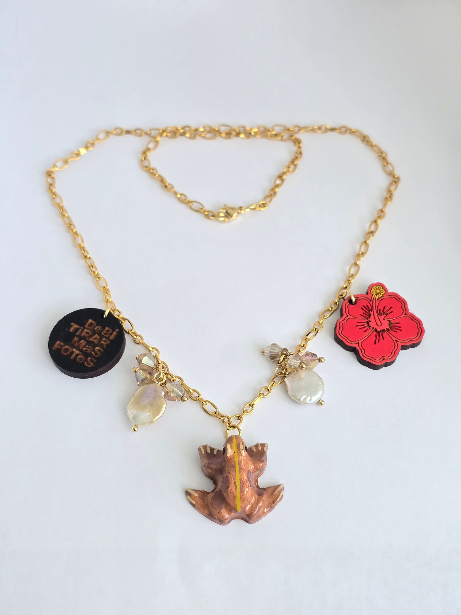 Este hermoso collar incluye un coquí artesanal de cemento pintado a mano, complementado con elementos de madera, cristales y perlas de agua dulce. Su cadena ancha y hueca está fabricada en acero inoxidable, ofreciendo resistencia y un diseño elegante. ¡Lleva contigo un símbolo único con estilo y calidad!.