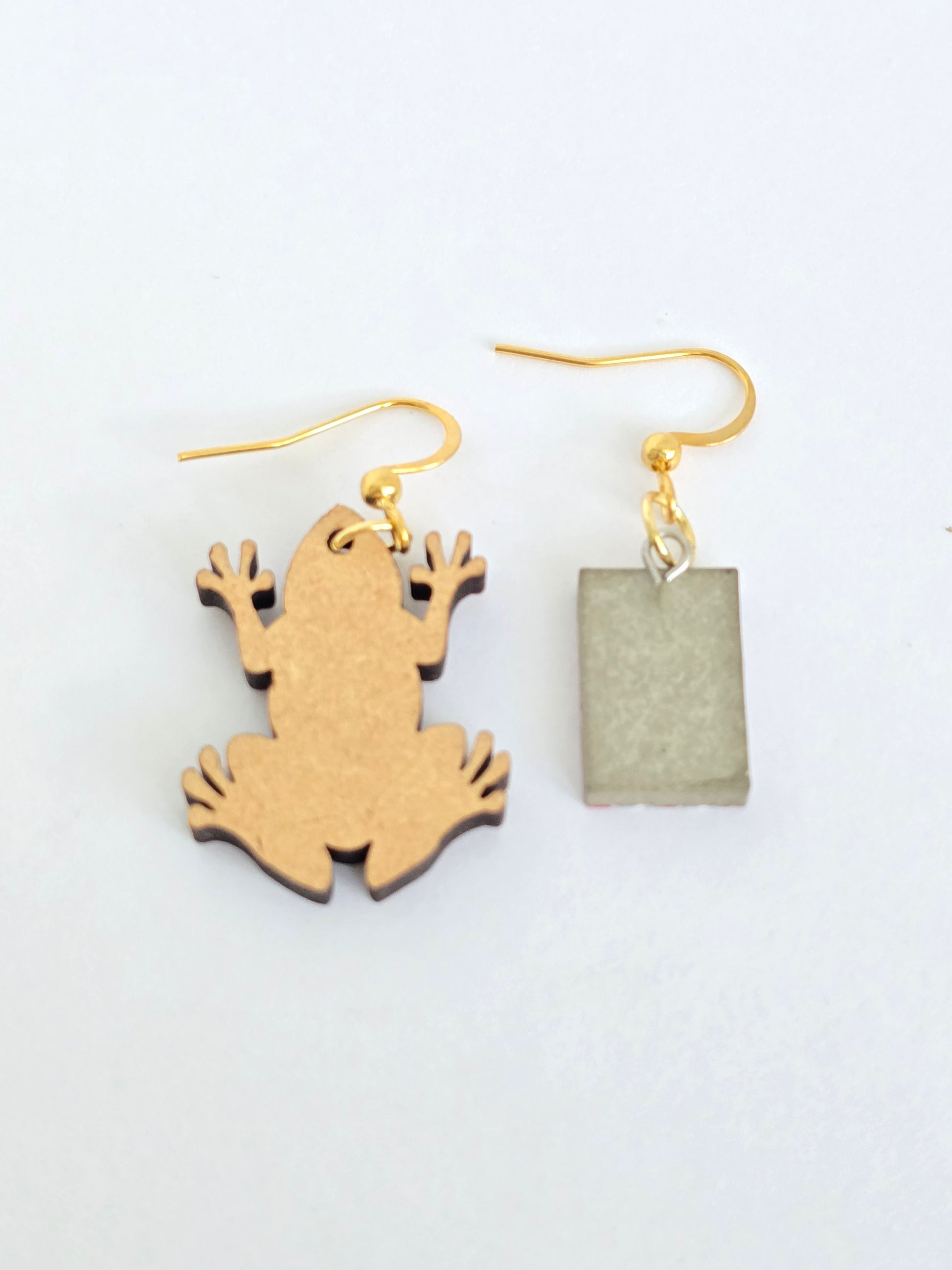 Estas pantallas colgantes desiguales combinan dos símbolos icónicos de Puerto Rico: un coquí hecho en madera y pintado a mano, y la bandera en cemento pintada con gran detalle. Cada pieza refleja amor por la isla y su cultura, mezclando texturas y materiales para un diseño único y artesanal. Ligeras y con ganchos en acero inoxidable, ideales para pieles sensibles y para quienes quieren llevar su identidad boricua con estilo y autenticidad.