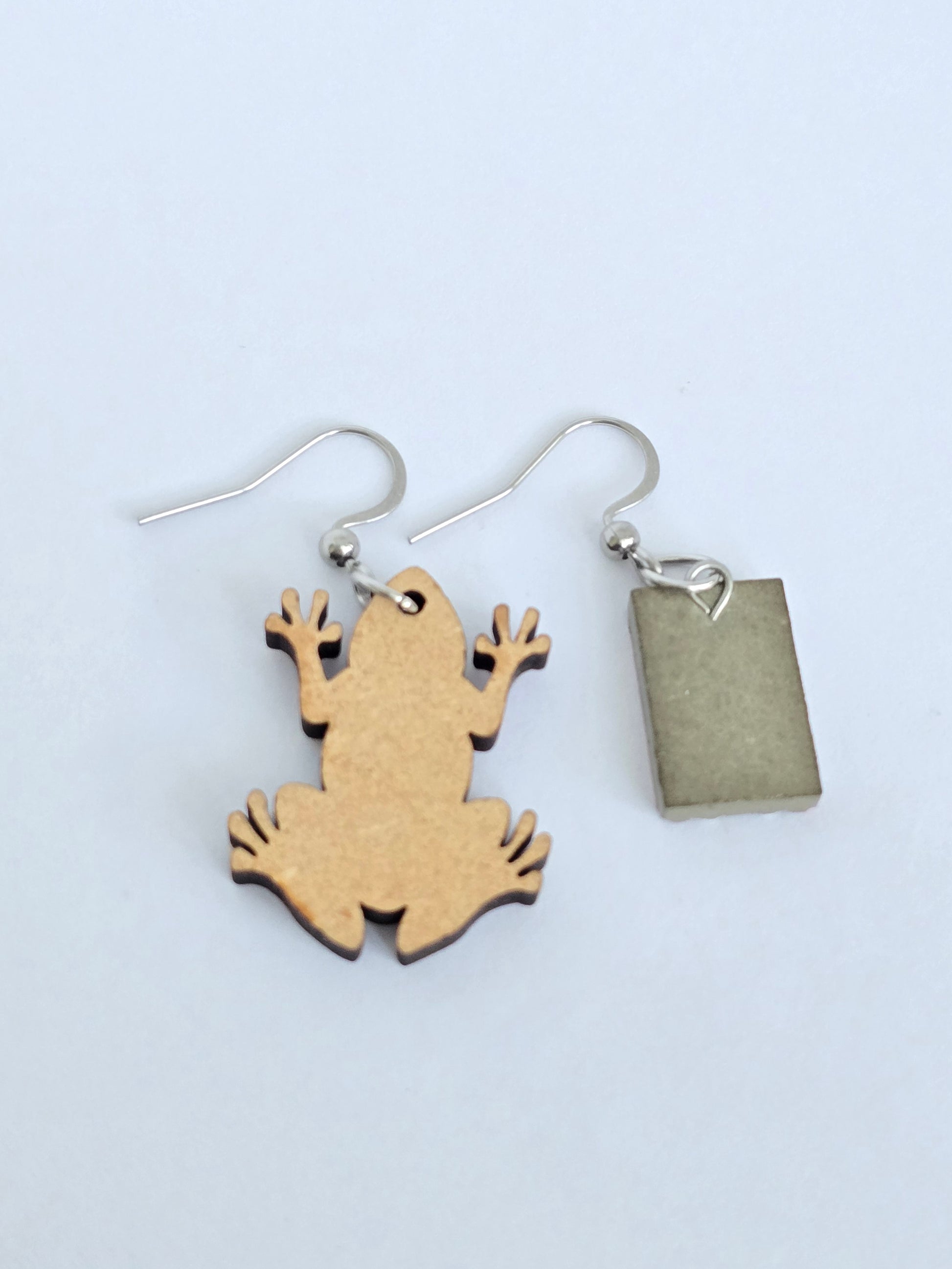 Estas pantallas colgantes desiguales combinan dos símbolos icónicos de Puerto Rico: un coquí hecho en madera y pintado a mano, y la bandera en cemento pintada con gran detalle. Cada pieza refleja amor por la isla y su cultura, mezclando texturas y materiales para un diseño único y artesanal. Ligeras y con ganchos en acero inoxidable, ideales para pieles sensibles y para quienes quieren llevar su identidad boricua con estilo y autenticidad.