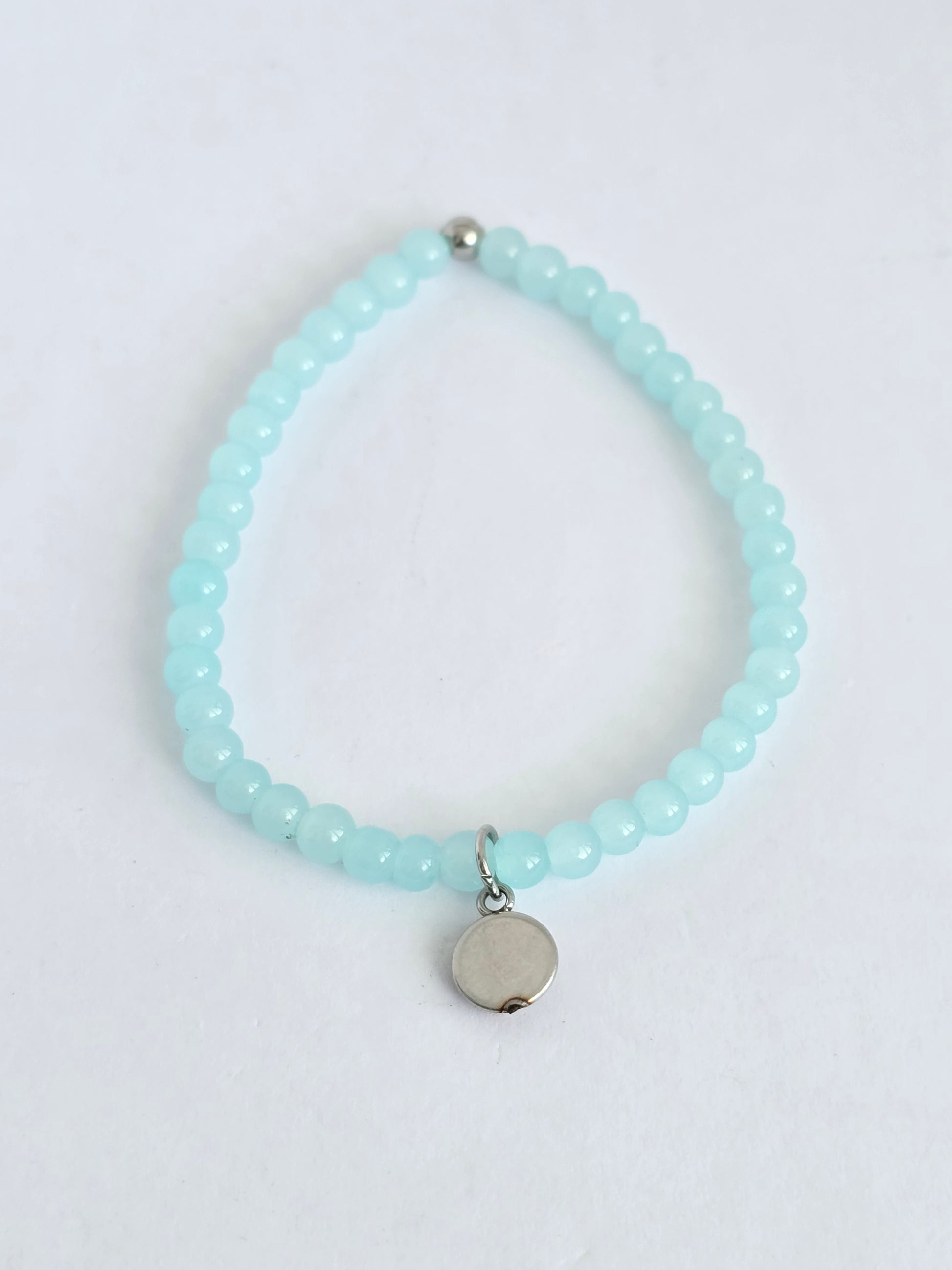 Set de dos pulseras en hilo elástico, una en azul y otra en amarillo, cada una con una chapita pequeña rellena en cemento. Un dúo colorido y versátil, ideal para usar juntas o por separado.