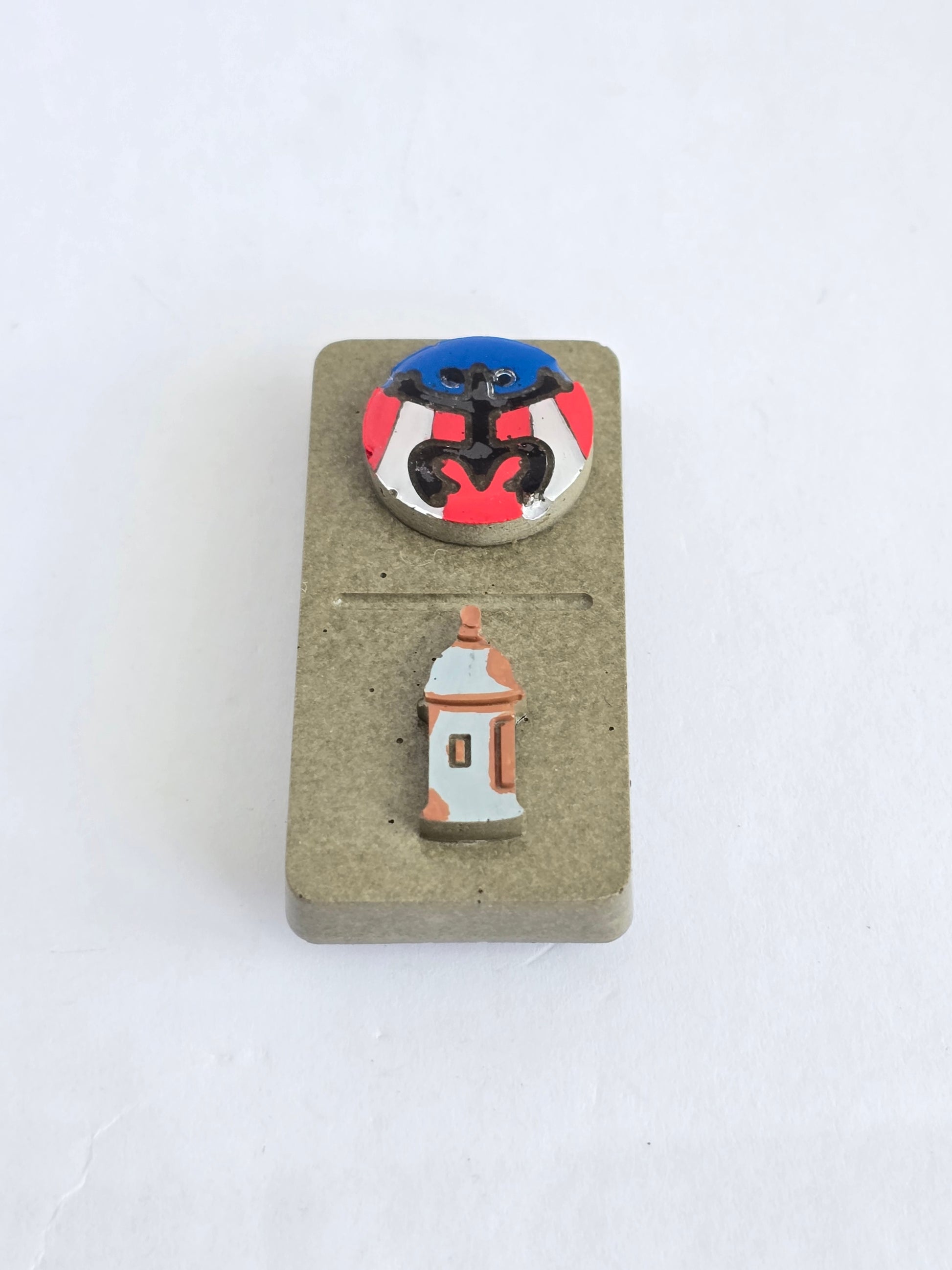 Imán en forma de ficha de dominó 0/0 hecho en cemento, decorado con dos poderosos símbolos de Puerto Rico: el coquí taíno y una garita, ambos pintados a mano con gran detalle. Una pieza que honra nuestra historia y esencia boricua en cada trazo.