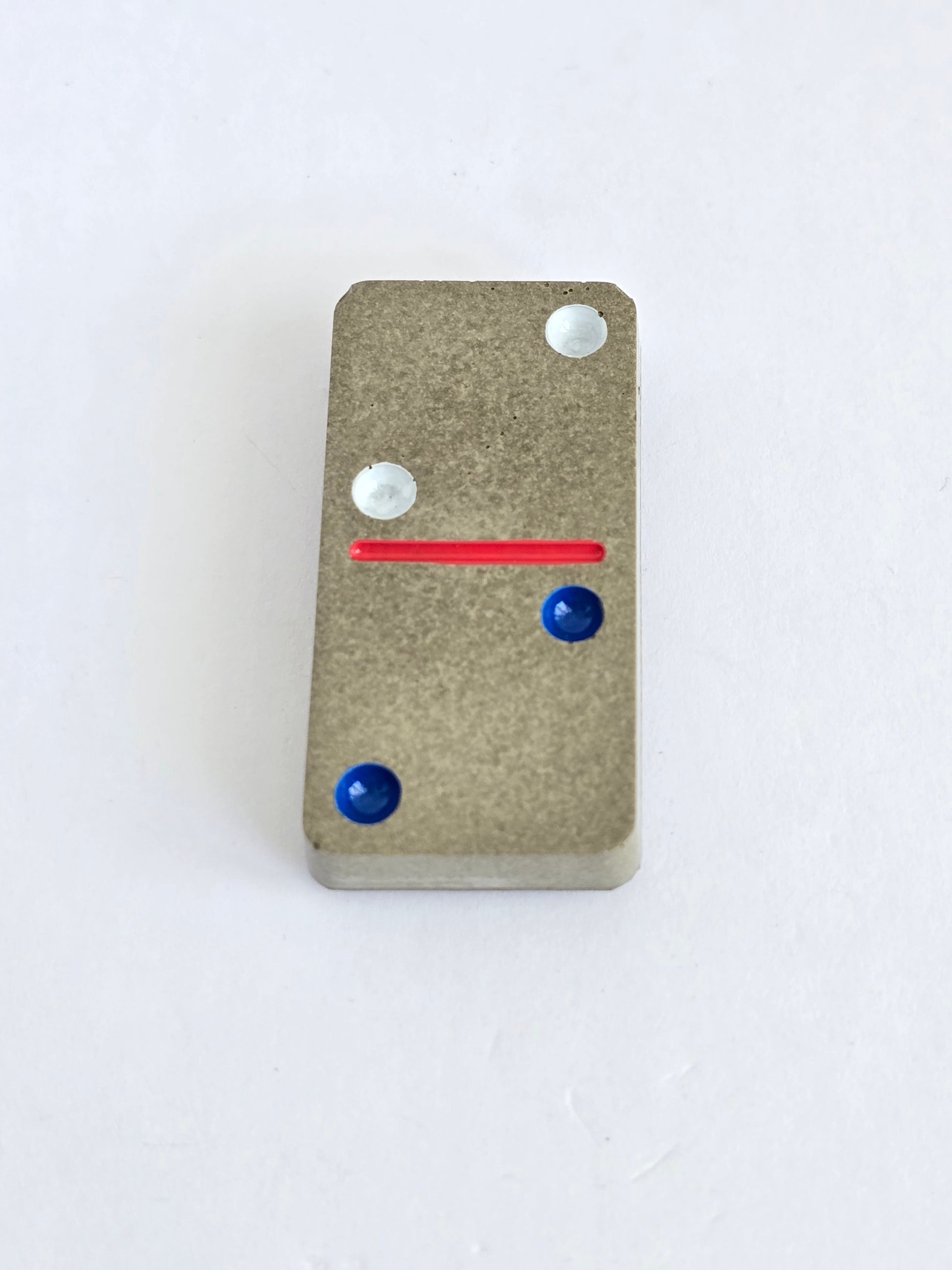 Imán en forma de ficha de dominó 2/2 hecho en cemento, pintado a mano en los colores rojo, blanco y azul como representación vibrante de la bandera de Puerto Rico. Una pieza pequeña con gran presencia, ideal para expresar tu orgullo boricua con estilo artesanal.