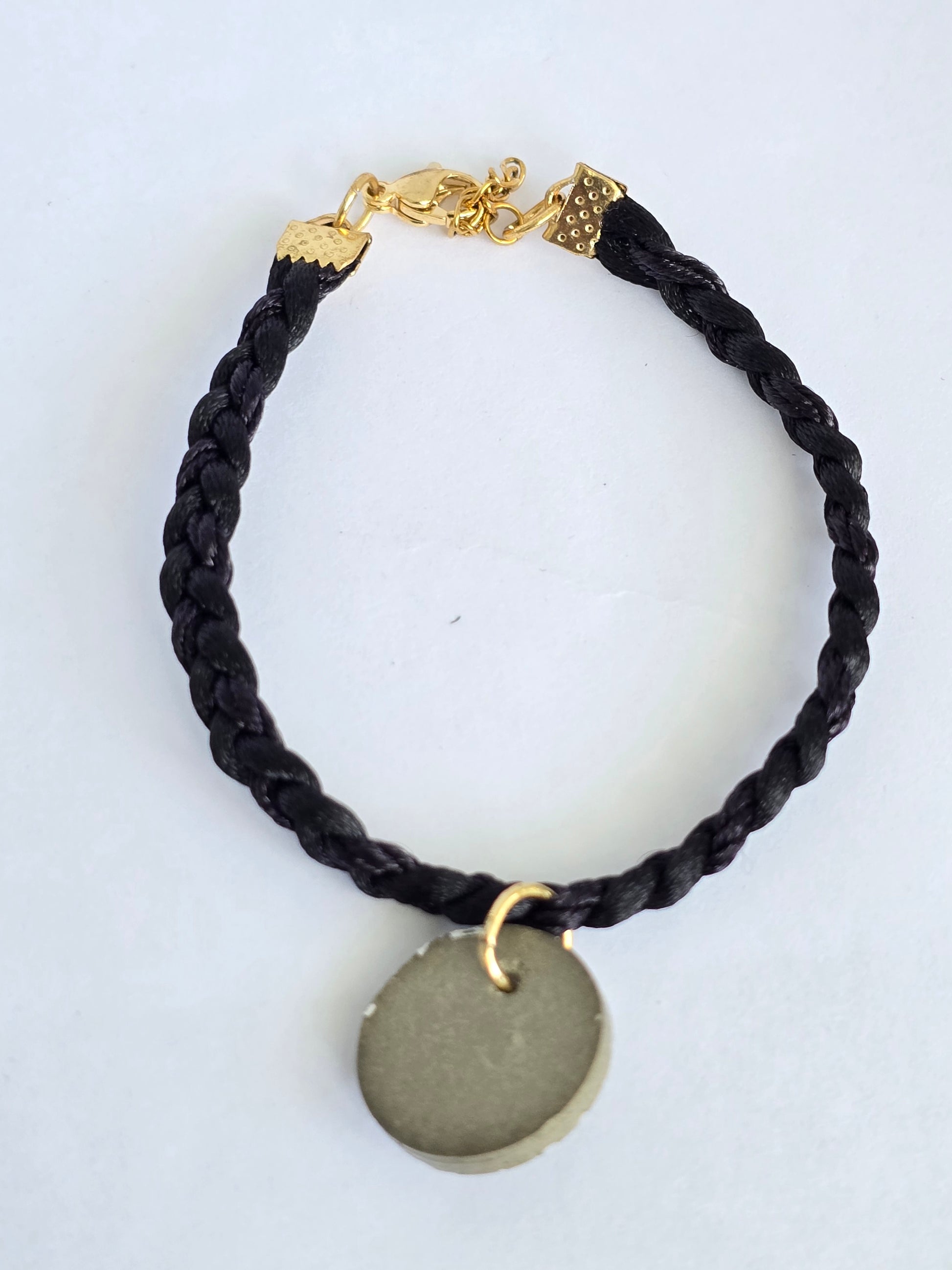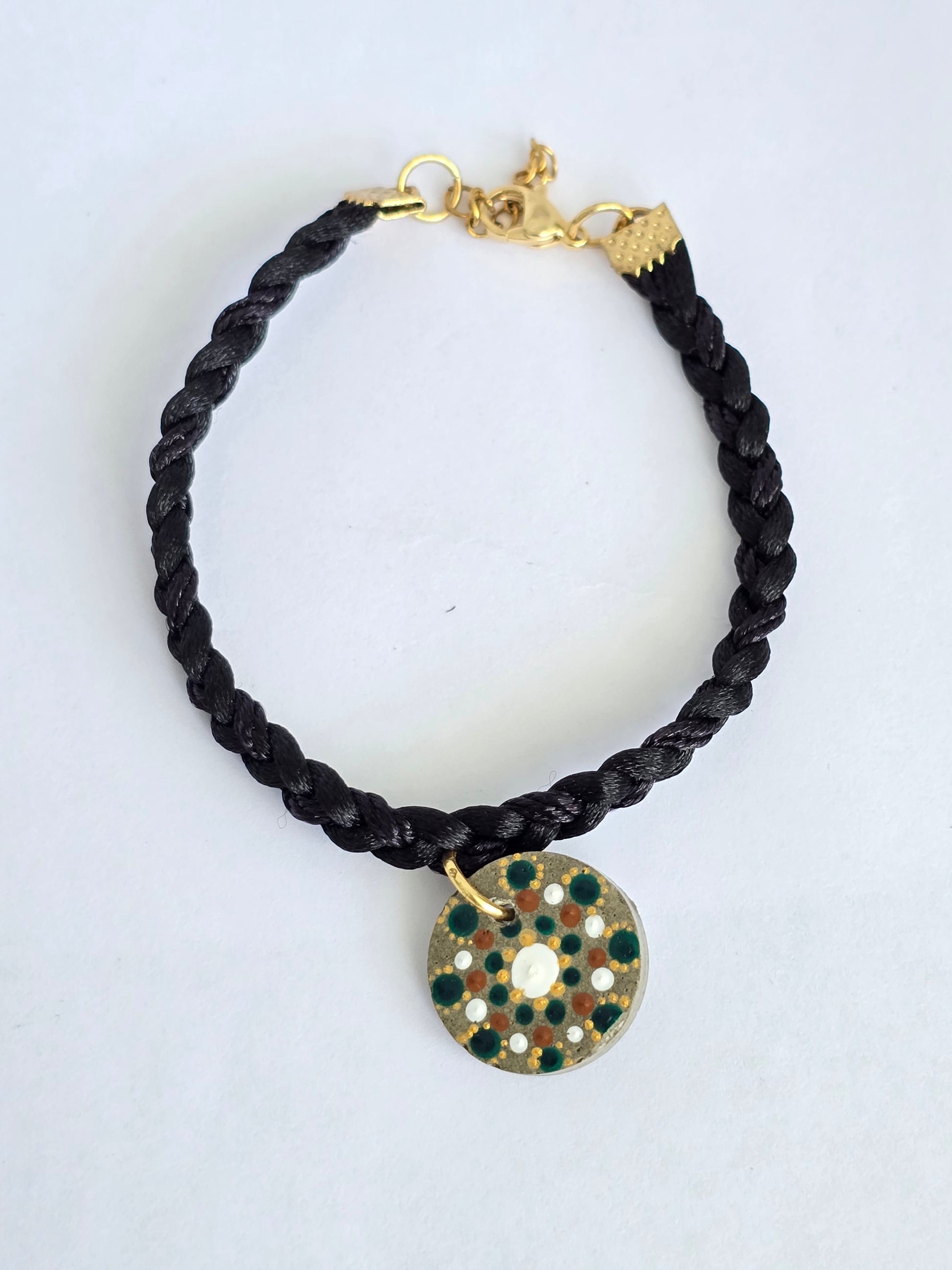 Pulsera en hilo completamente negro, diseñada para resaltar el detalle central: un charm en cemento pintado a mano con un hermoso diseño de mándala, lleno de simetría, intención y energía positiva.Terminal en acero inoxidable para una pieza duradera y con acabado de alta calidad.