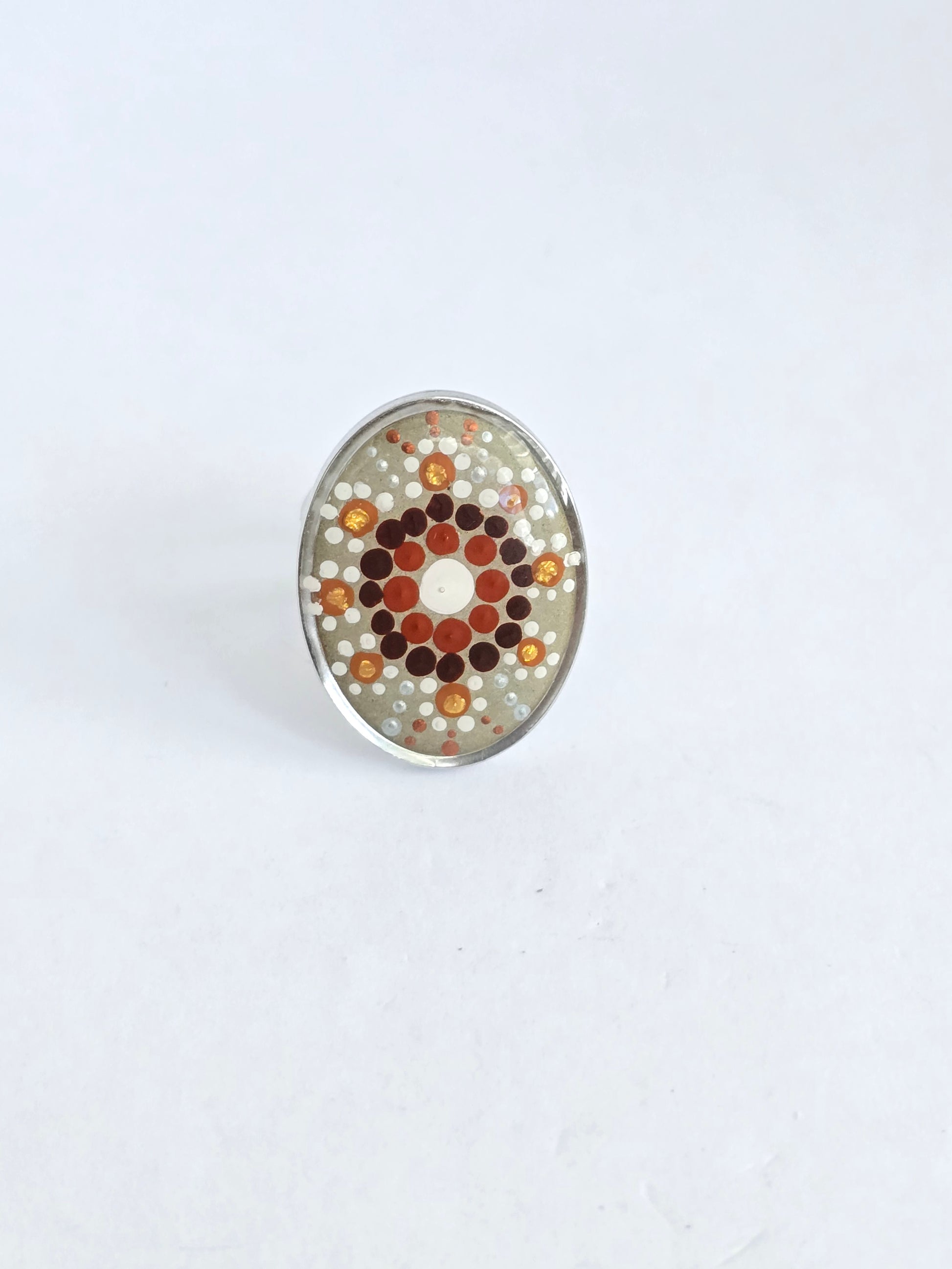 Sortija ajustable en acero inoxidable, con base rellena de cemento y un hermoso diseño de puntos estilo mandala pintado a mano. Cada punto refleja equilibrio, energía y detalle, convirtiendo esta pieza en una pequeña obra de arte para tus manos.