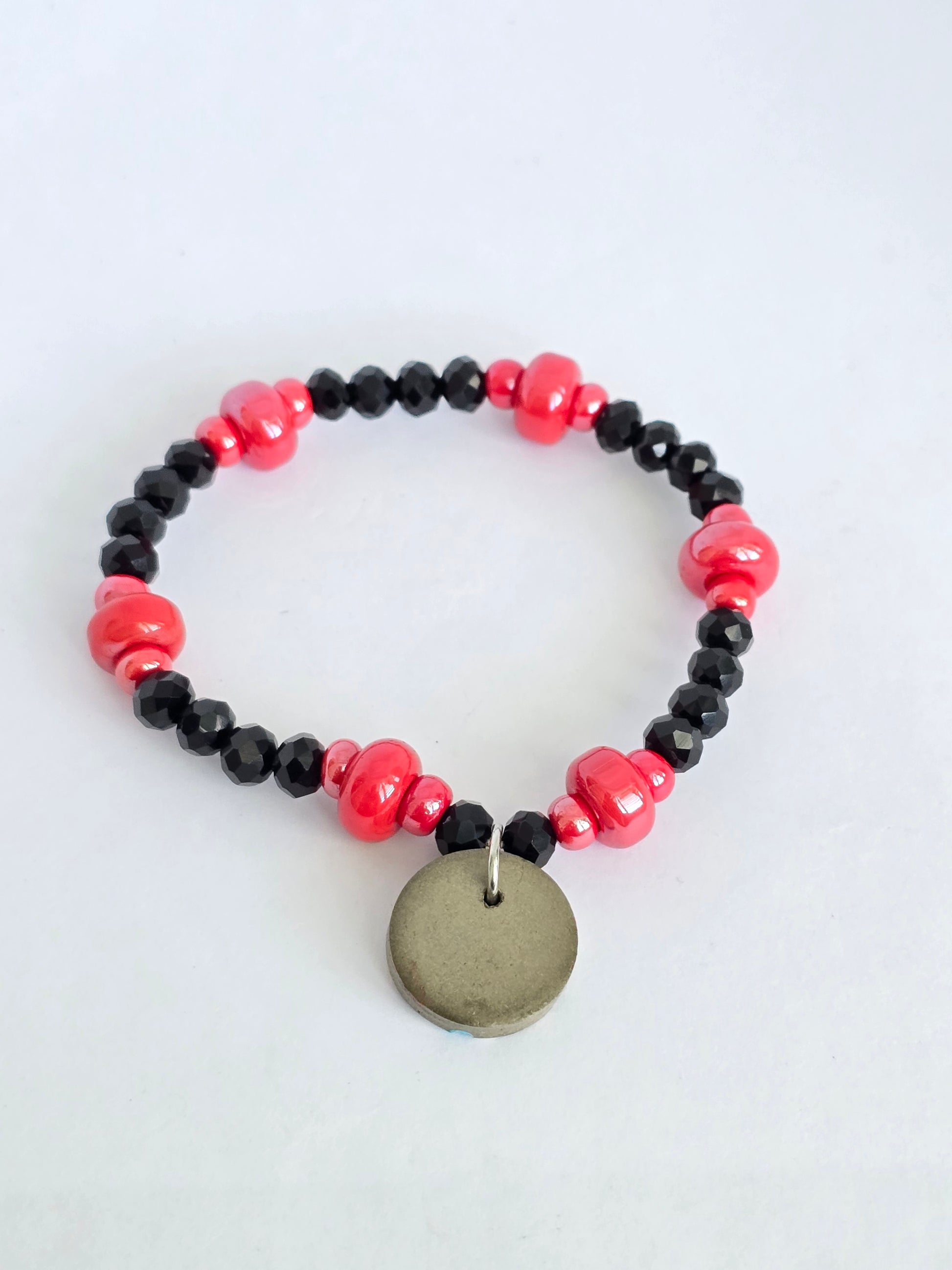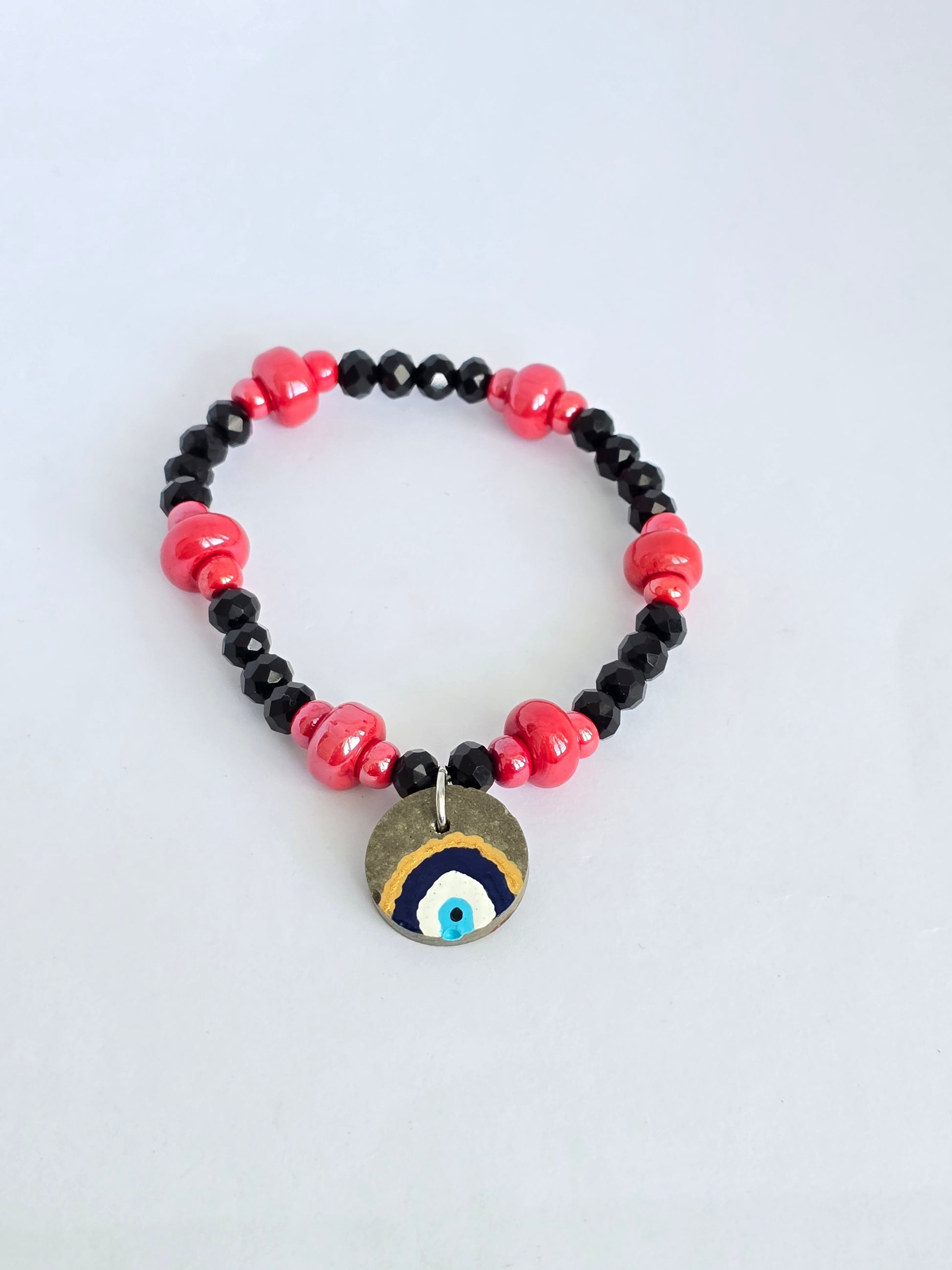 Pulsera en hilo elástico, cómoda y fácil de colocar, hecha con cristales rondeles negros que aportan elegancia y un toque moderno. Incluye separadores en cerámica roja que añaden un contraste vibrante, y un charm central en cemento pintado a mano con un ojo turco, símbolo de protección y buena energía.