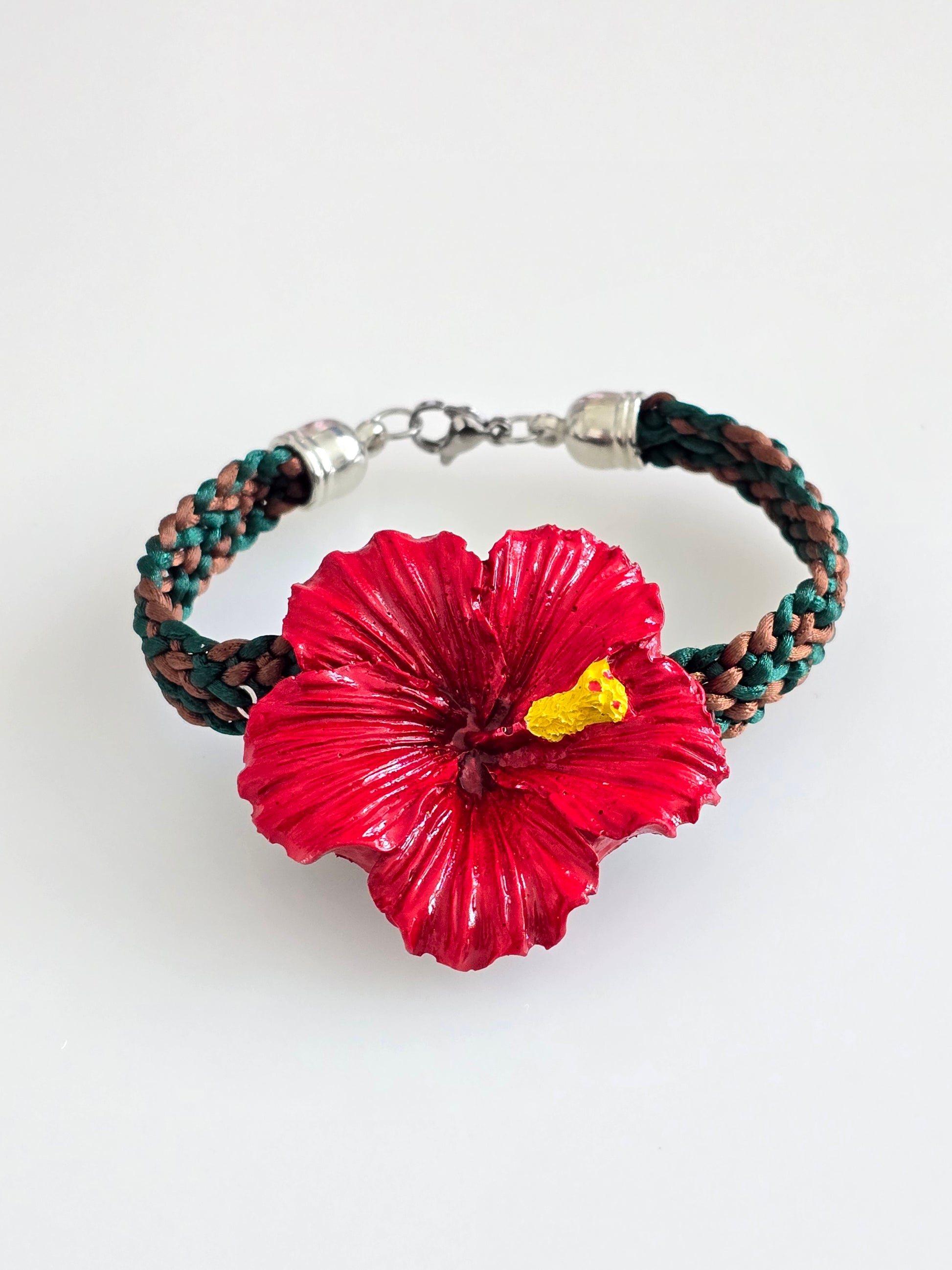 Trenza aplastada con tonos verde y marrón, evocando la belleza natural del bosque tropical. En el centro, una amapola grande añade el toque perfecto de color y textura. Sus terminales planteados completan el diseño con elegancia.