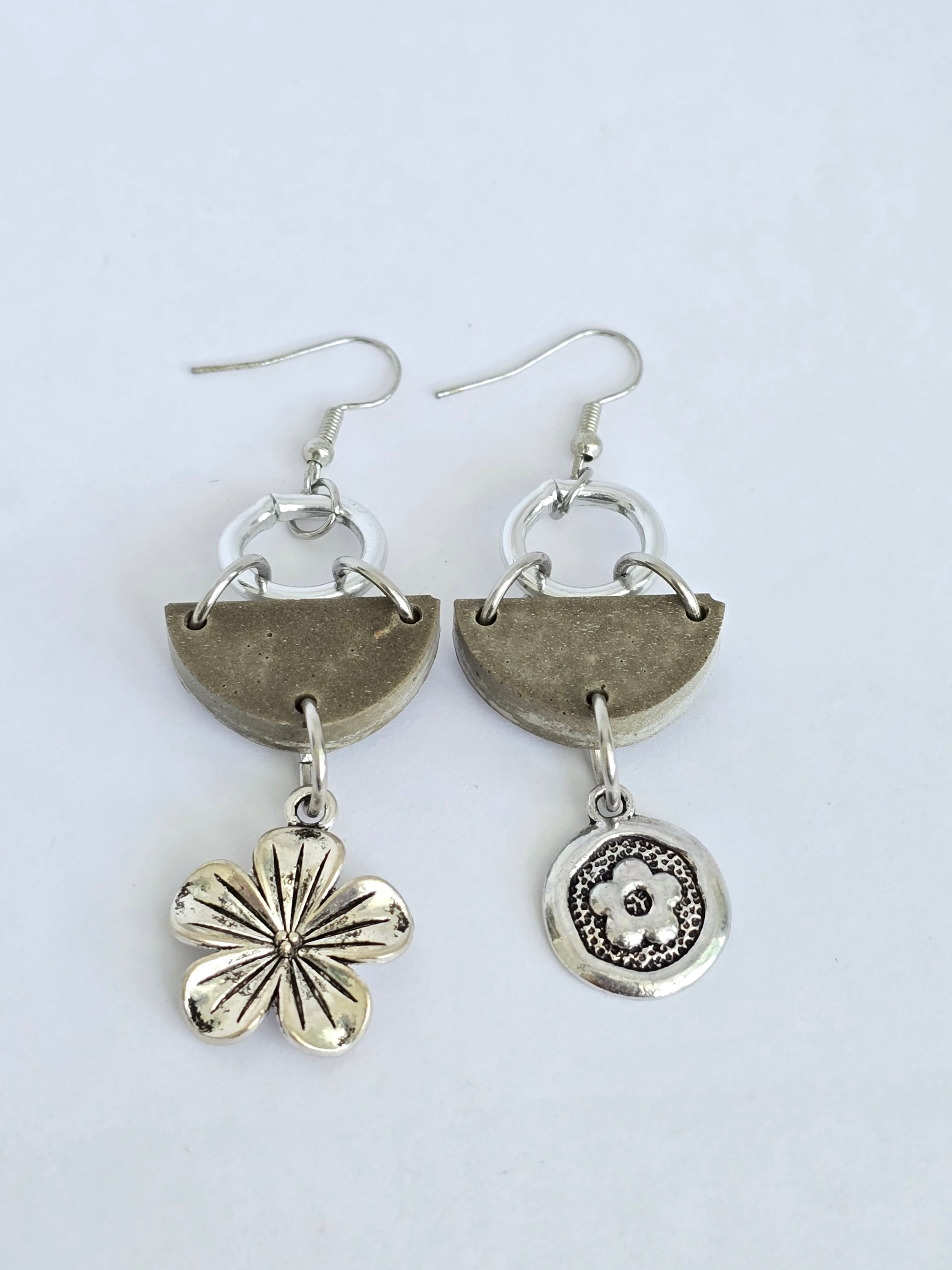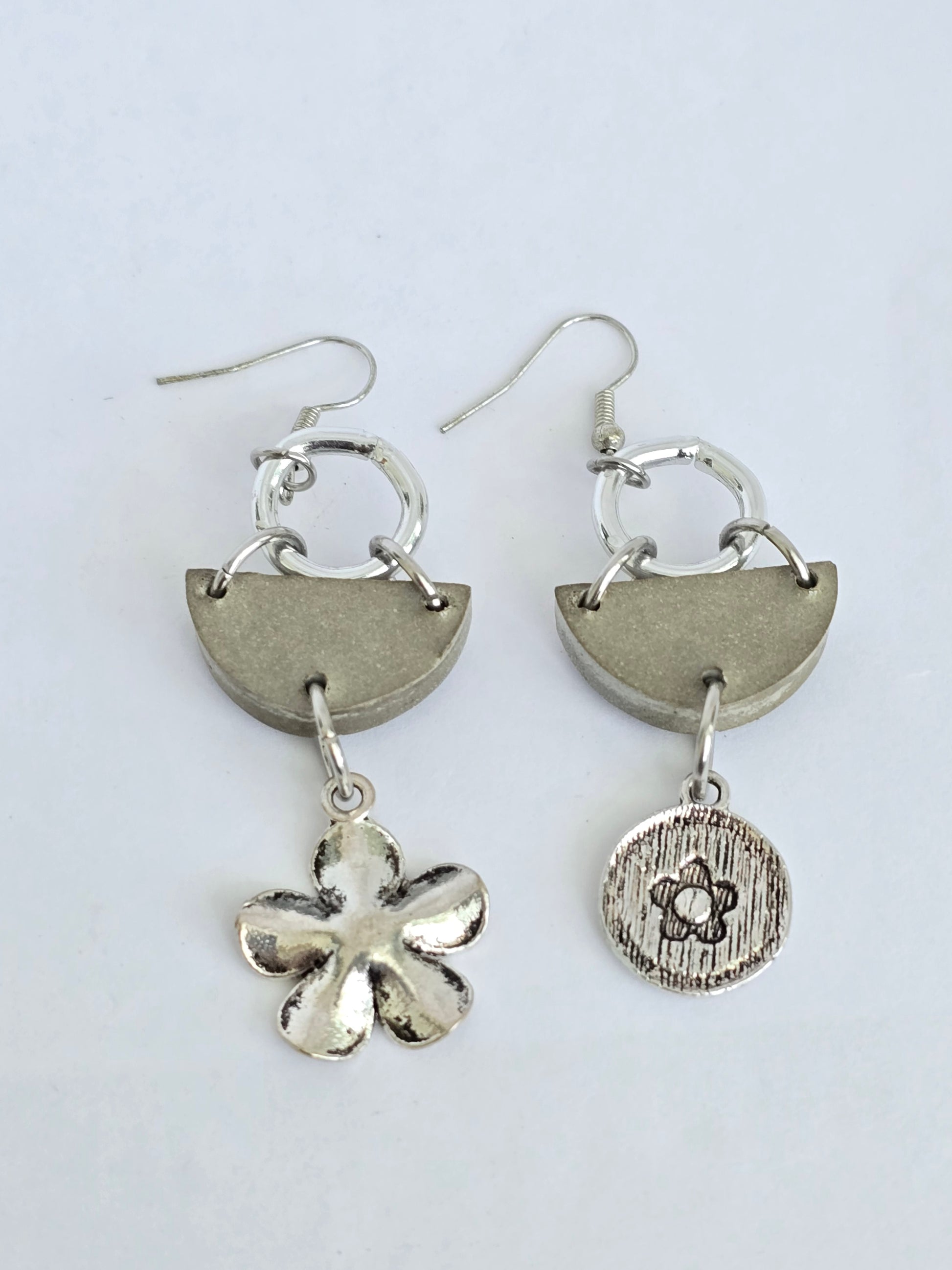 Diseño único con conectores en cemento en forma de media luna. A cada lado cuelgan delicados charms de flores en tono plata, creando una combinación desigual pero armoniosa. Todo en acero inoxidable para mayor durabilidad y estilo. Perfectas para quienes aman lo diferente y especial.