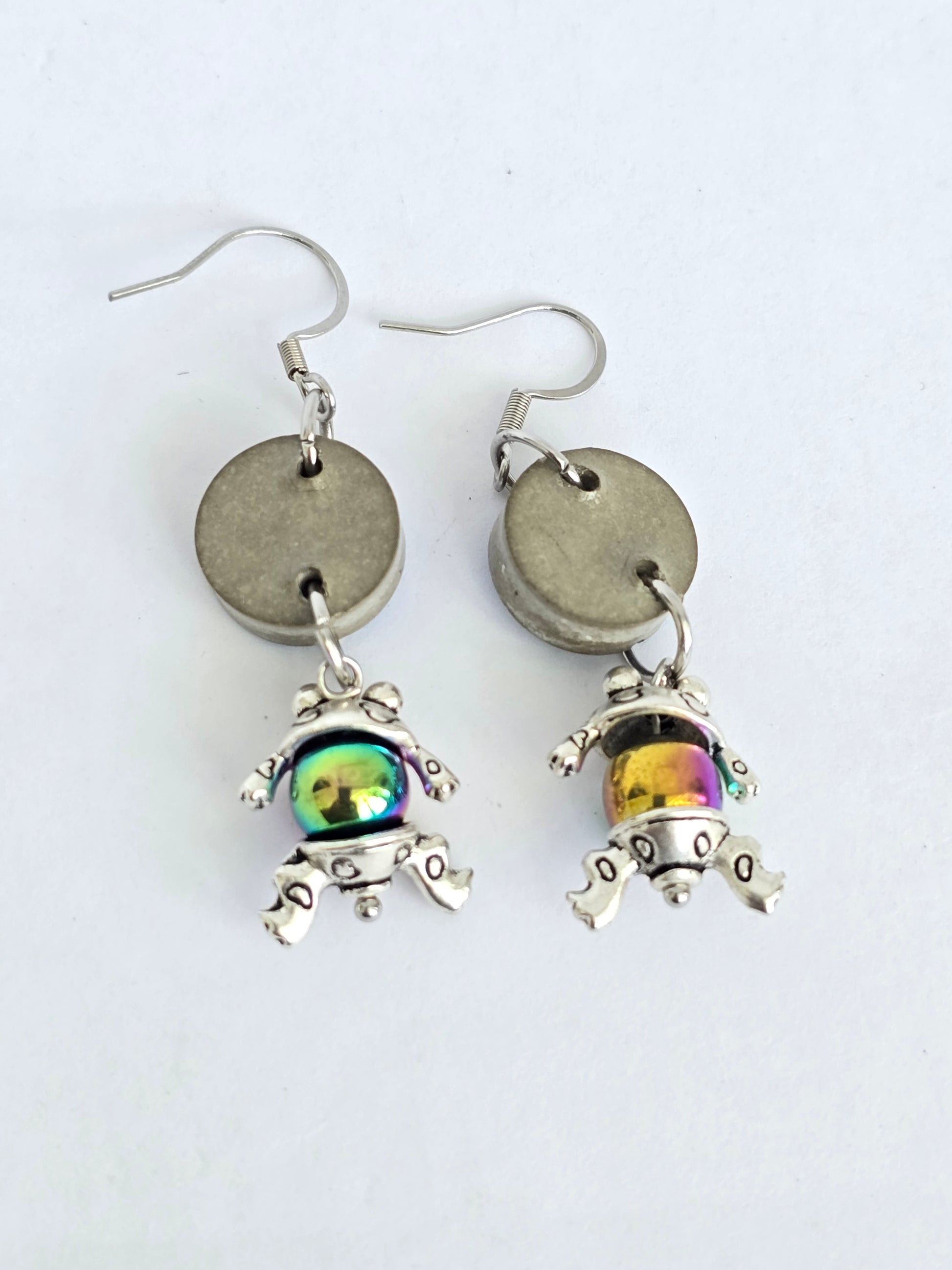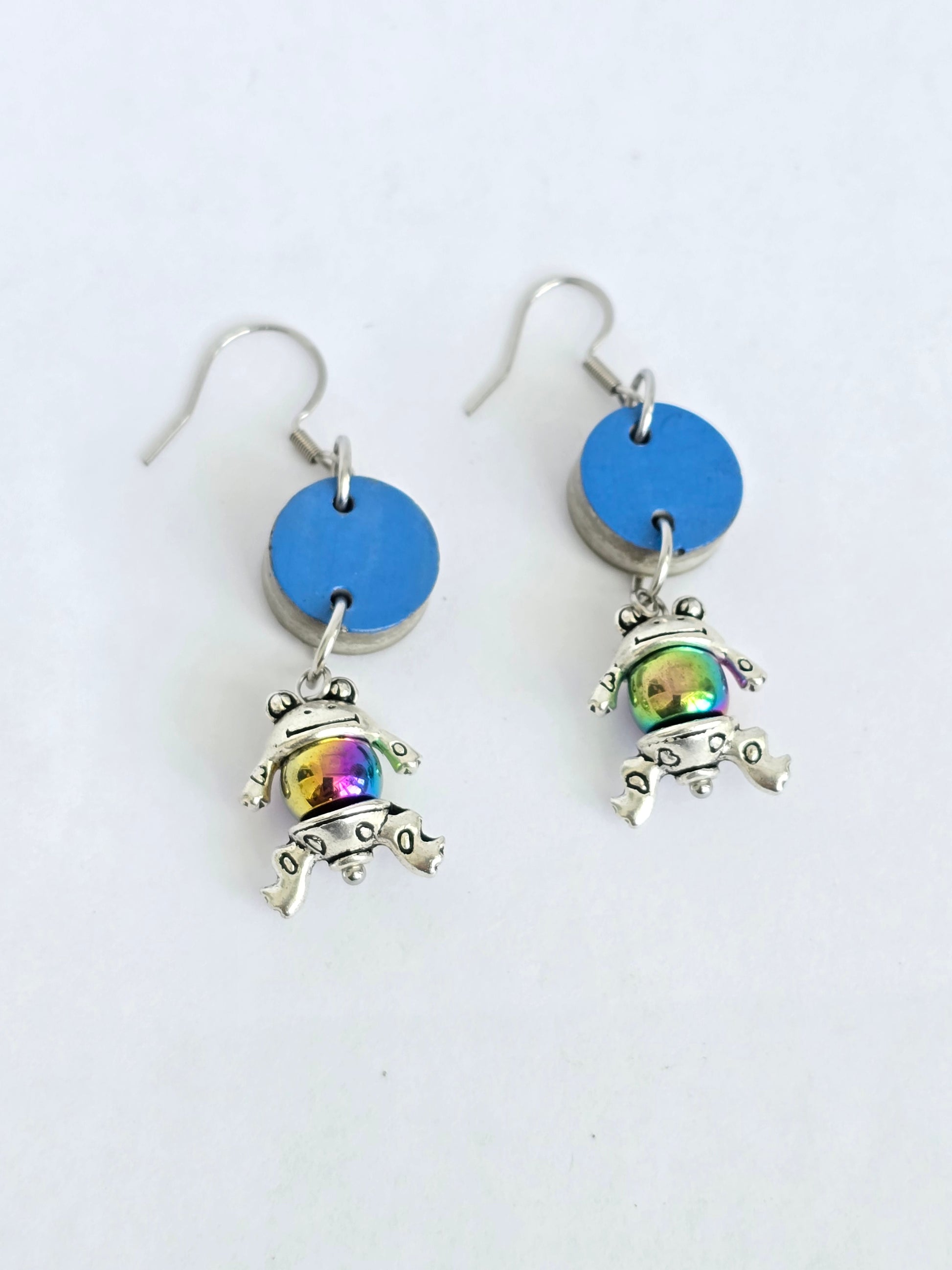 Pantallas llamativas con conector en cemento pintado de azul, decoradas con un charm de sapo en tono plata y un centro tornasol que refleja la luz con un toque mágico. Livianas, originales y perfectas para destacar cualquier look.
