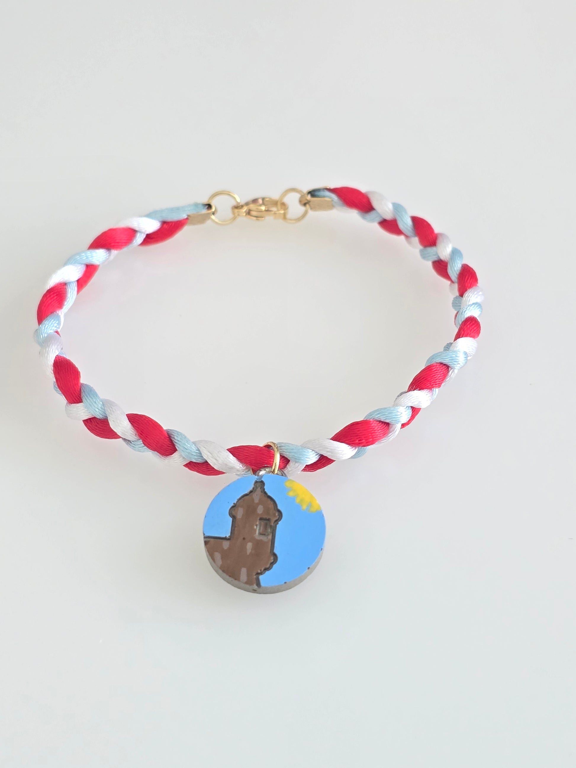 Inspirada en los colores de Puerto Rico, esta pulsera une orgullo y arte en una pieza única. Su pieza central con la garita, elaborada a mano en cemento y pintada con detalle, se destaca sobre una trenza en tonos azul, blanco y rojo. Un accesorio lleno de identidad boricua, perfecto para lucir con orgullo y estilo. Material: Cemento, cordón trenzado y herrajes dorados acero inoxidable.