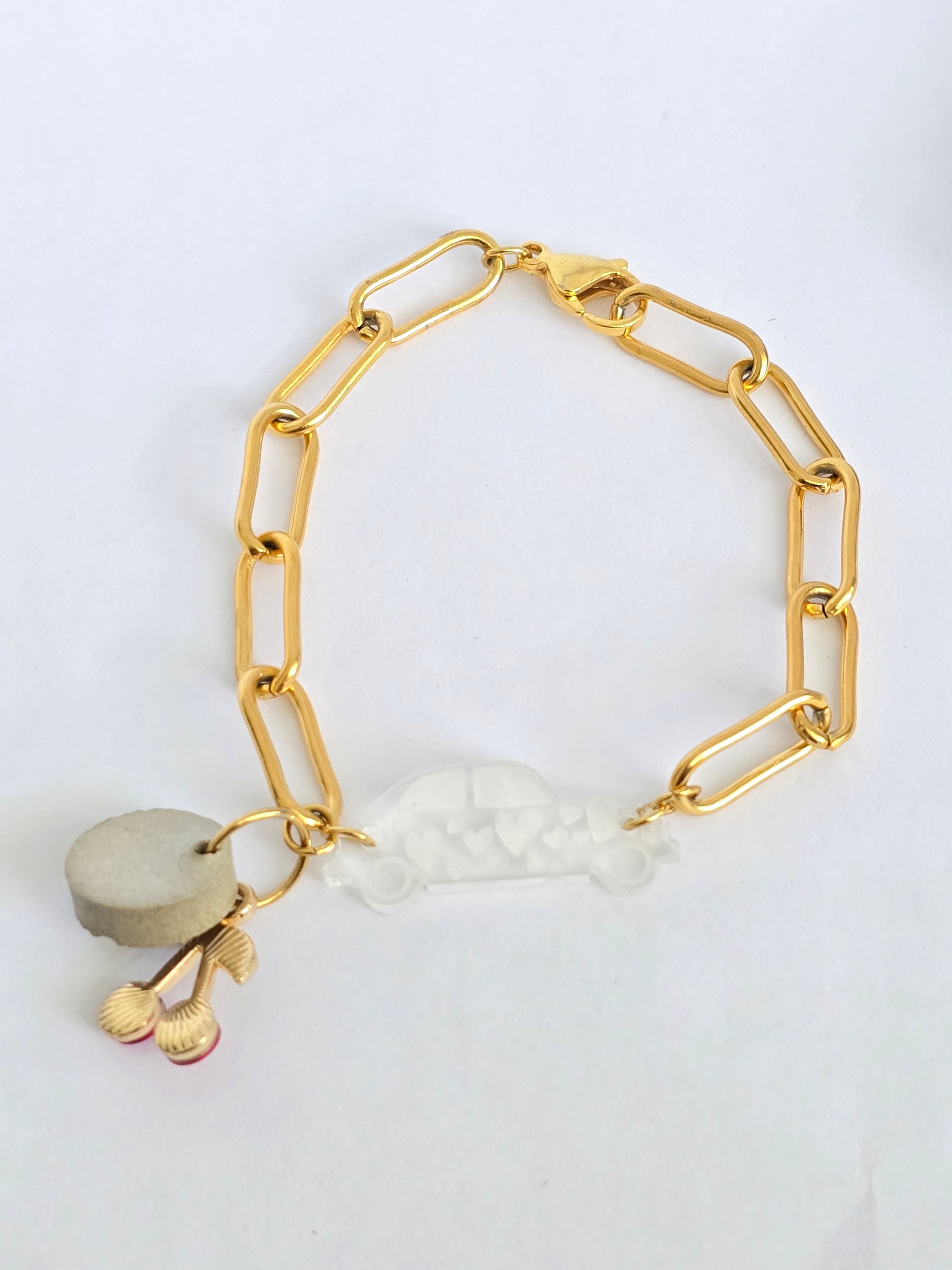 Pulsera con cadena en tono dorado, moderna y llamativa. Al centro, un conector en acrílico en forma de un Volky (Volkswagen clásico) que aporta un toque retro y divertido. Acompañado de un mini charm en cemento, hecho a mano, que equilibra el diseño con un detalle artesanal.