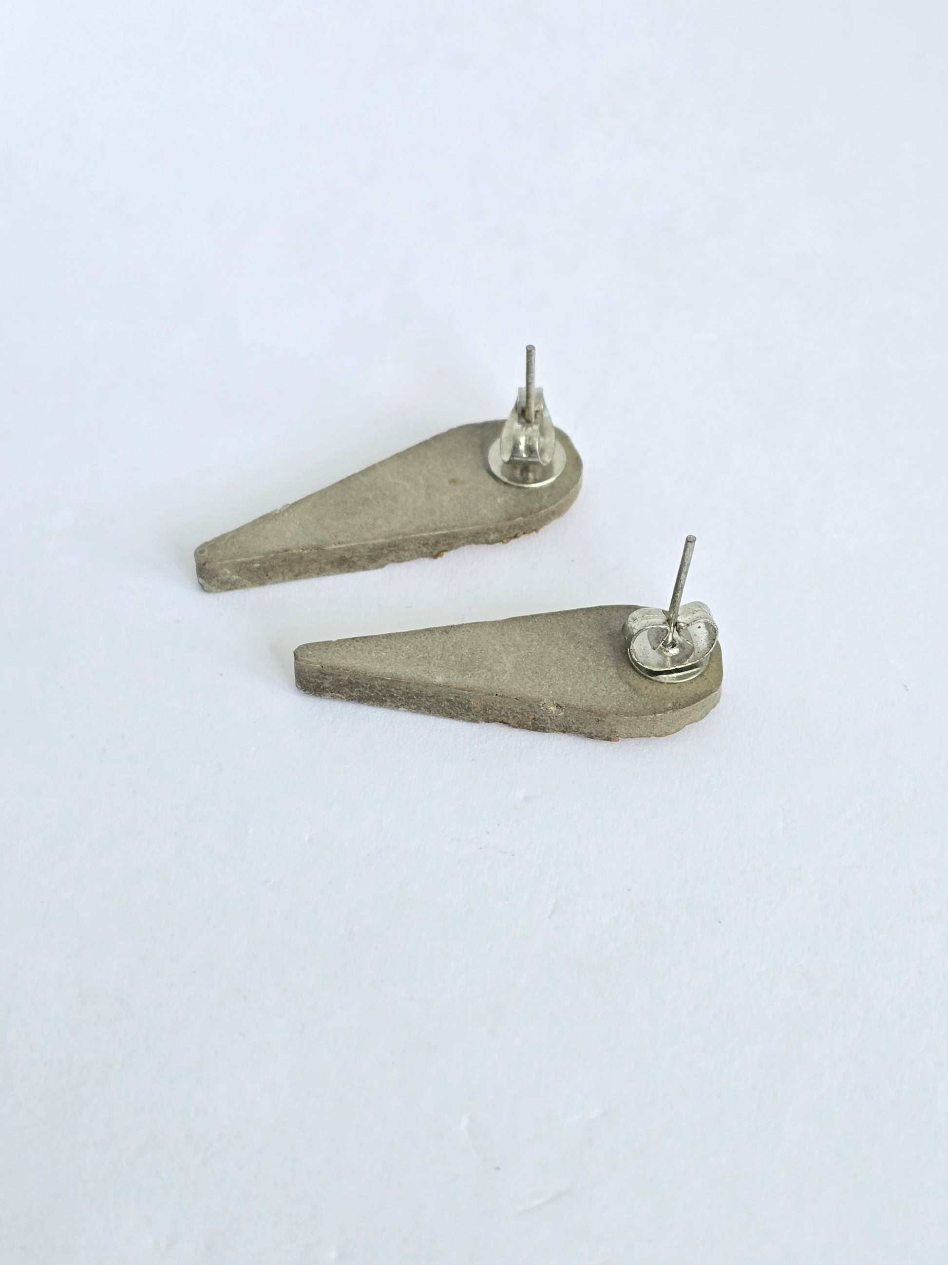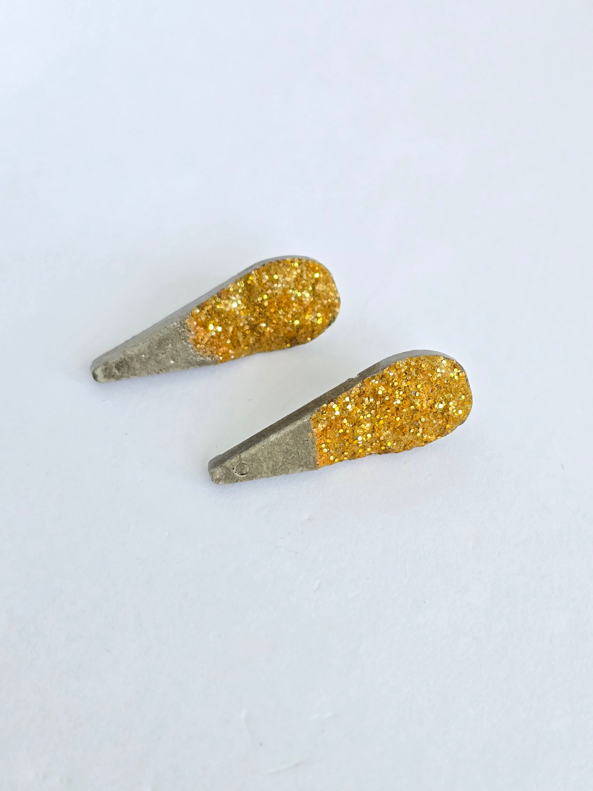 Pantallas pequeñas en forma de gota, hechas en cemento con destellos dorados incrustados. Elegantes, ligeras y con parte trasera en acero inoxidable. Perfectas para un toque delicado de brillo en cualquier ocasión.