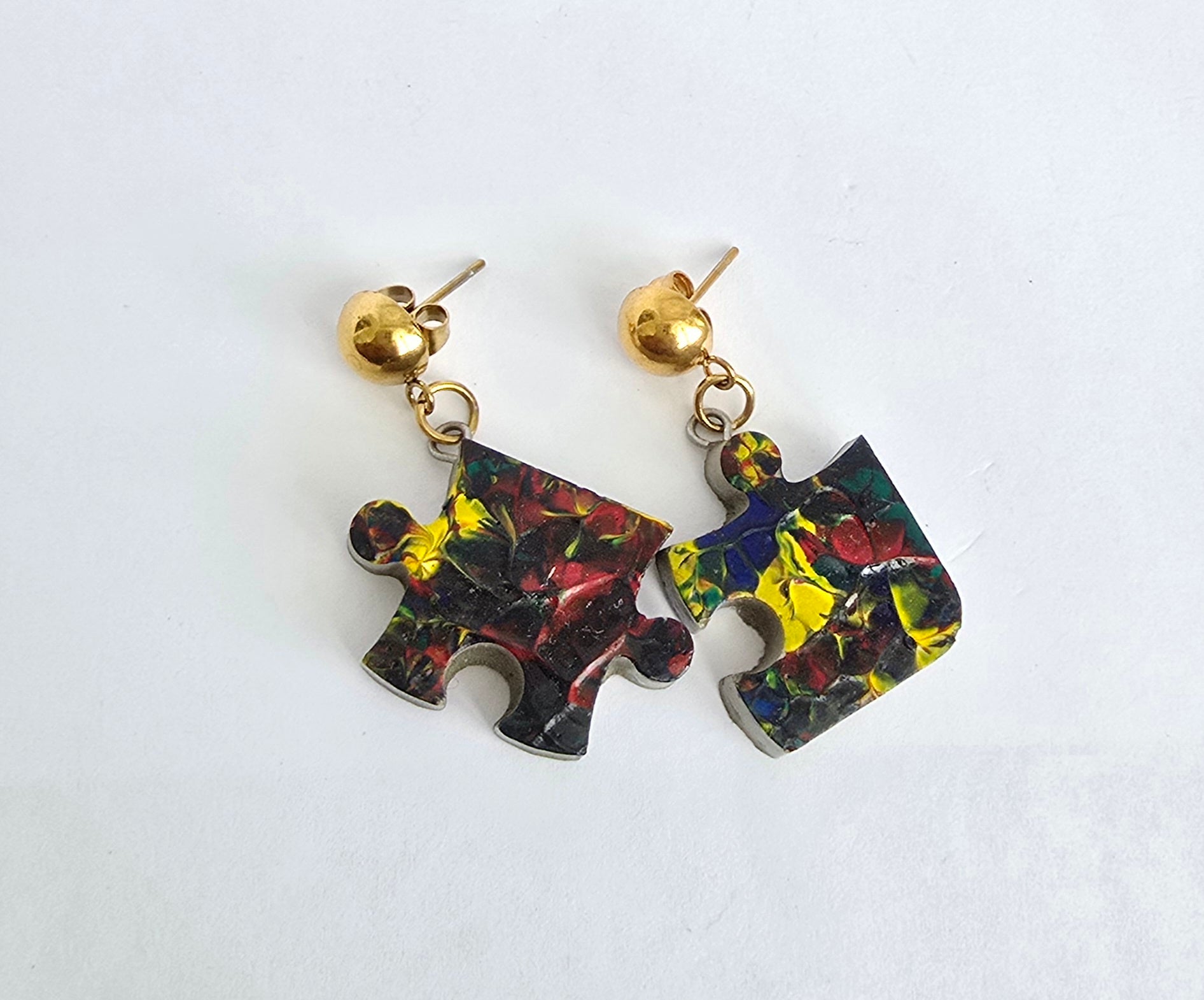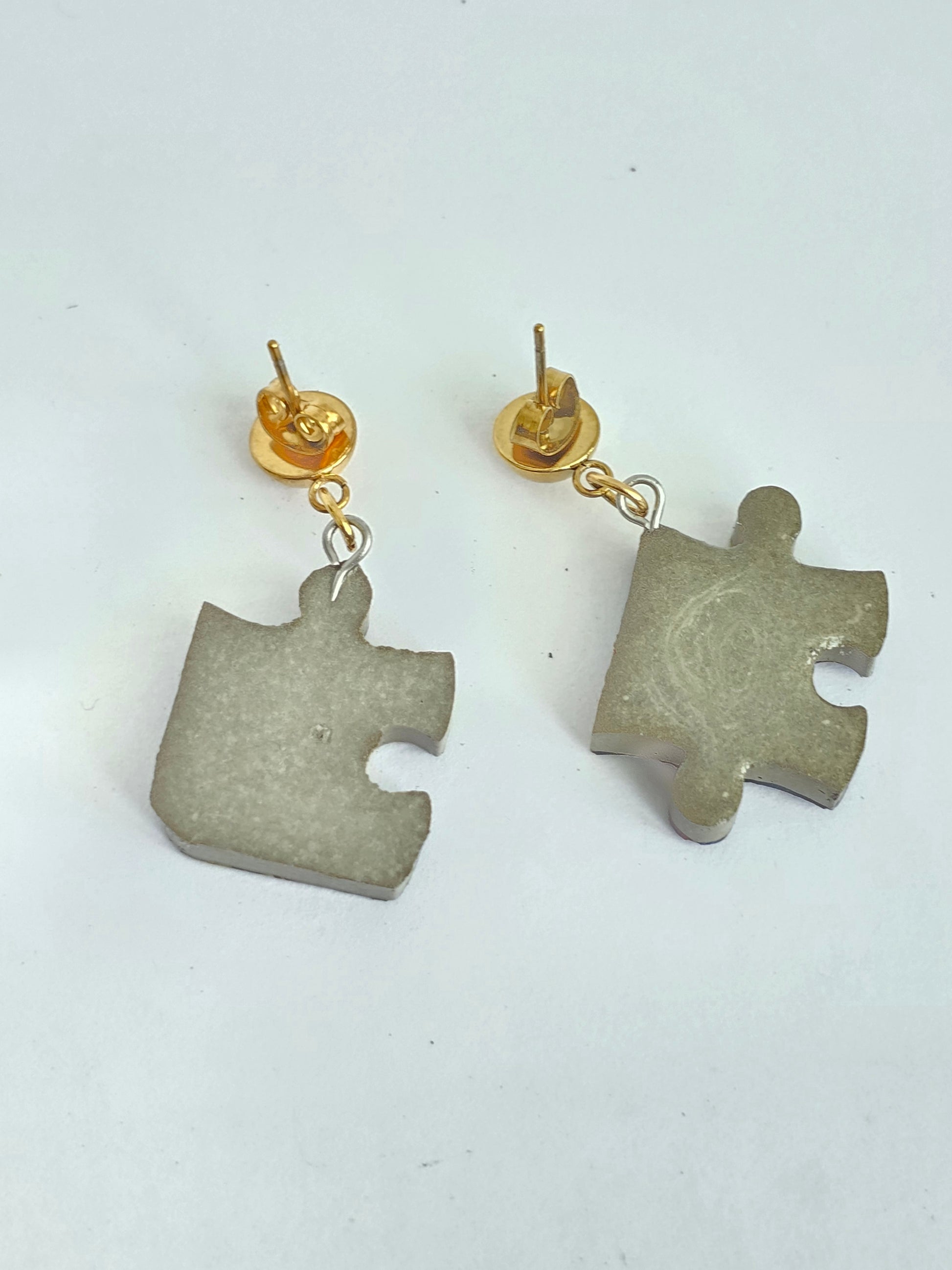 Minimalistas y llenas de intención, estas pantallas en forma de pieza de rompecabezas están hechas en cemento y pintadas a mano con delicadeza. Representan conexión, amor propio o esa pieza especial que completa tu historia. Cuelgan de ganchos en forma de bolita dorada en acero inoxidable, ideales para pieles sensibles y para un uso cómodo todo el día. Su estilo pegadito las hace perfectas para cualquier ocasión, sutiles pero con mucho significado.