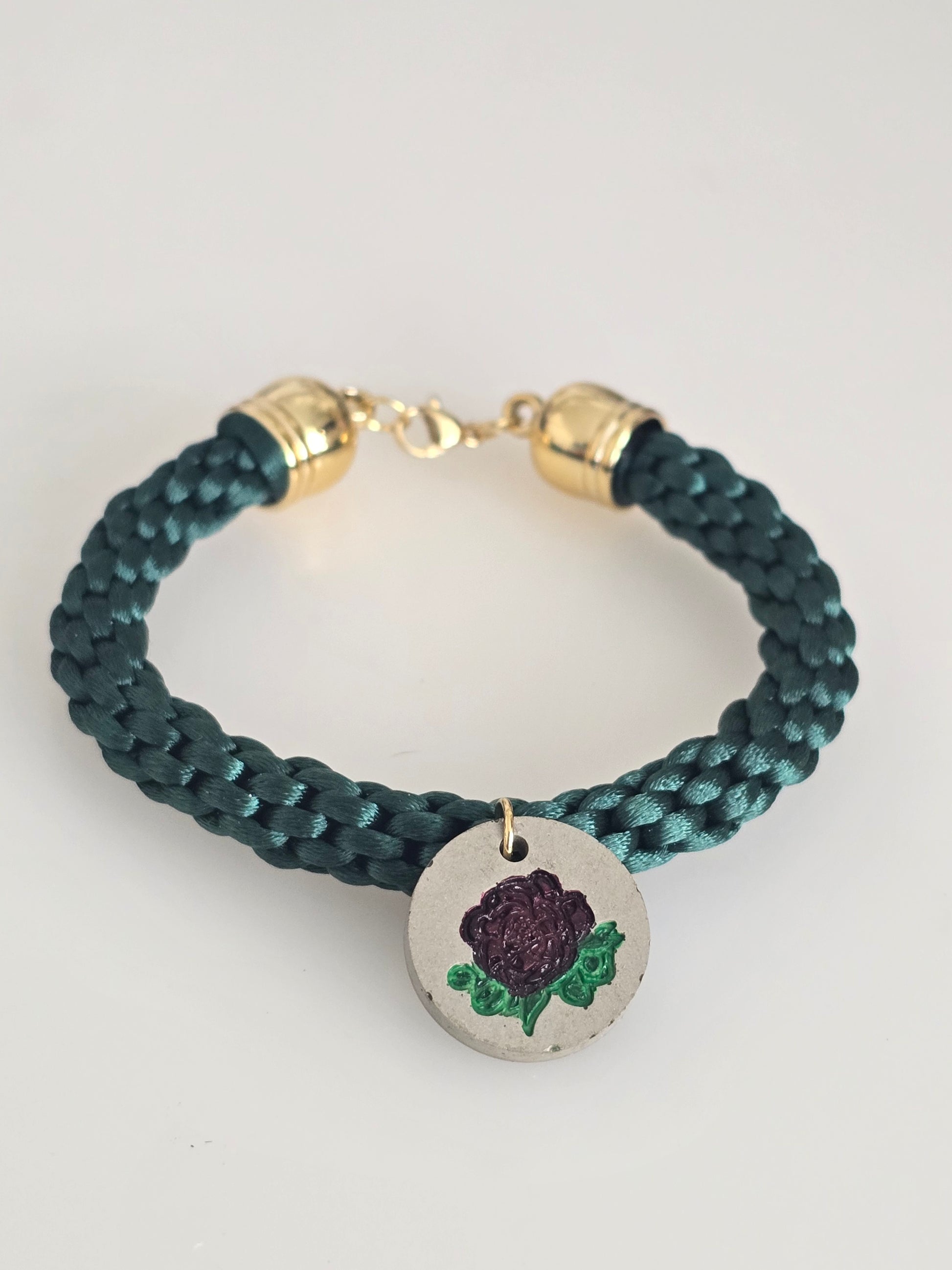 Esta pulsera combina arte y naturaleza en una pieza única. Hecha a mano en cemento y cuidadosamente pintada, destaca una hermosa flor sobre una trenza verde. Su diseño artesanal representa la fuerza, la pasión y la belleza tropical del Caribe. Material: Cemento, hilo trenzado y herrajes dorados plásticos.