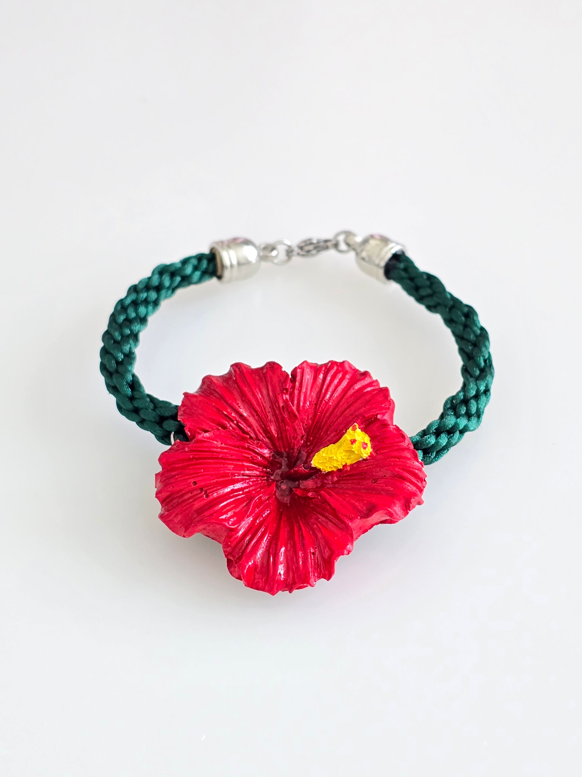Su trenza en tonos verdes simboliza la frescura y vida, mientras que el dije de cemento pintado con una amapola roja le da un toque vibrante y distintivo. Cada detalle está creado cuidadosamente para reflejar la esencia de Cementix: piezas únicas, llenas de color, textura y significado. Materiales: hilo satinado, cemento y plástico plata.