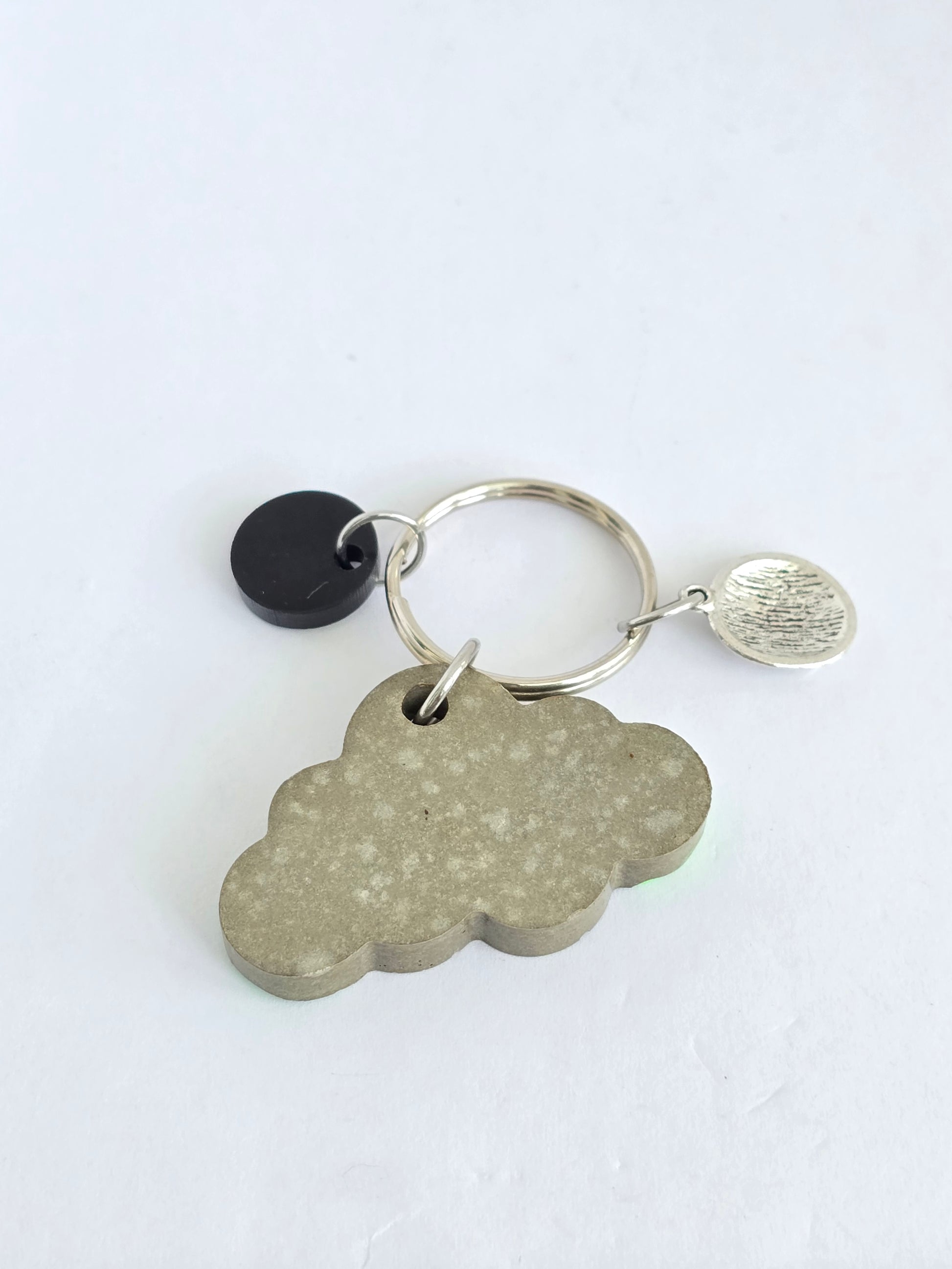 Llavero con una nube hecha en cemento, mezclada con polvo verde sensible a la luz UV que desaparece con el sol, revelando su textura natural. Incluye dos charms decorativos que completan este diseño único y lleno de personalidad. Una pieza funcional, artística y mágica.