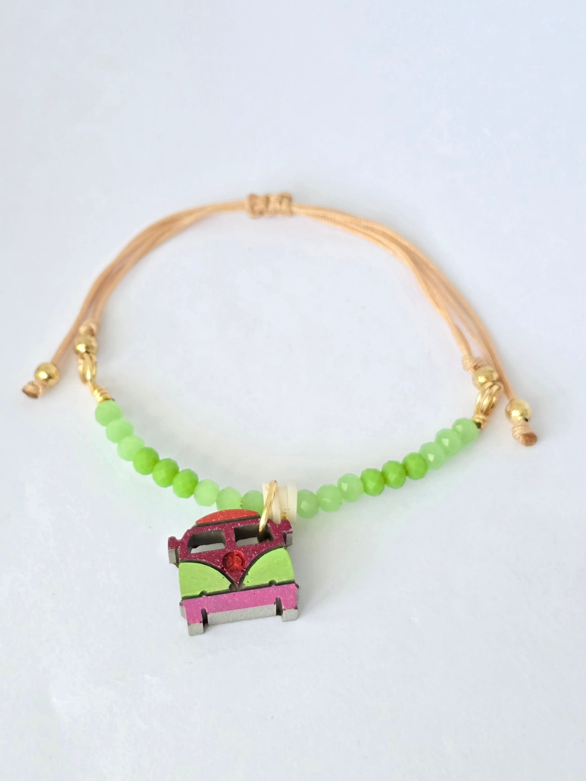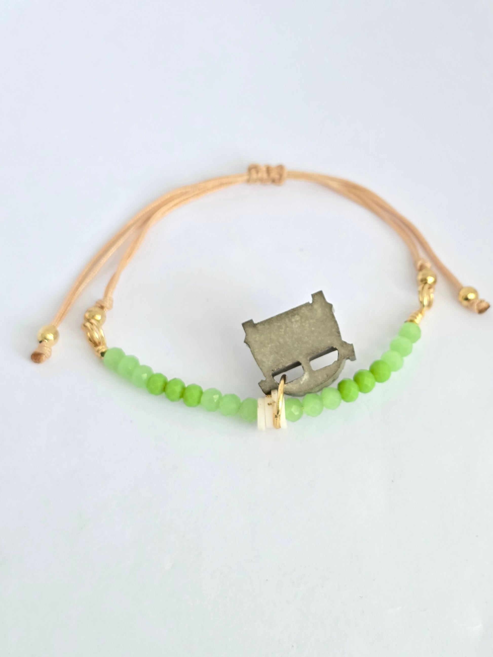 Pulsera ajustable, mitad en hilo y mitad con piedras verdes que aportan frescura y estilo natural. El detalle central es un charm en cemento en forma de Volky, hecho a mano, que añade un toque creativo y nostálgico al diseño.