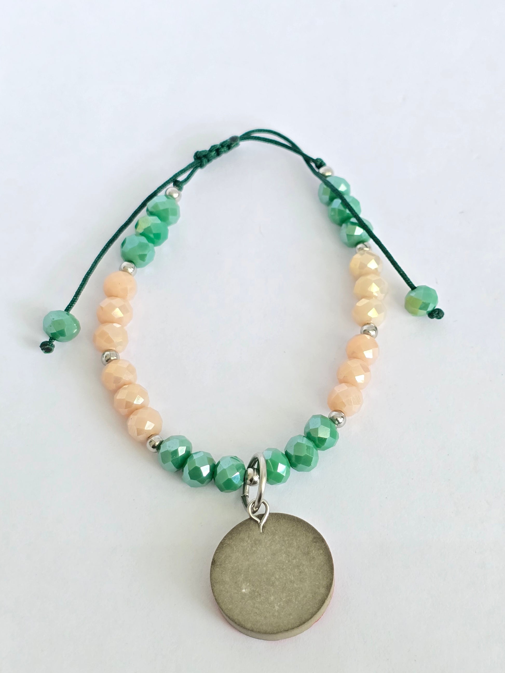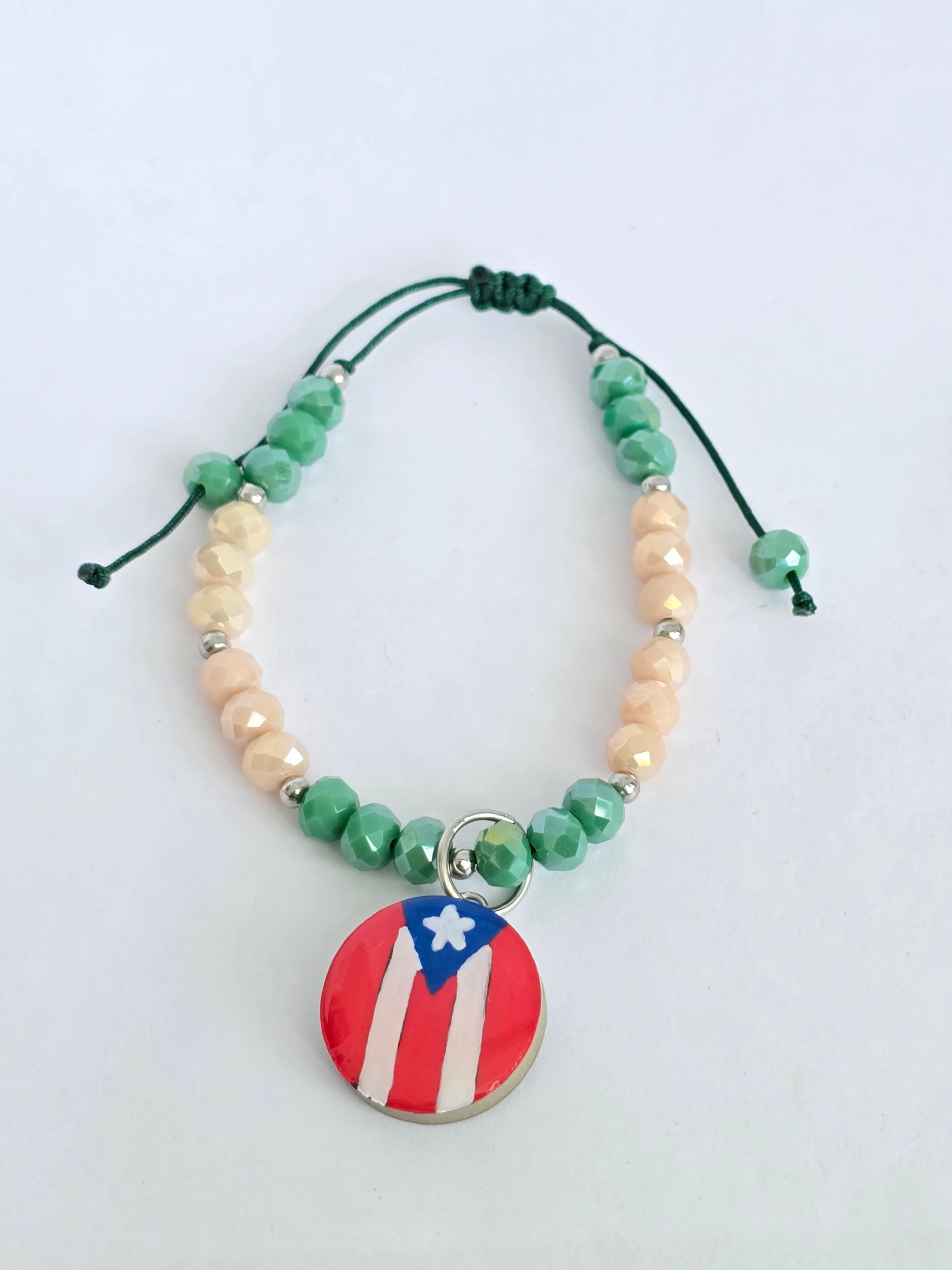 Pulsera confeccionada con cristales en dos tonos verde y crema que aportan brillo y frescura al diseño. El detalle central es un charm en cemento con la bandera de Puerto Rico pintada a mano, que añade un toque patriótico y artesanal.Terminales en acero inoxidable, ideales para el uso diario.