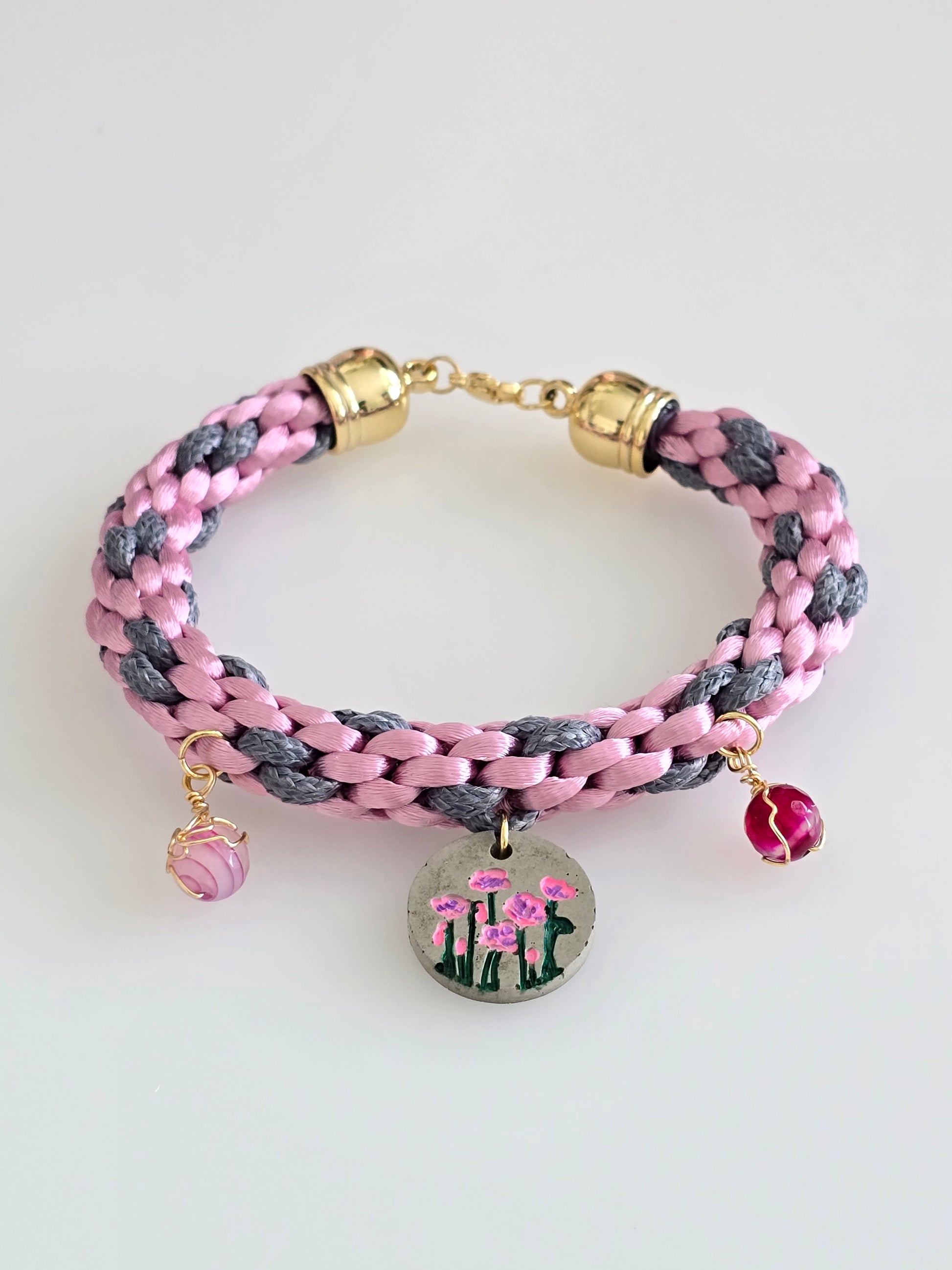 Su trenza combina tonos rosa y gris, acompañada por un dije de cemento pintado a mano y cuentas decorativas que añaden un toque delicado y único.