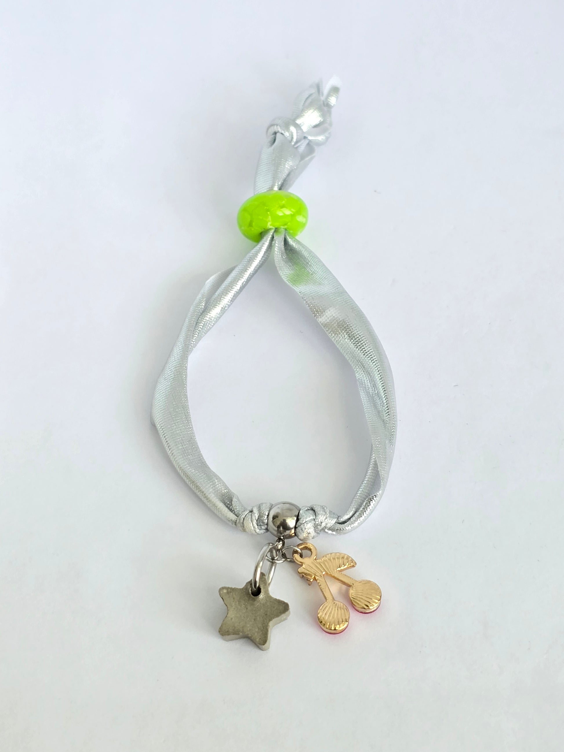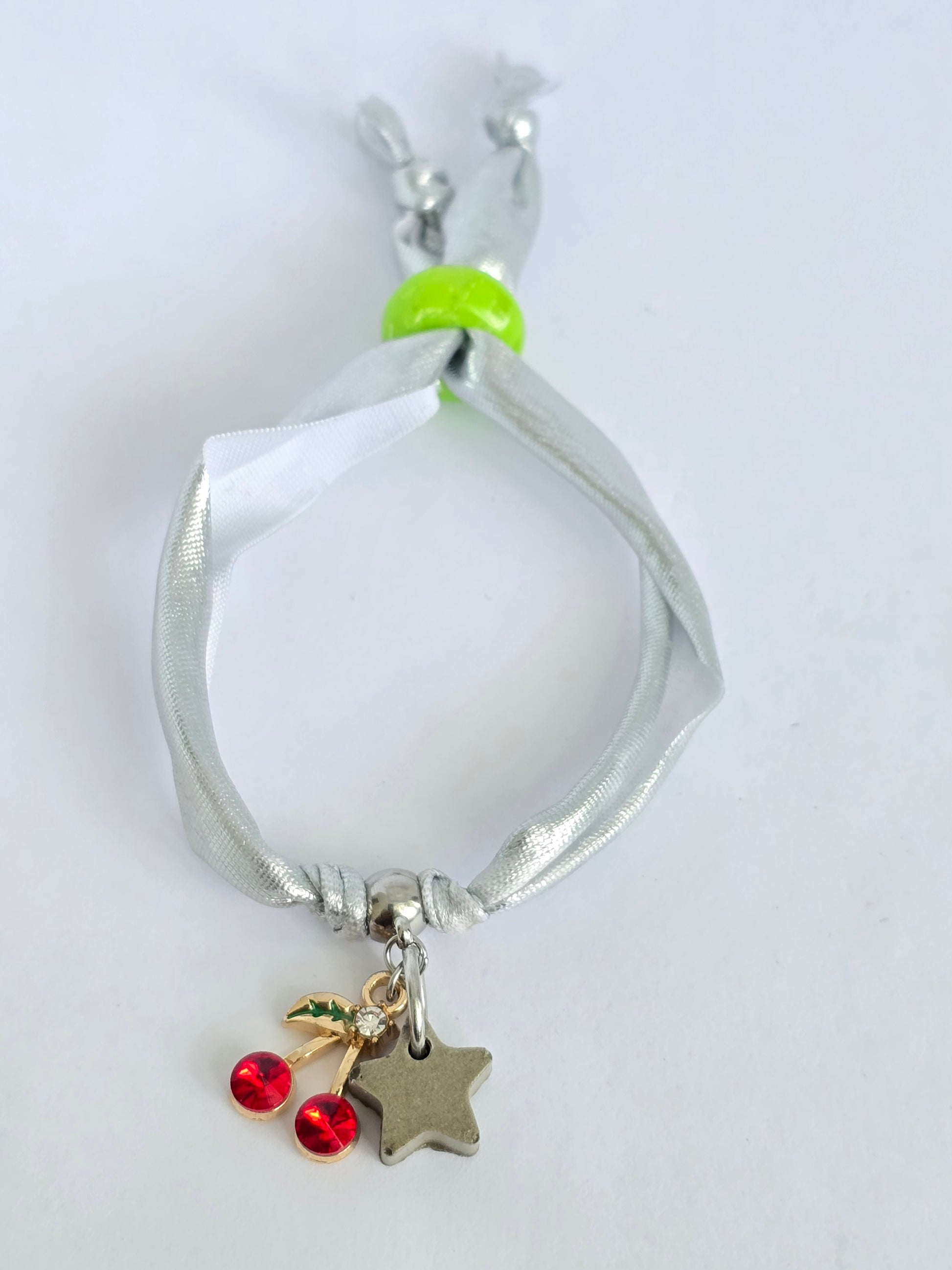 Pulsera ajustable en hilo plateado, con un estilo moderno y delicado. Incluye un mini charm en forma de estrella en cemento al natural, que resalta por su simplicidad y textura rústica. Acompañada de un charm dorado en forma de cherry, que añade un contraste divertido y coqueto.