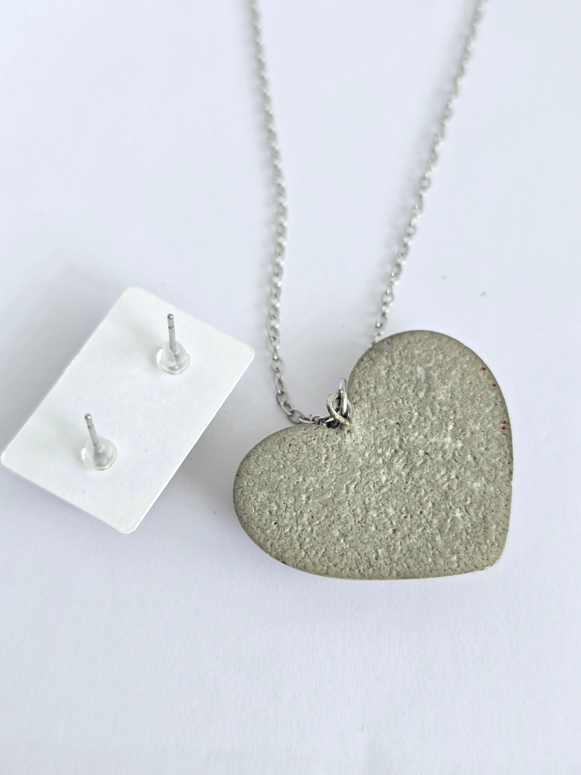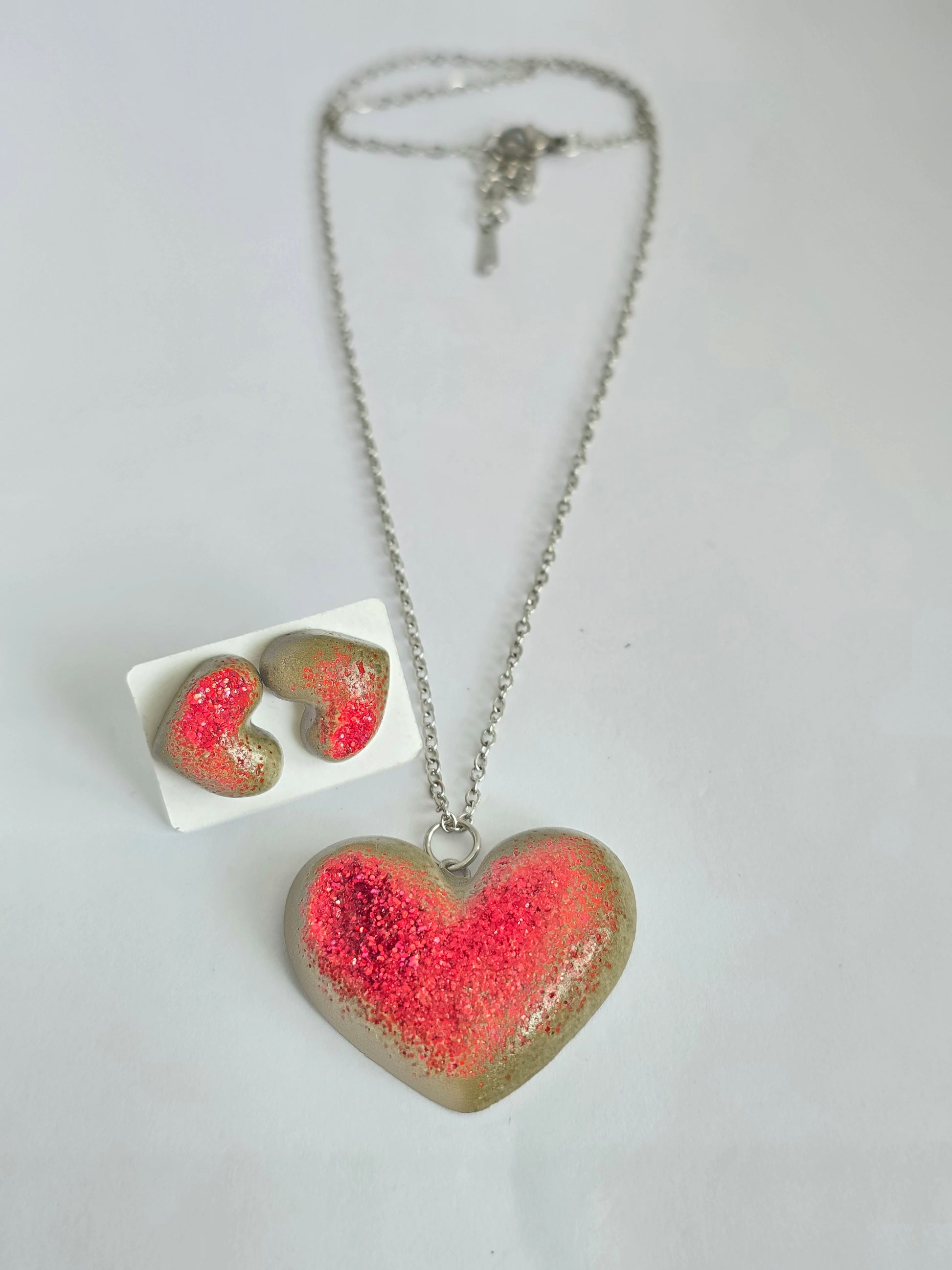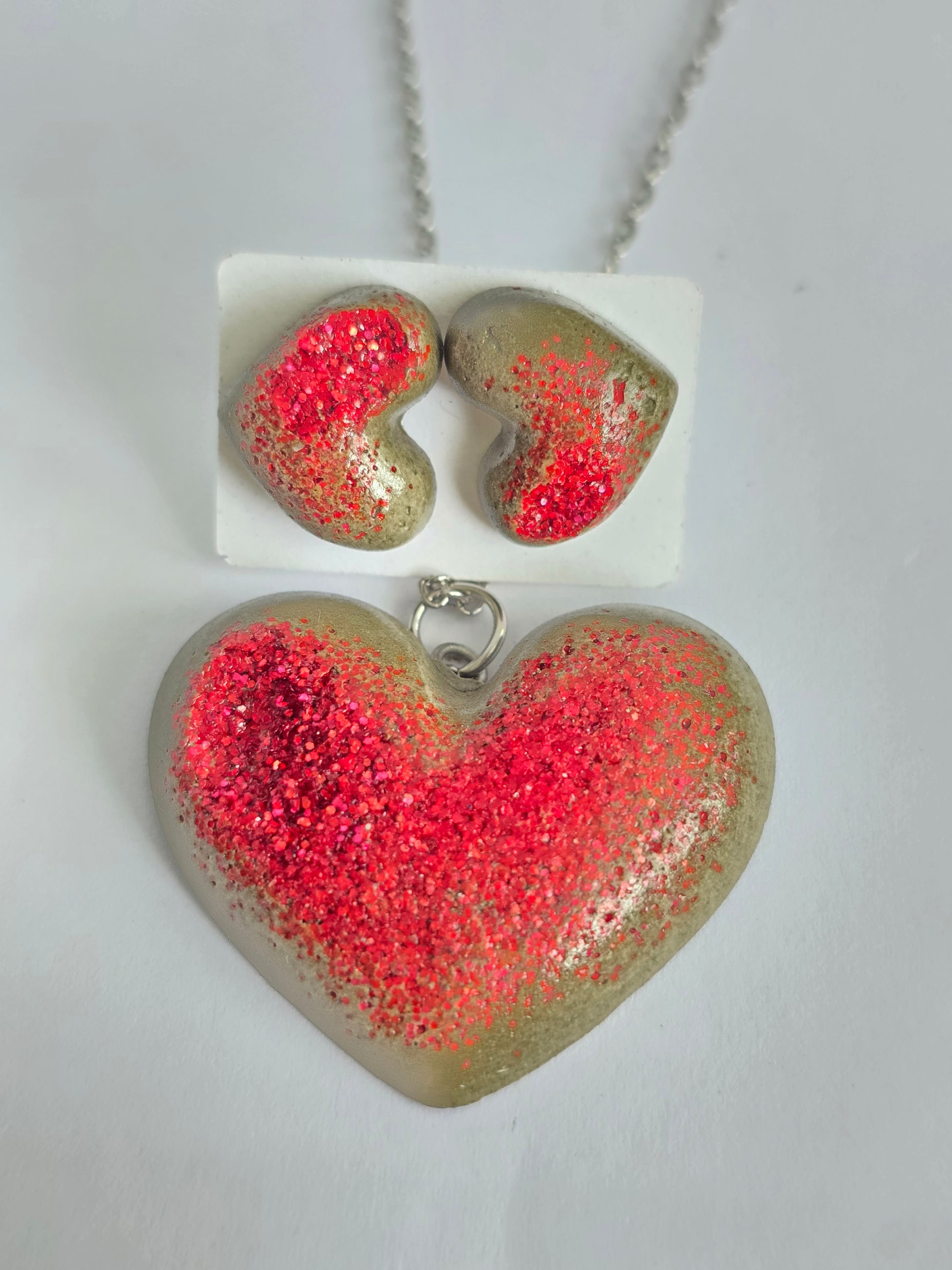 Set de collar y pantallas tipo studs en acero inoxidable. El colgante en forma de corazón está decorado con brillos incrustados en tono rojo, que le dan un toque vibrante, romántico y lleno de carácter. Ideal para regalar o complementar cualquier look con un detalle especial.