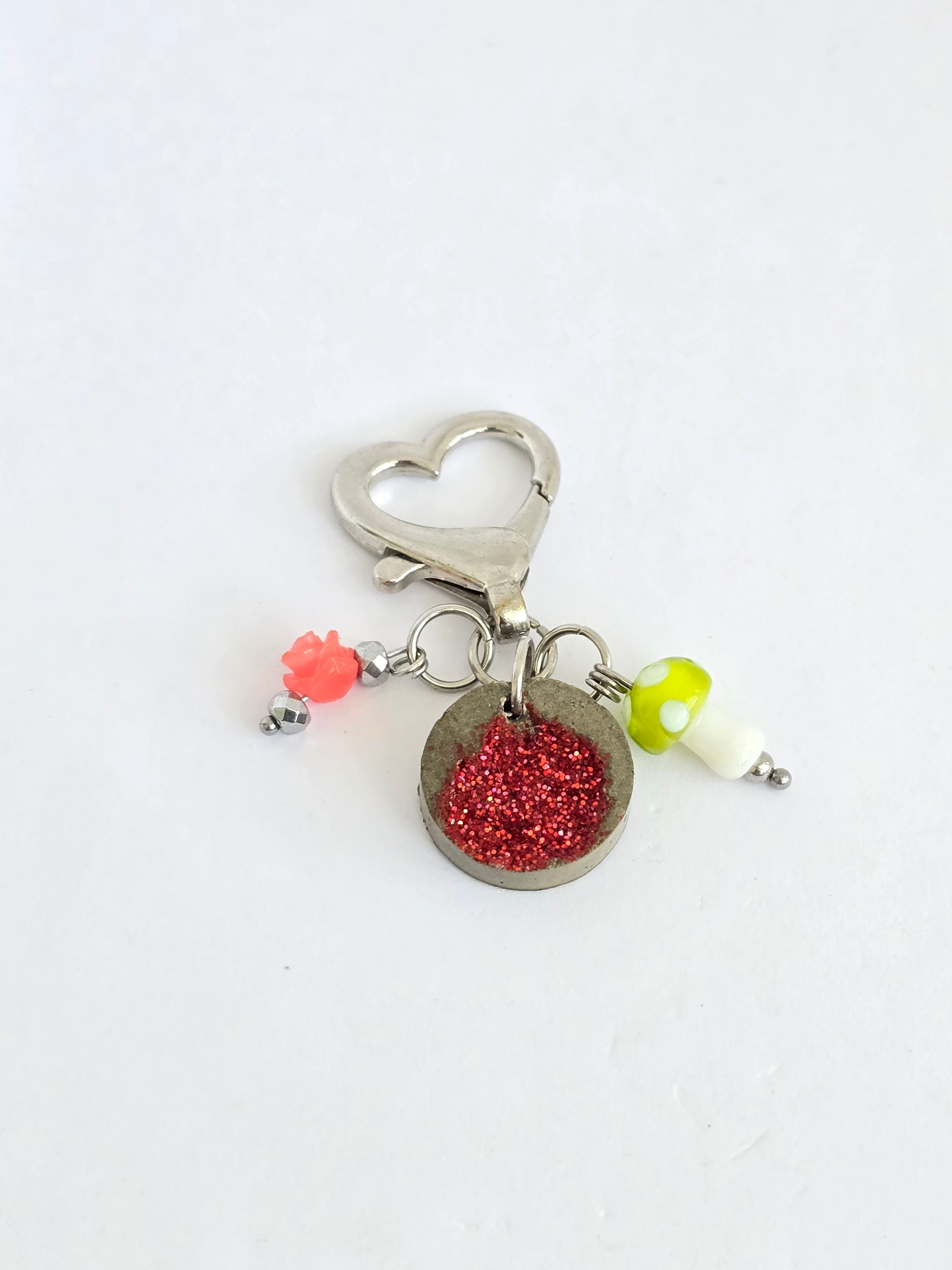 Llavero pequeño con un círculo de cemento con brillo rojo, acompañado por un hongo en cerámica y una rosa en acrílico. Una pieza compacta pero llena de detalles encantadores que reflejan fantasía y color.