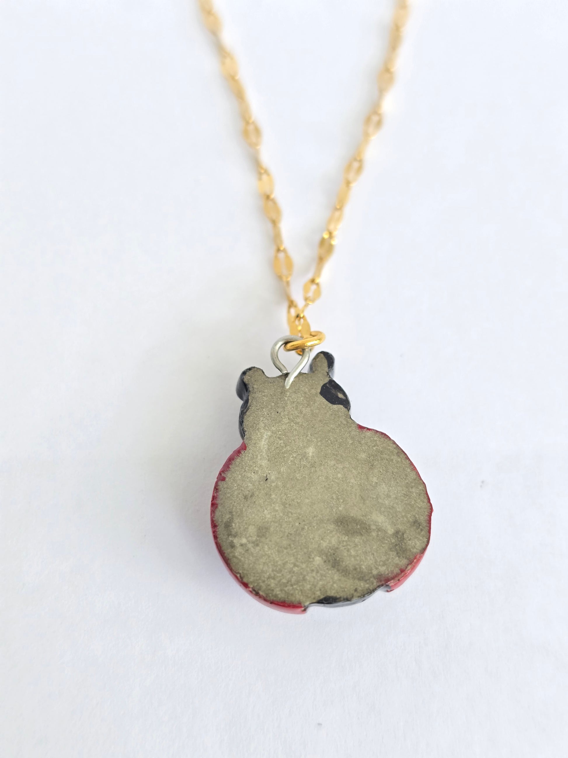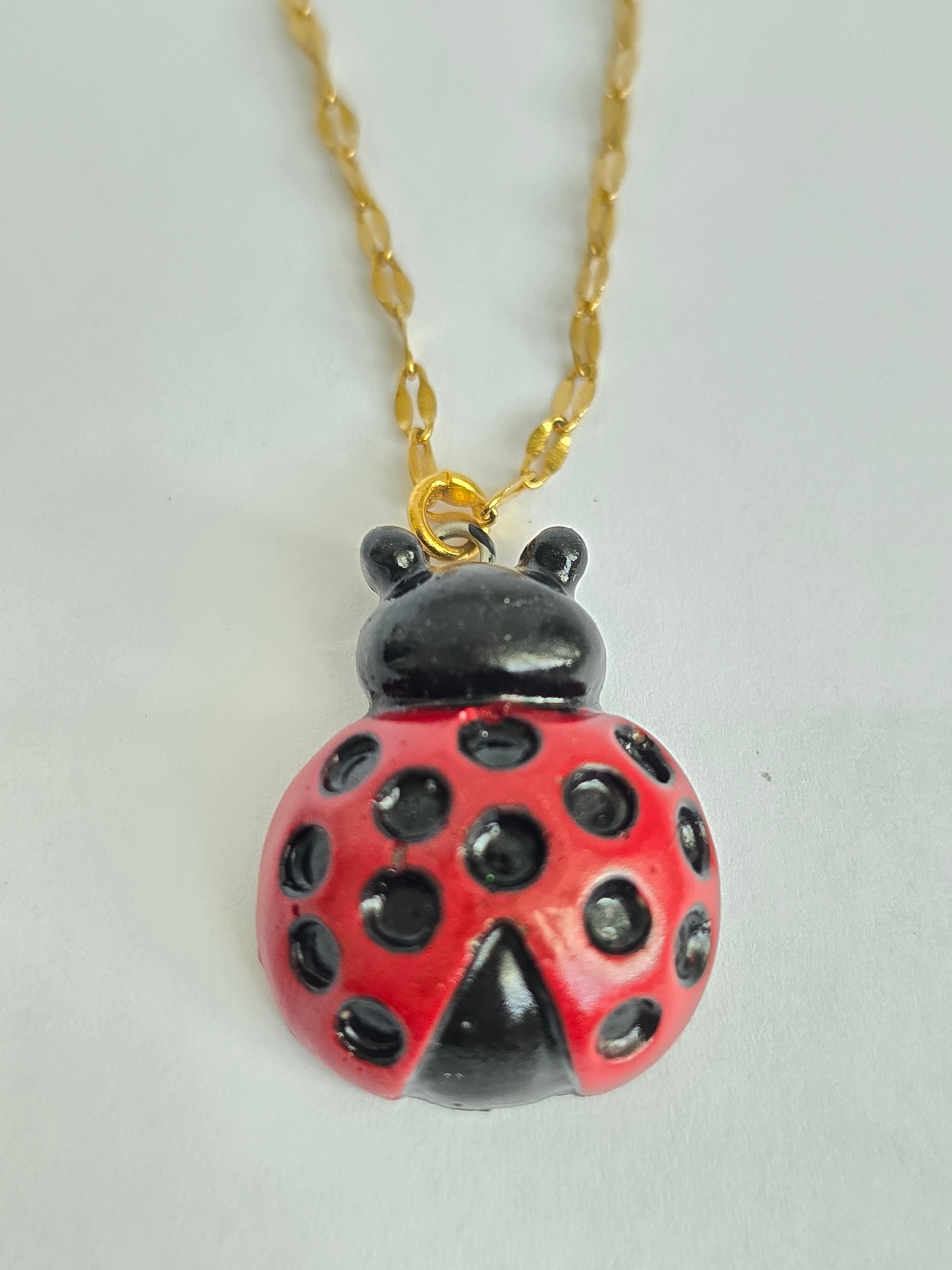 Colgante en forma de mariquita (ladybug) hecho en cemento y pintado a mano con detalles vibrantes. Cadena en acero inoxidable, resistente y cómoda para el uso diario. Una joya artesanal que simboliza buena suerte y alegría, ideal para quienes aman los pequeños tesoros de la naturaleza.