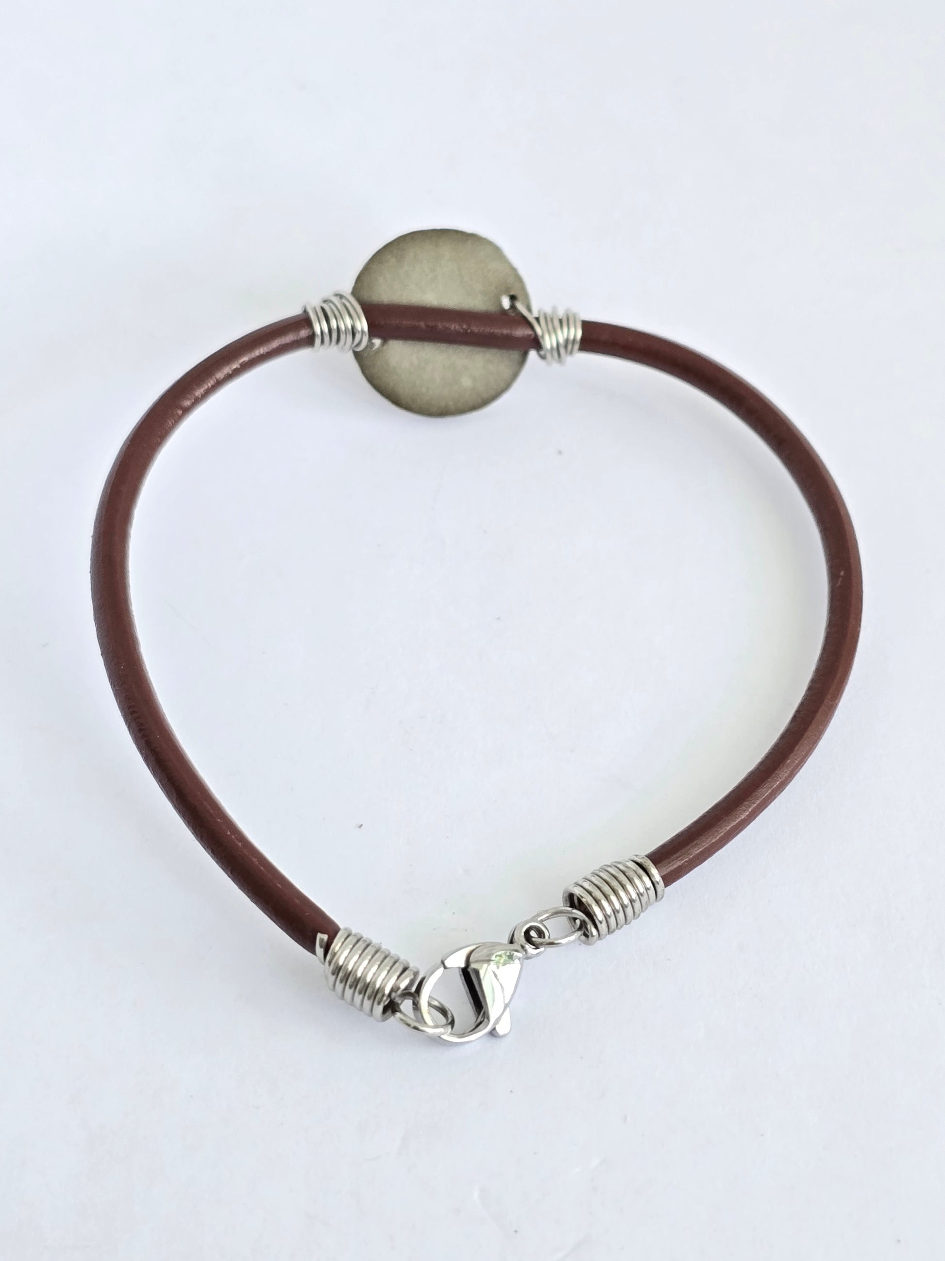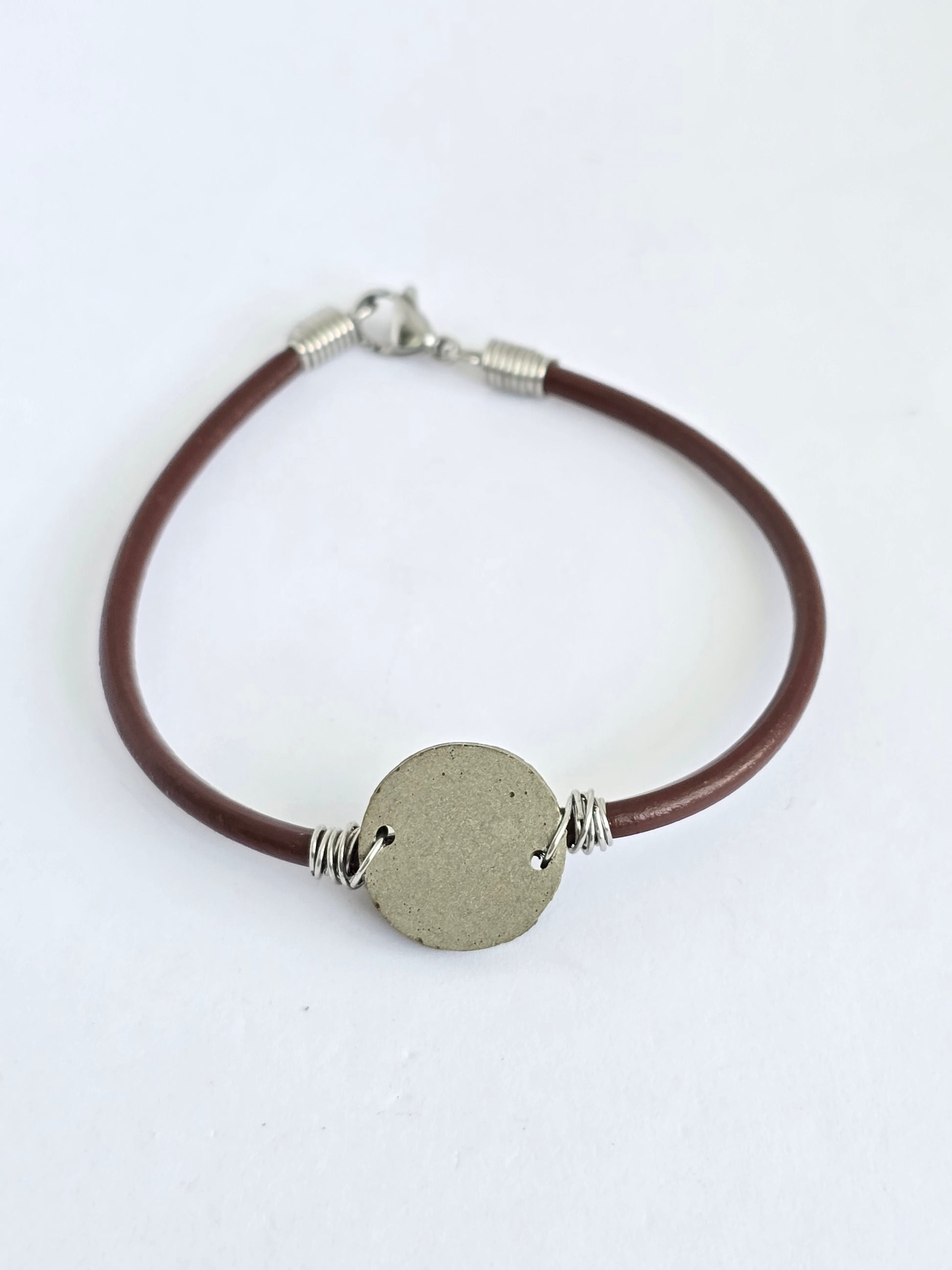 Elegante y con carácter. Hecha con cuero genuino, terminaciones en acero inoxidable y una chapa de cemento al natural alambrada directamente sobre la pieza. Un diseño artesanal que combina fuerza y estilo en perfecta armonía.