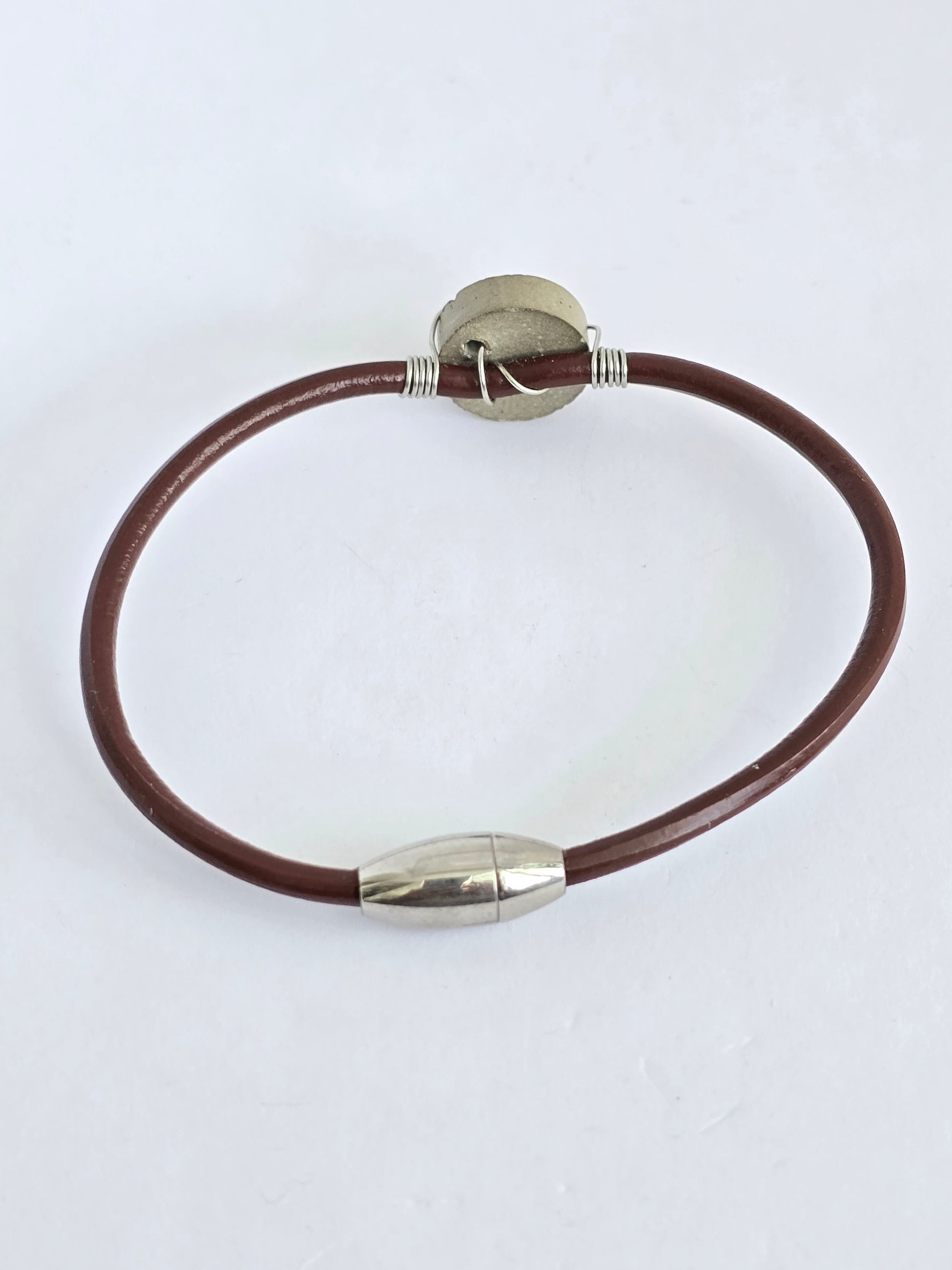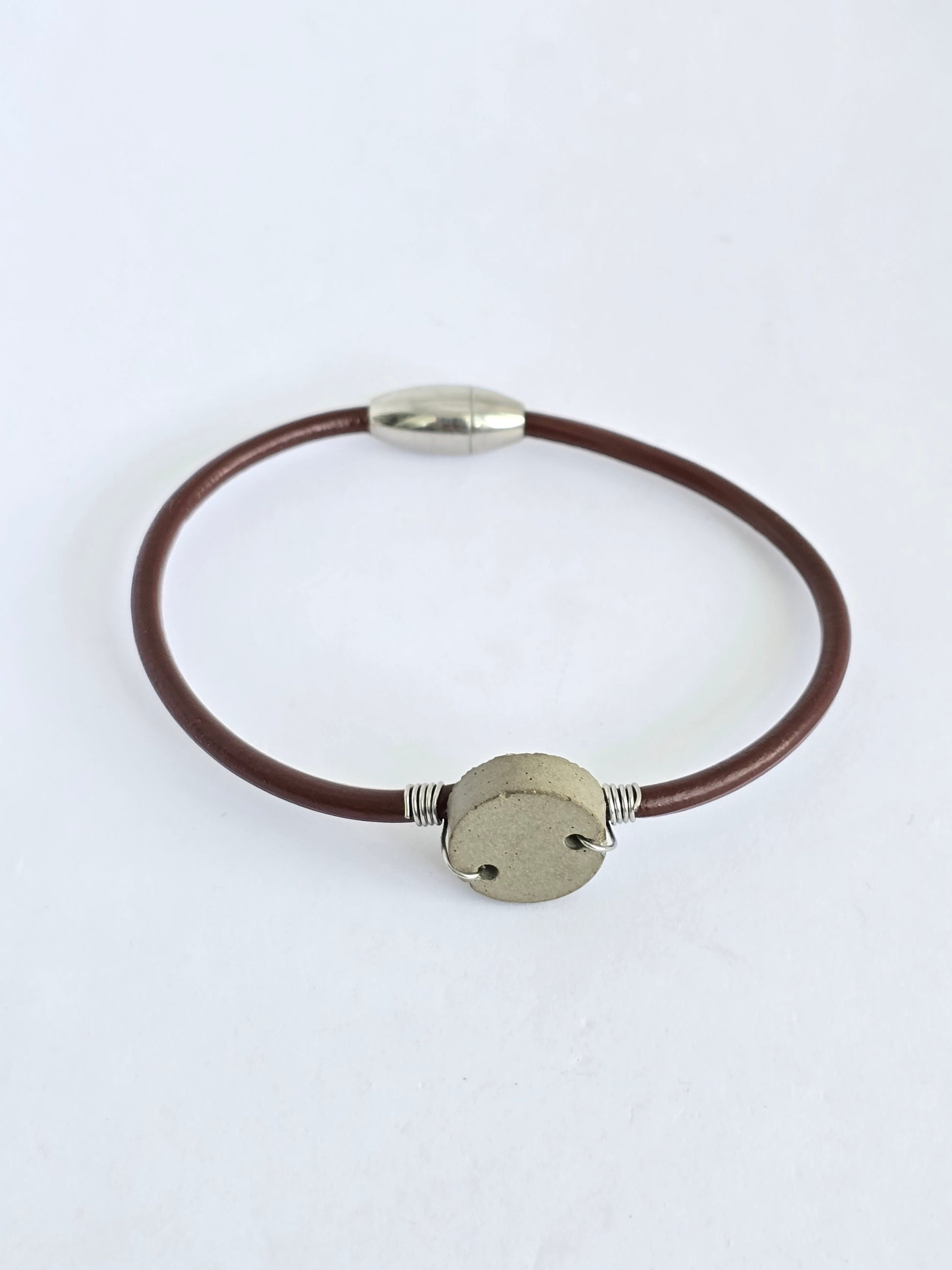 Hecha con cuero genuino y cierre magnético para mayor comodidad. Lleva una chapa de cemento al natural alambrada directamente sobre el cuero. Una pieza artesanal con carácter, combinando materiales crudos con un diseño moderno.
