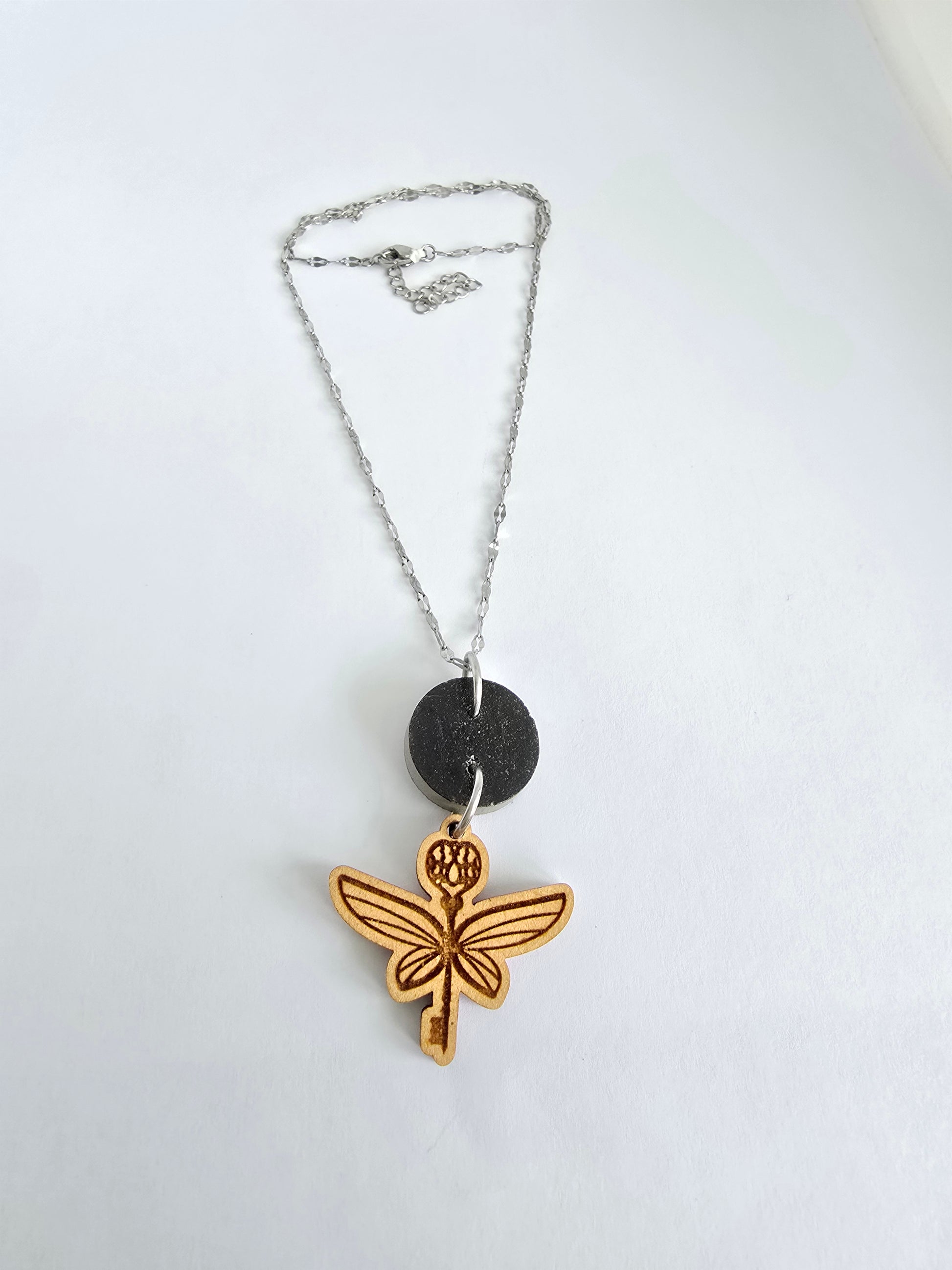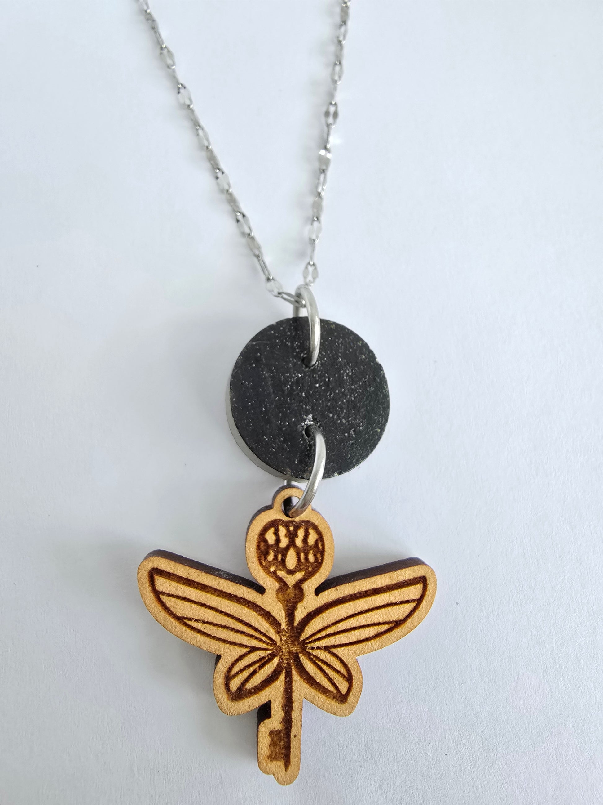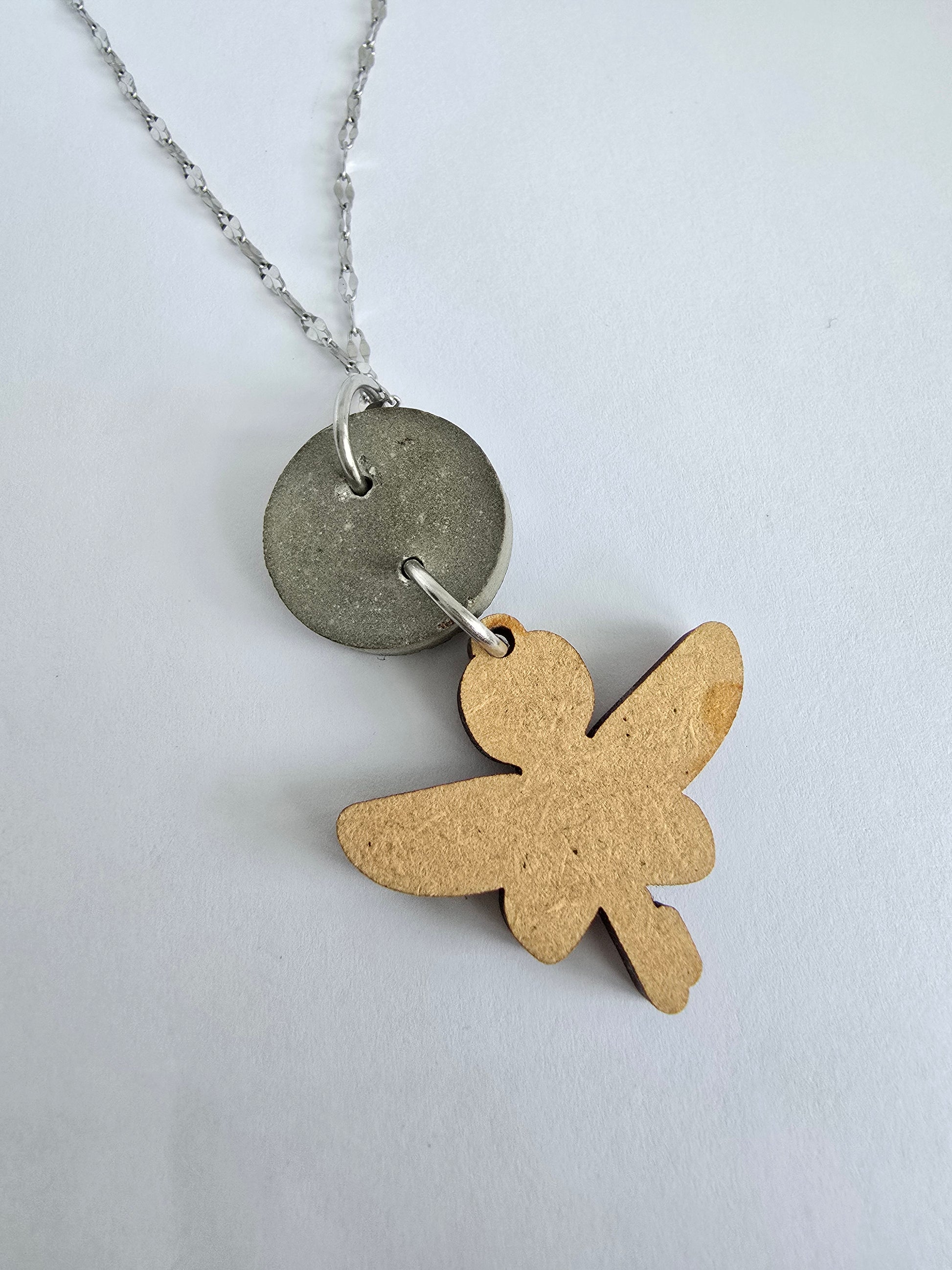 Conector en cemento pintado a mano en color negro, del cual cuelga una delicada libélula en madera. Una combinación única de materiales naturales con un toque artesanal. Cadena en acero inoxidable, perfecta para uso diario. Ideal para amantes de la naturaleza y los diseños con significado.