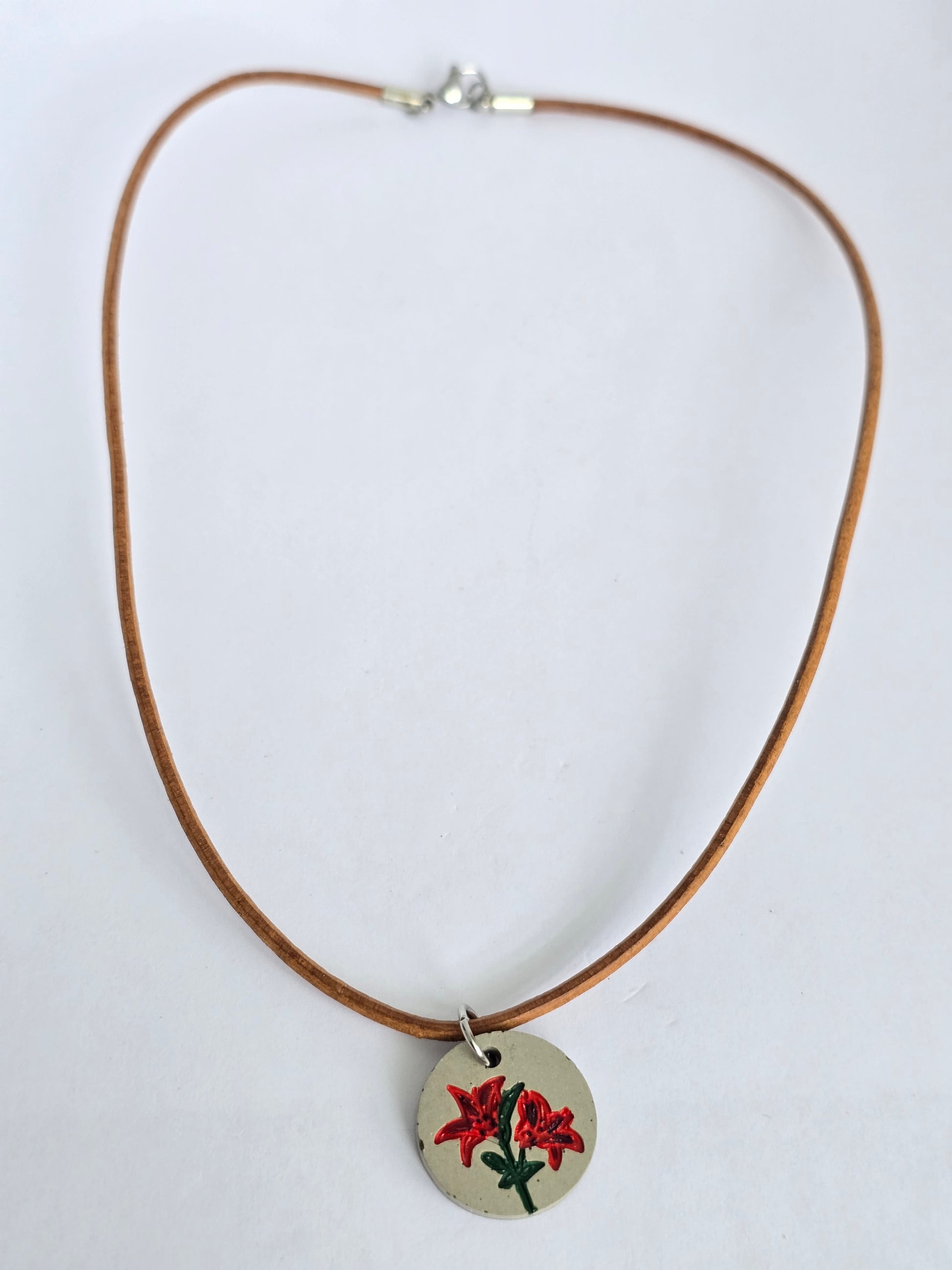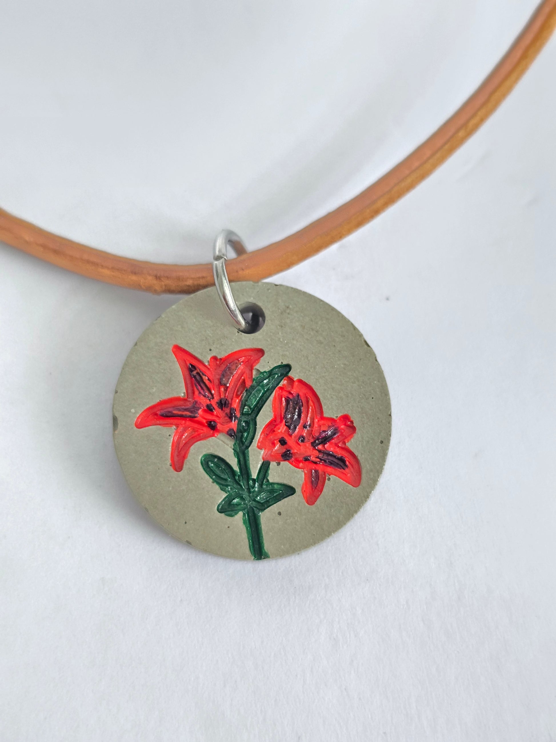 Collar en cuero genuino con un charm colgante de cemento, en el que se encuentra impregnada una flor de Lili natural pintada a mano. Una combinación de lo rústico y lo delicado, con un diseño artesanal que resalta la belleza de la naturaleza. Ideal para quienes buscan piezas únicas con esencia natural.