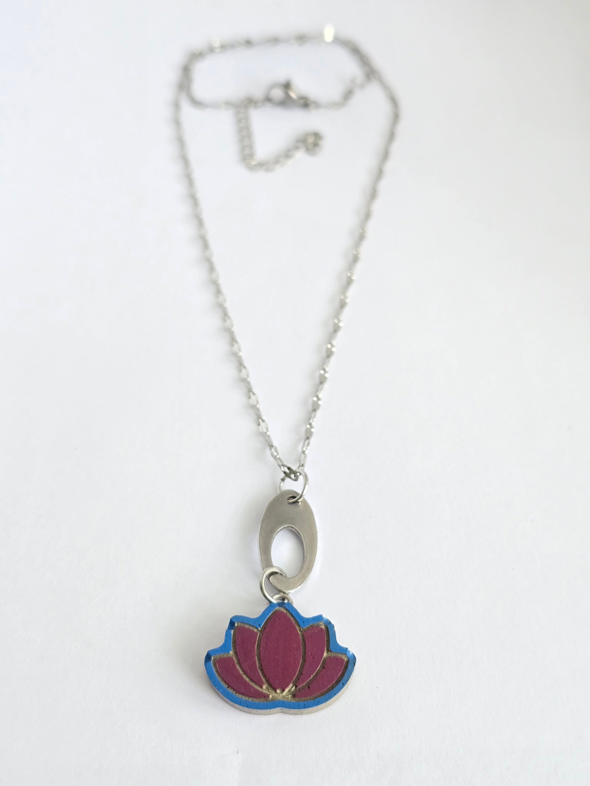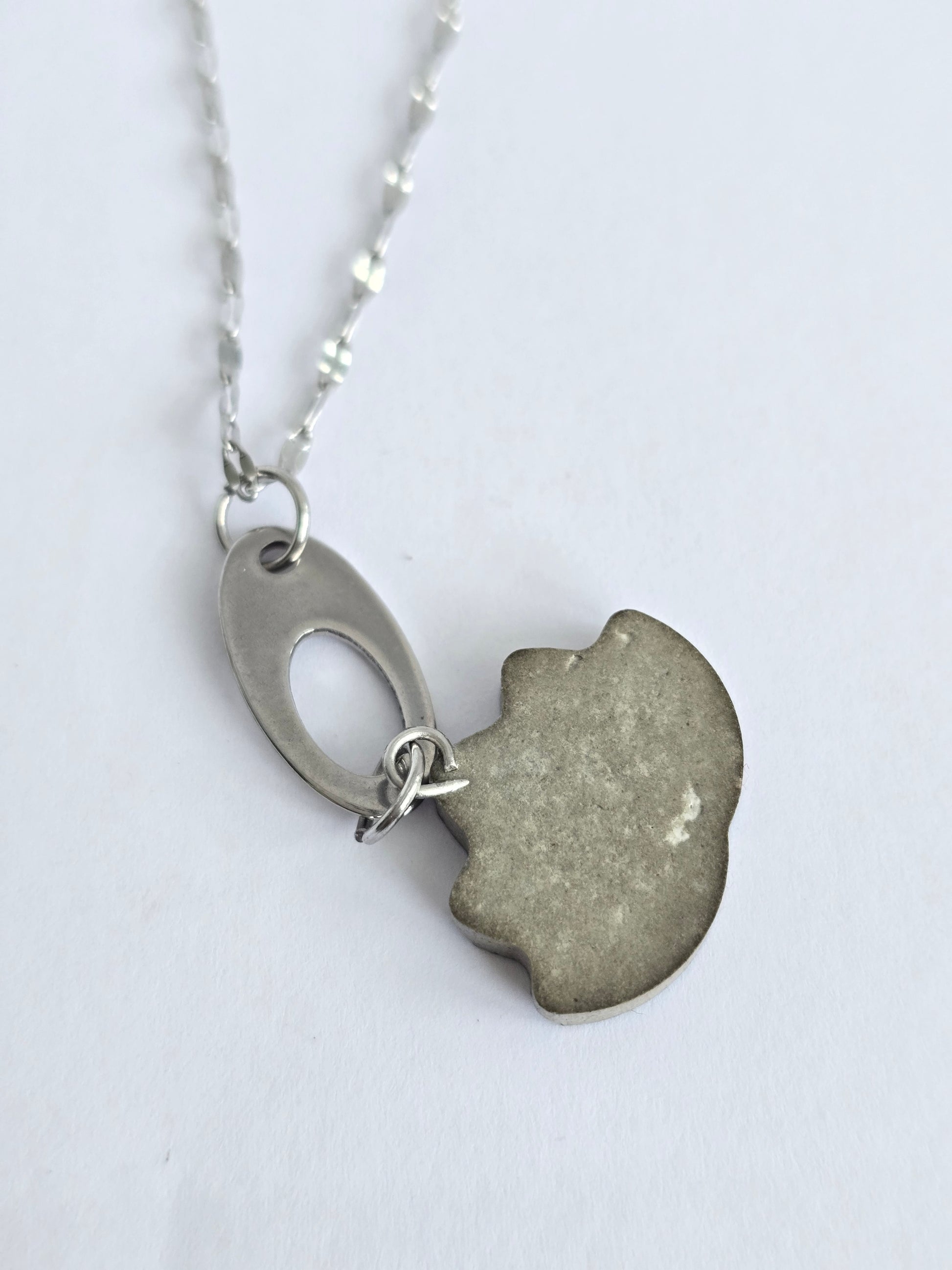 Un diseño minimalista con fuerza interior: detalle en stainless steel del cual cuelga una flor de loto hecha en cemento, simbolizando renacimiento, calma y belleza. Esta pieza combina lo rústico y lo refinado, ideal para quienes buscan equilibrio entre lo natural y lo moderno. Perfecta para usar a diario con intención y estilo.